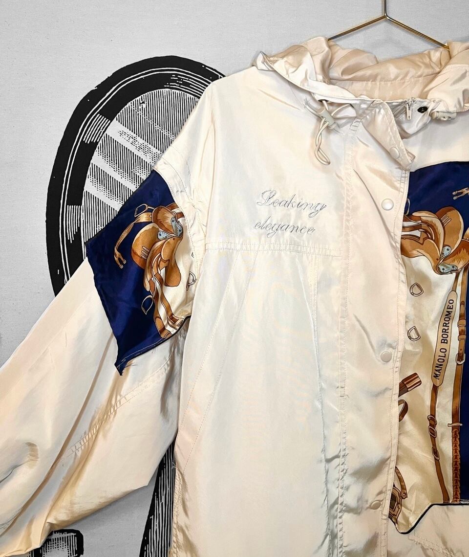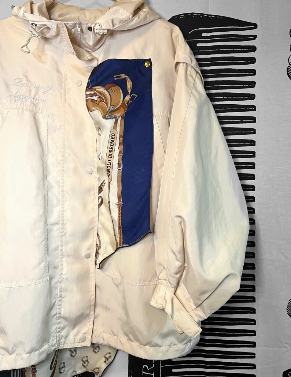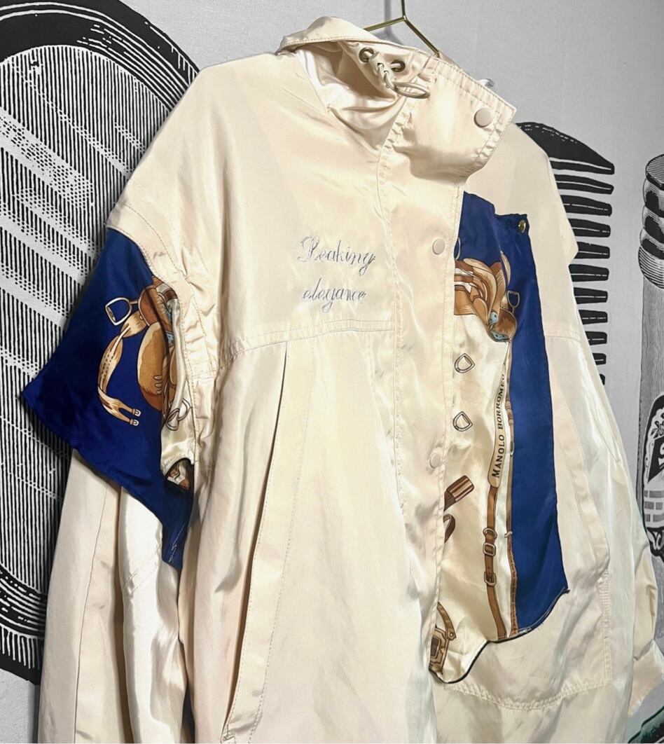 あらゆるところからスカーフが飛び出したデザインの個性的なジャンパーです。ご覧の通り、上品さが全身から漏れ出ています。
