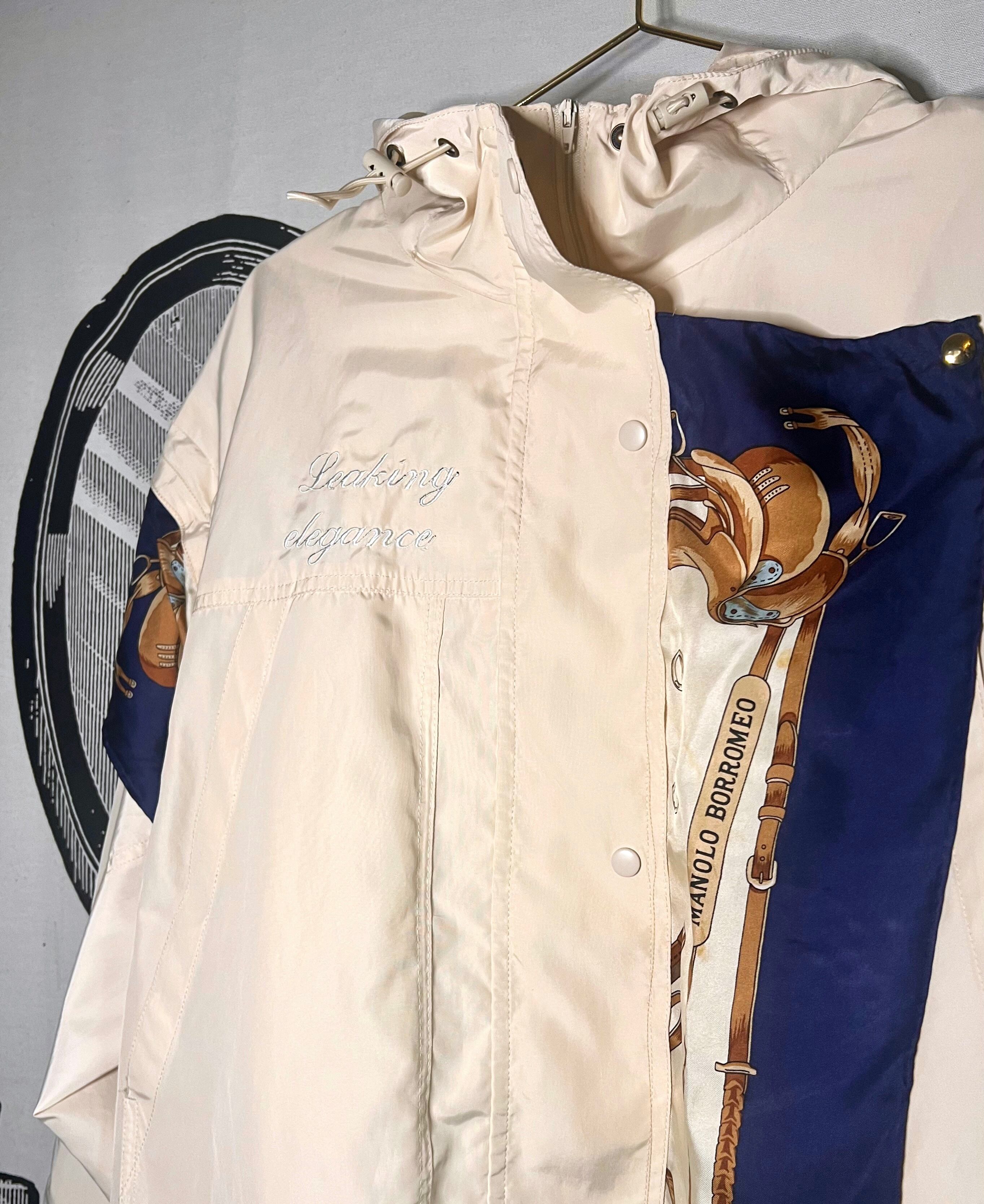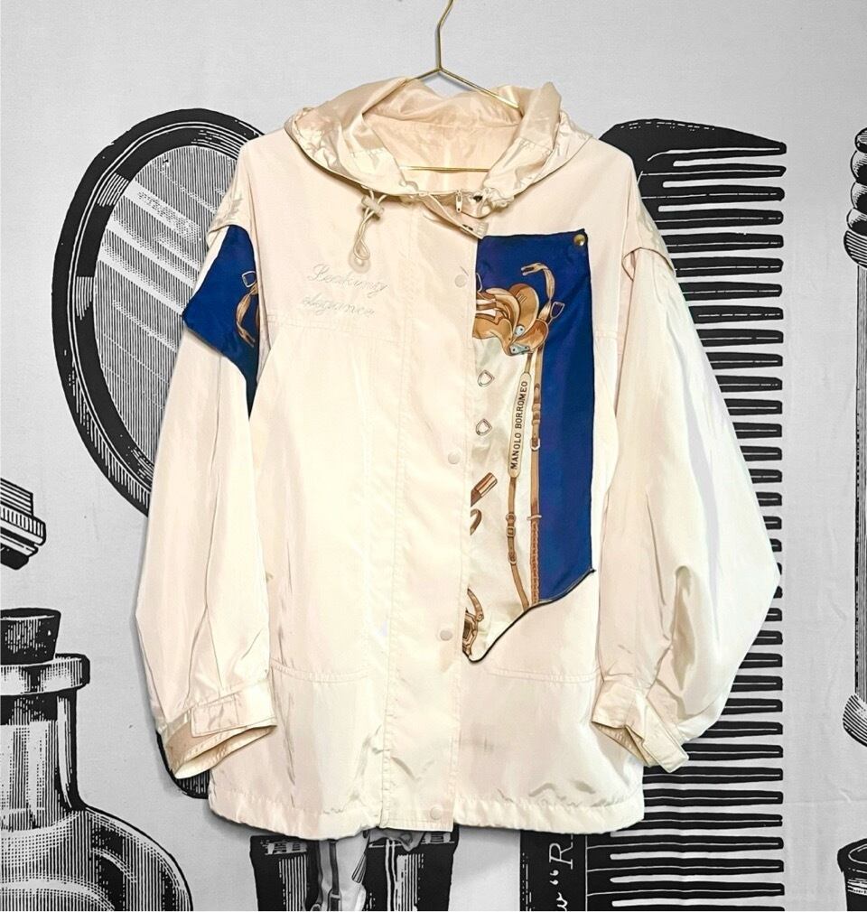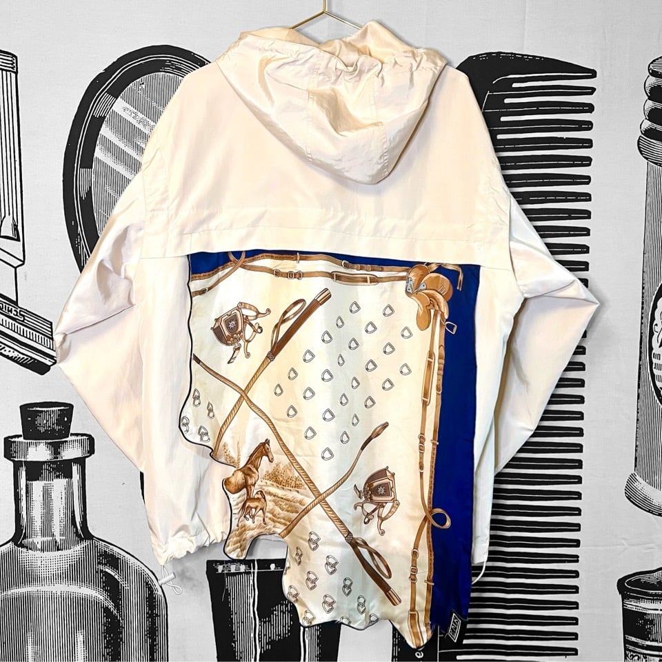 あらゆるところからスカーフが飛び出したデザインの個性的なジャンパーです。ご覧の通り、上品さが全身から漏れ出ています。
