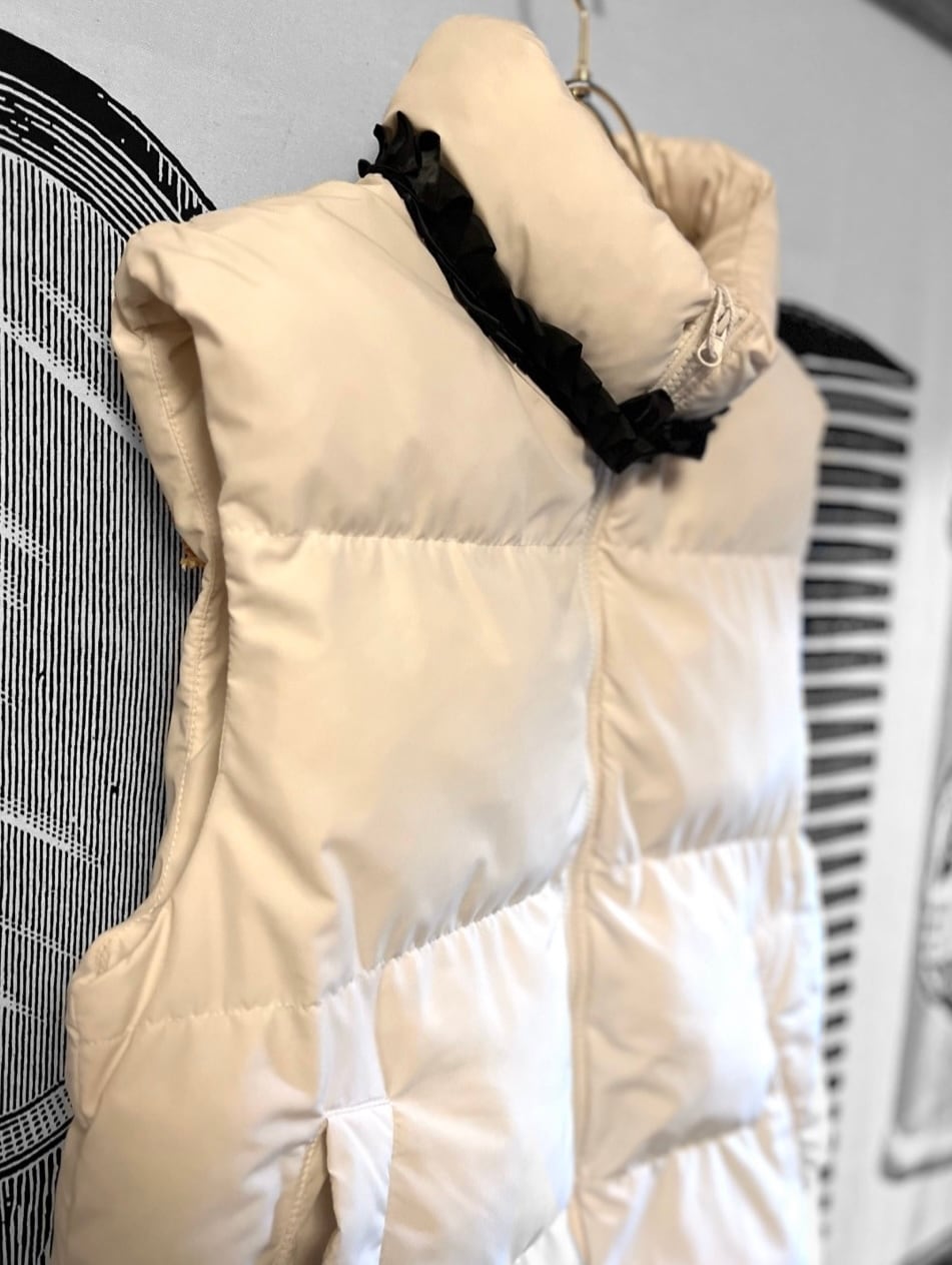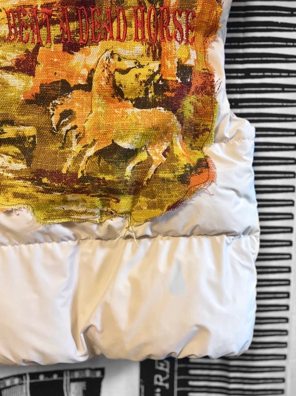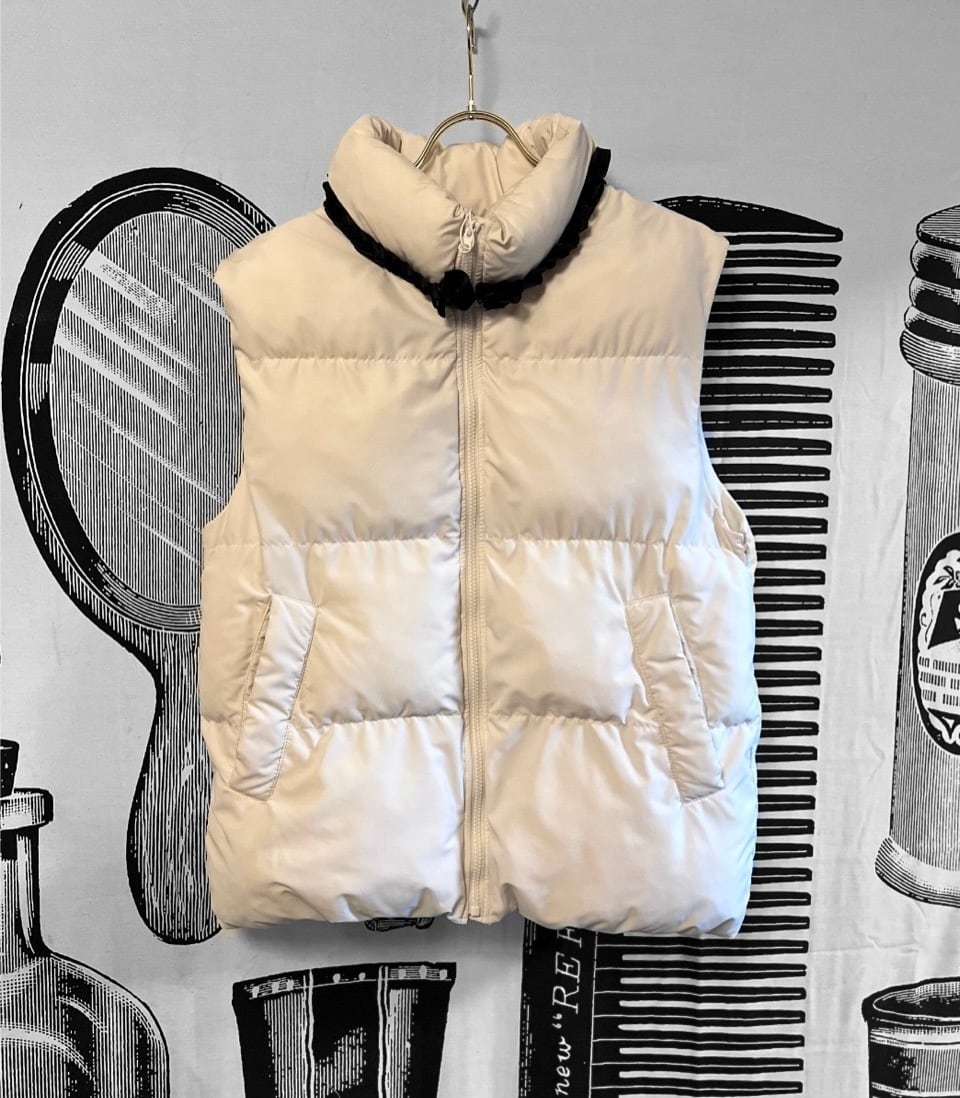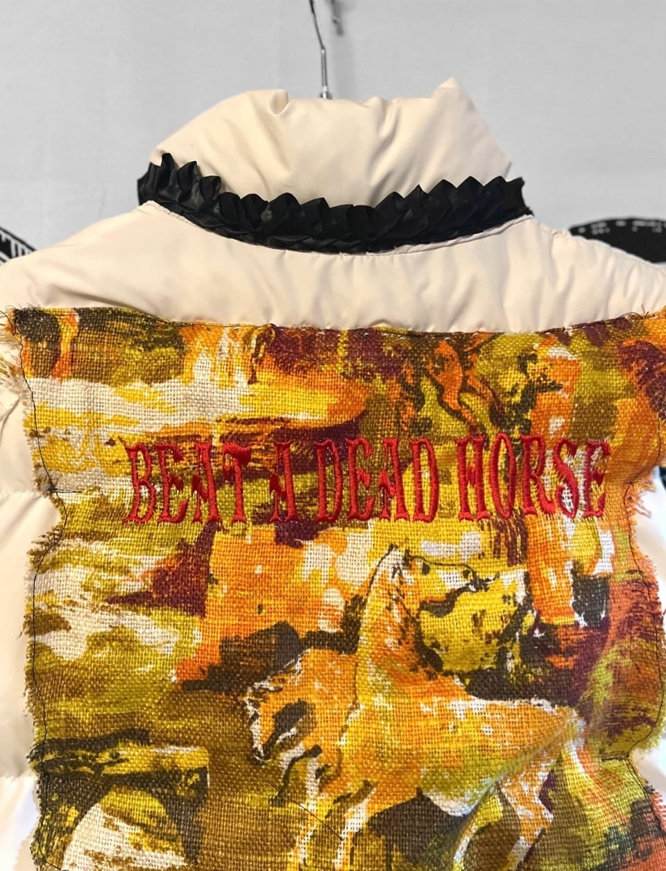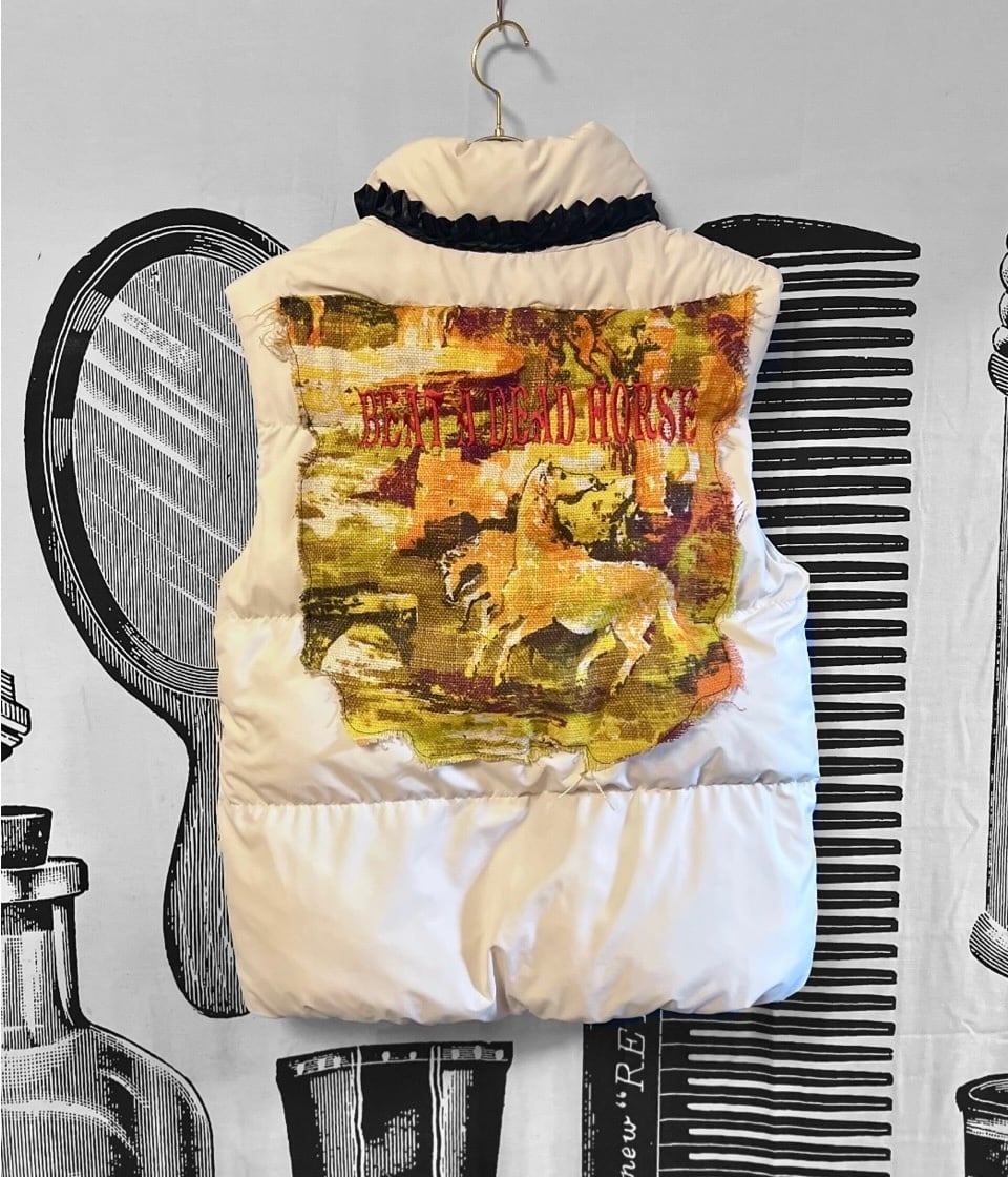 馬柄のテキスタイルにオリジナル刺繍を施したもっこもこのベストダウン。
