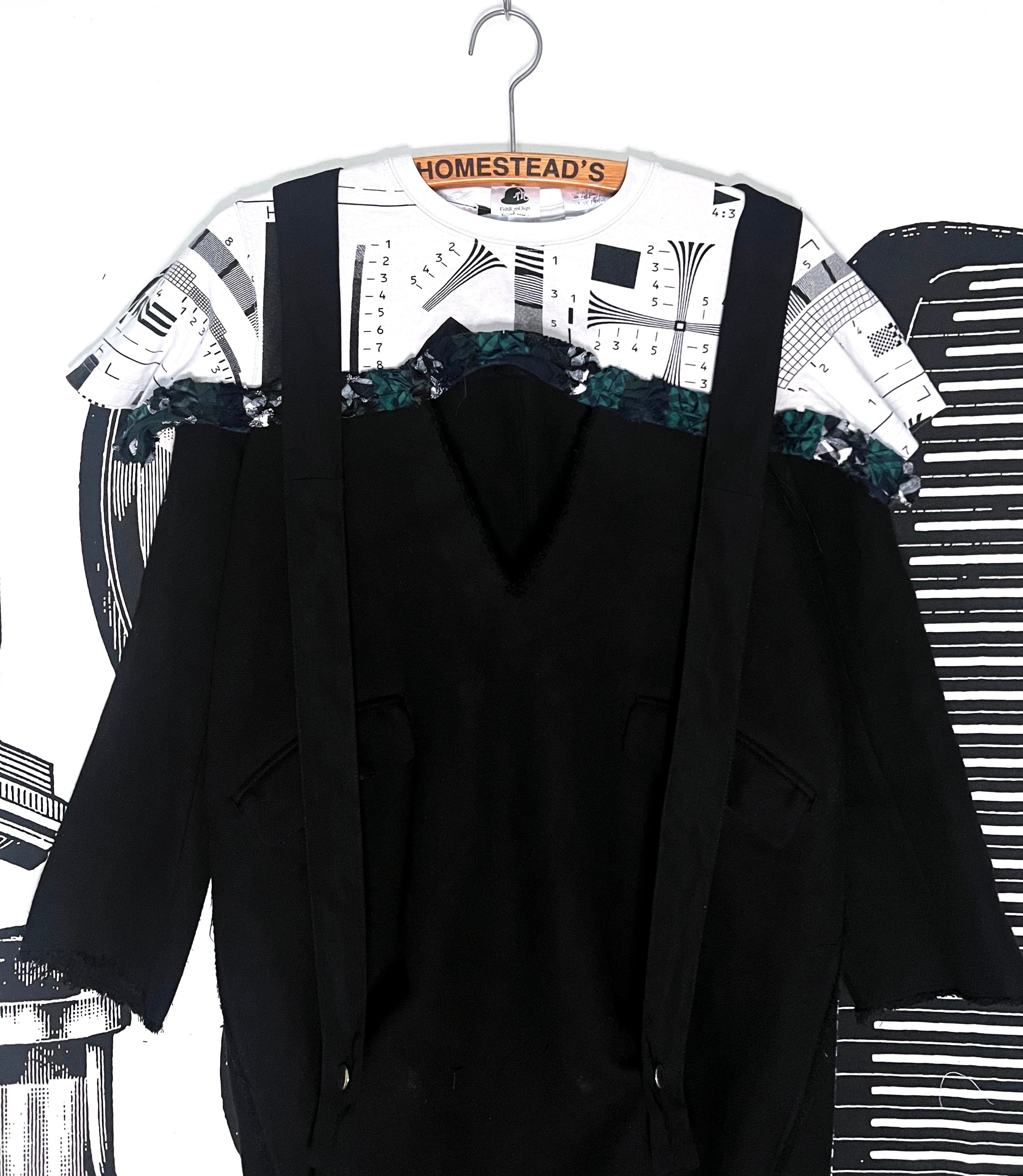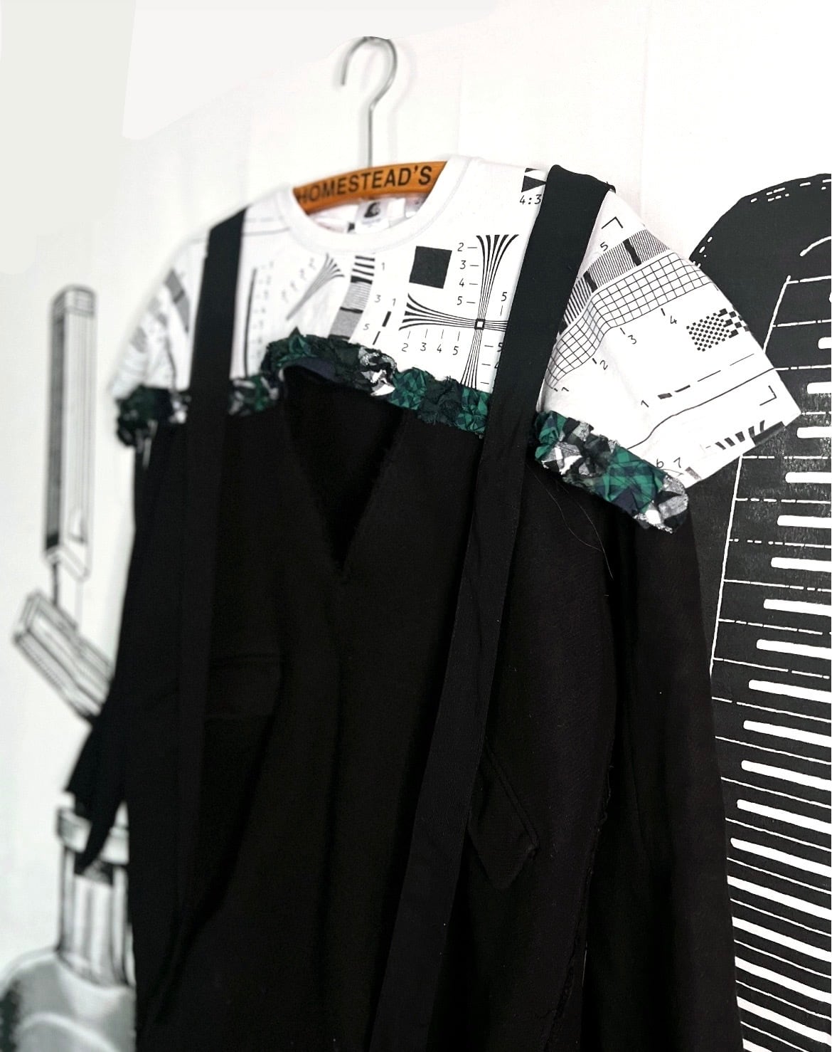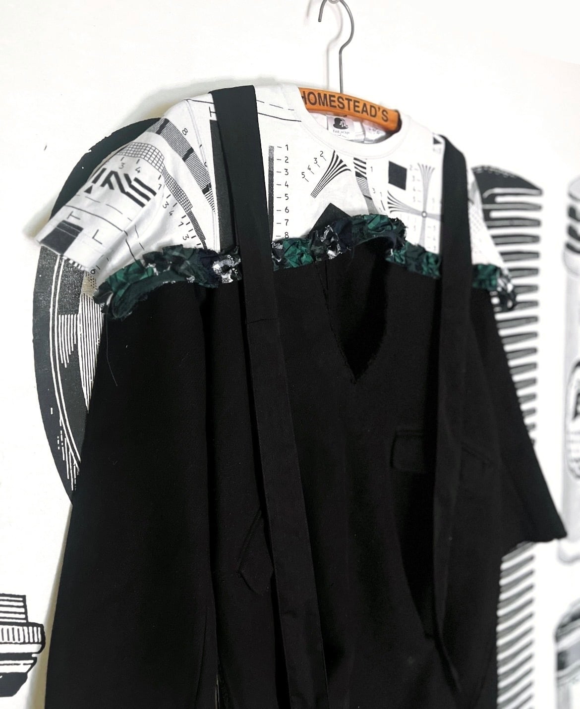 前見頃に大胆にもTシャツが装飾されているので、首の手前にTシャツの首元が来るデザインになっています。緑のフリルをあしらい、フロントに見える襟元には敢えてたくさんタグをつけています。