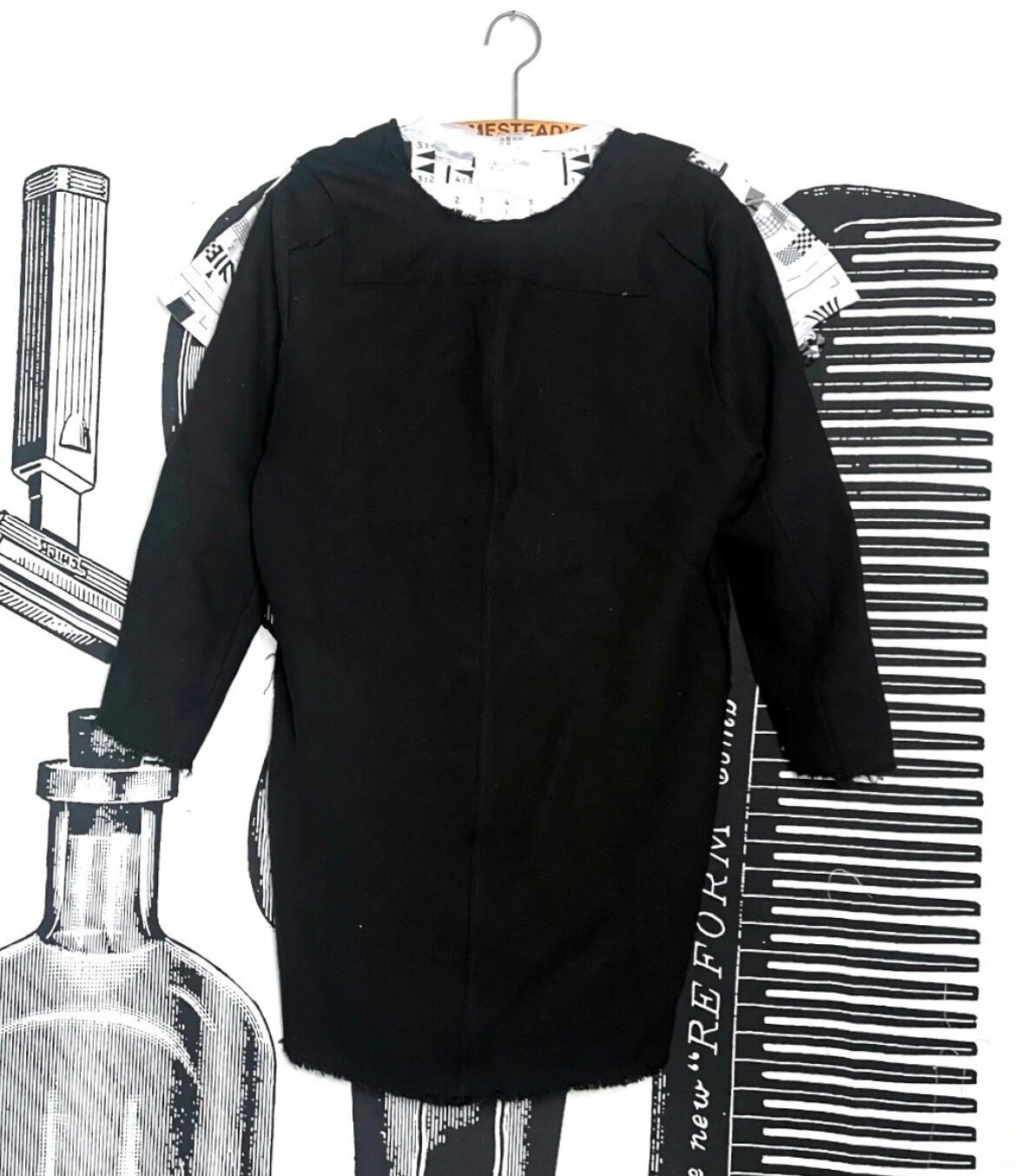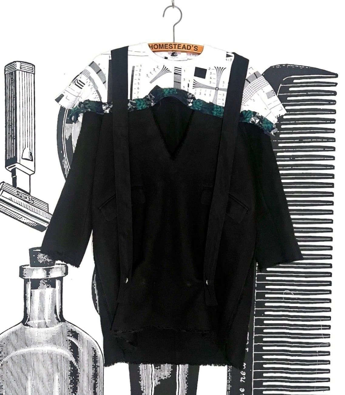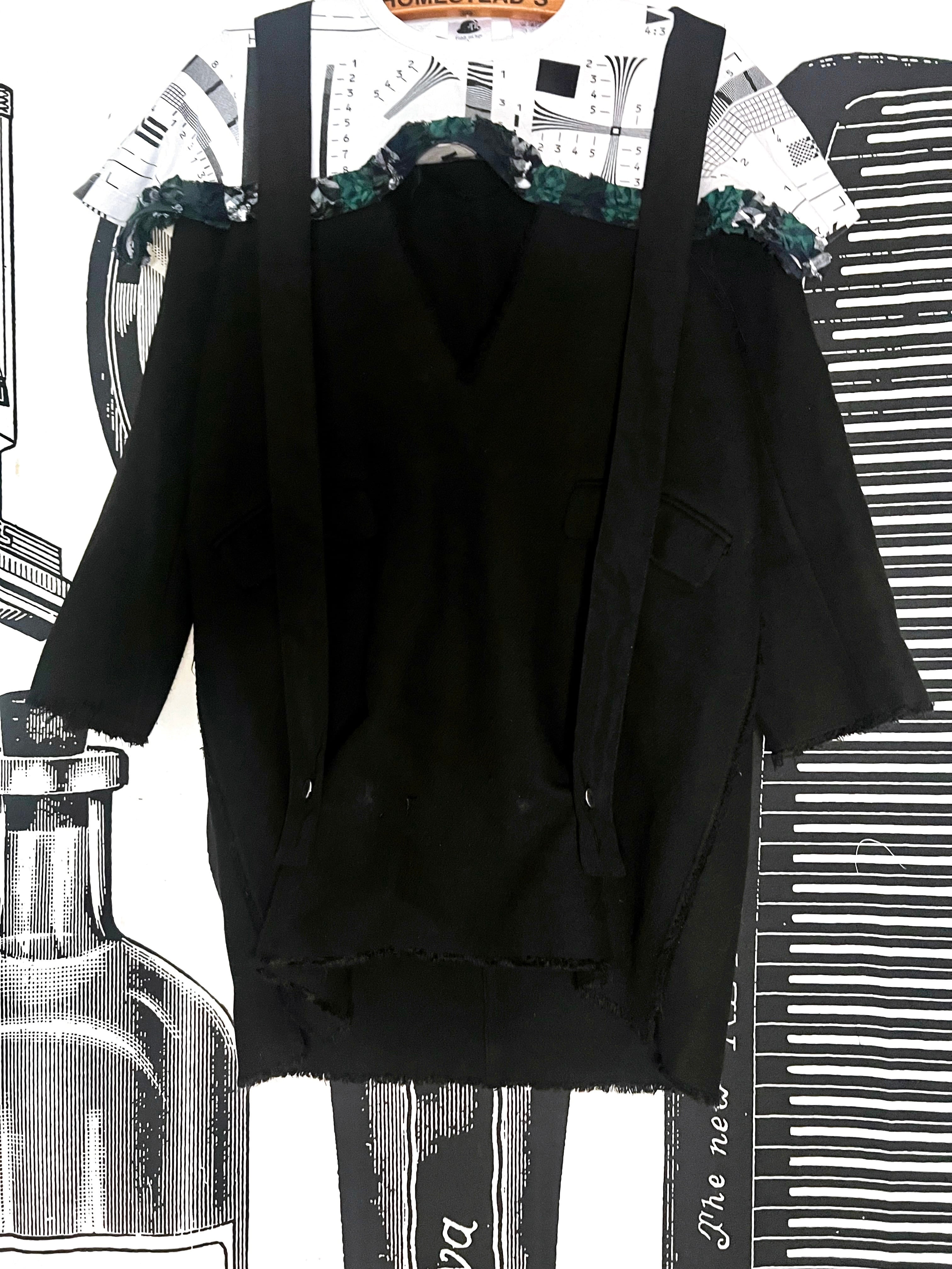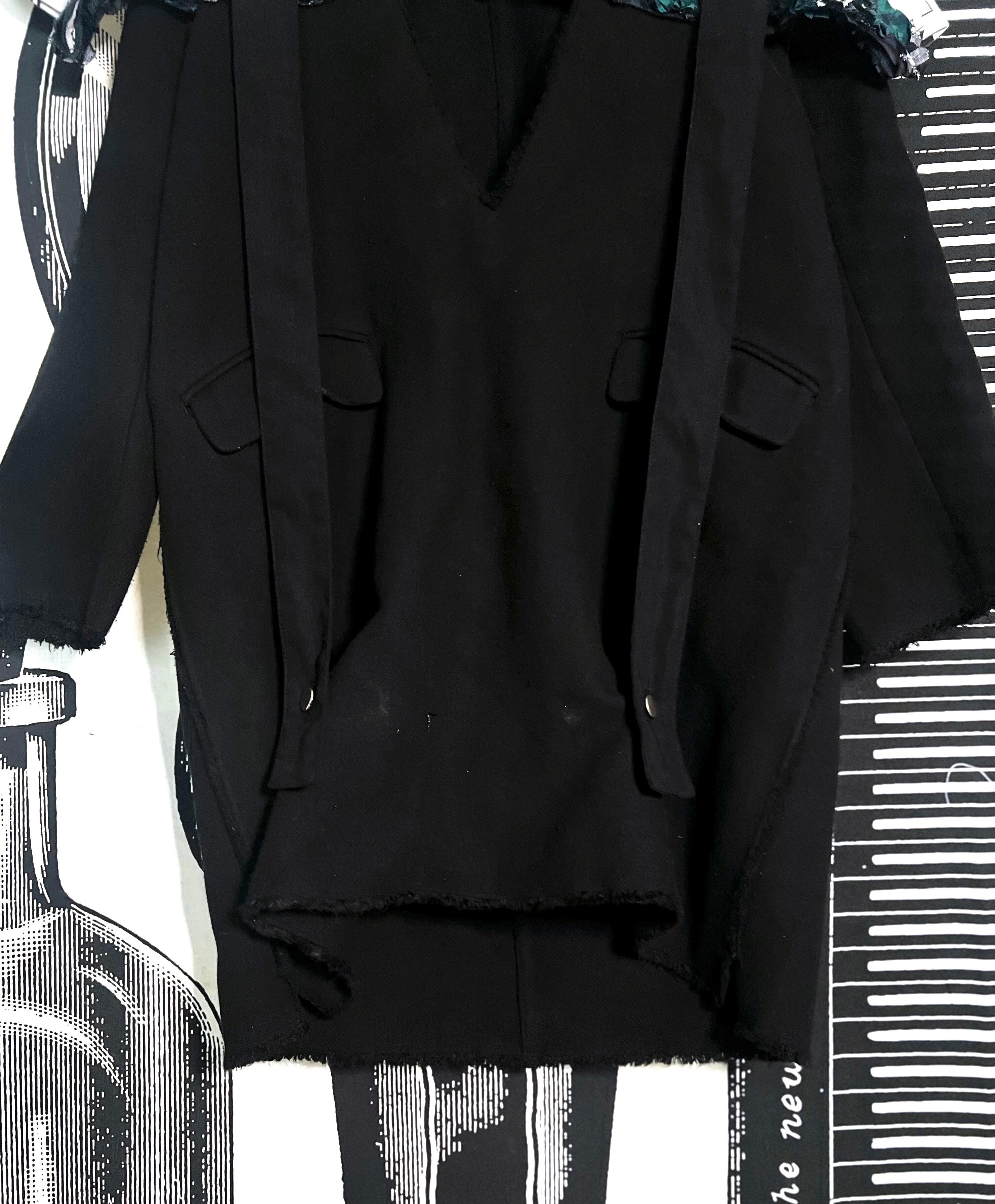前見頃に大胆にもTシャツが装飾されているので、首の手前にTシャツの首元が来るデザインになっています。緑のフリルをあしらい、フロントに見える襟元には敢えてたくさんタグをつけています。
