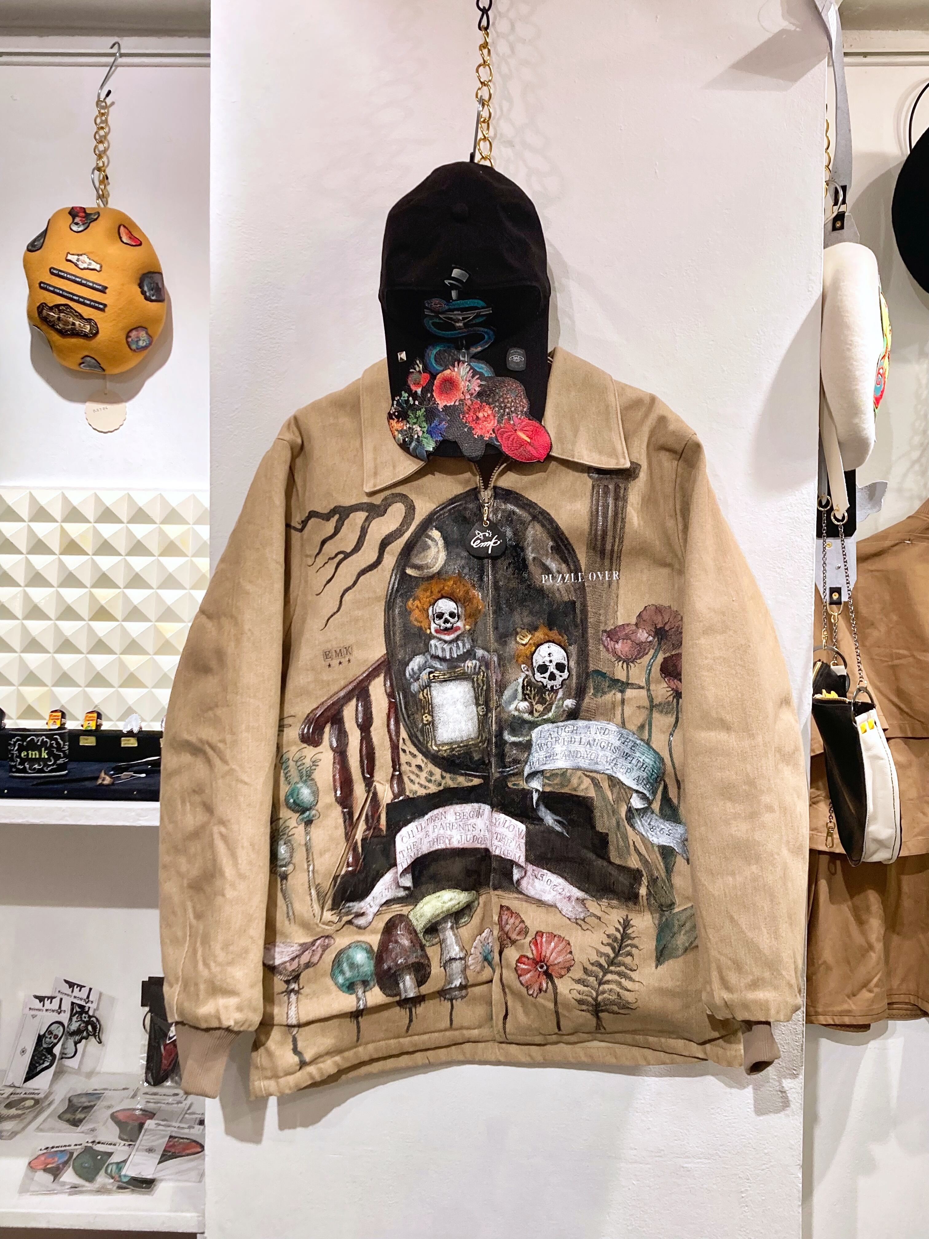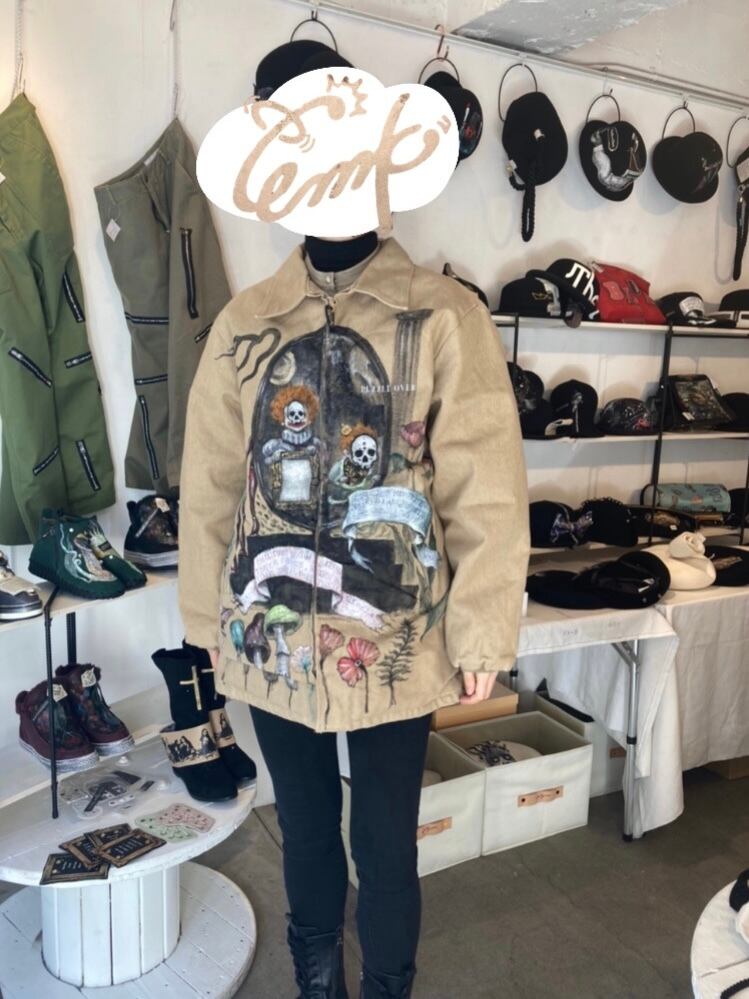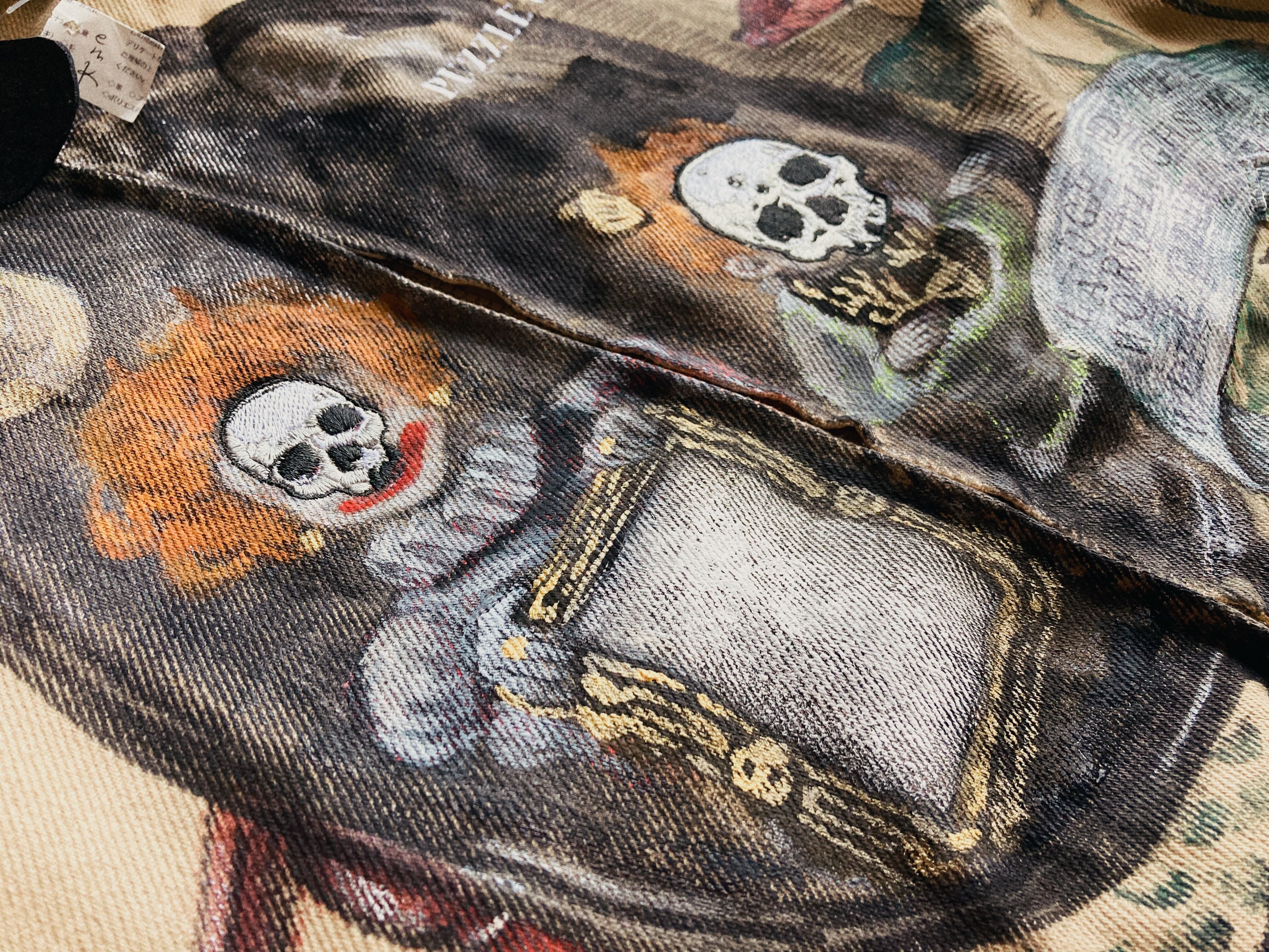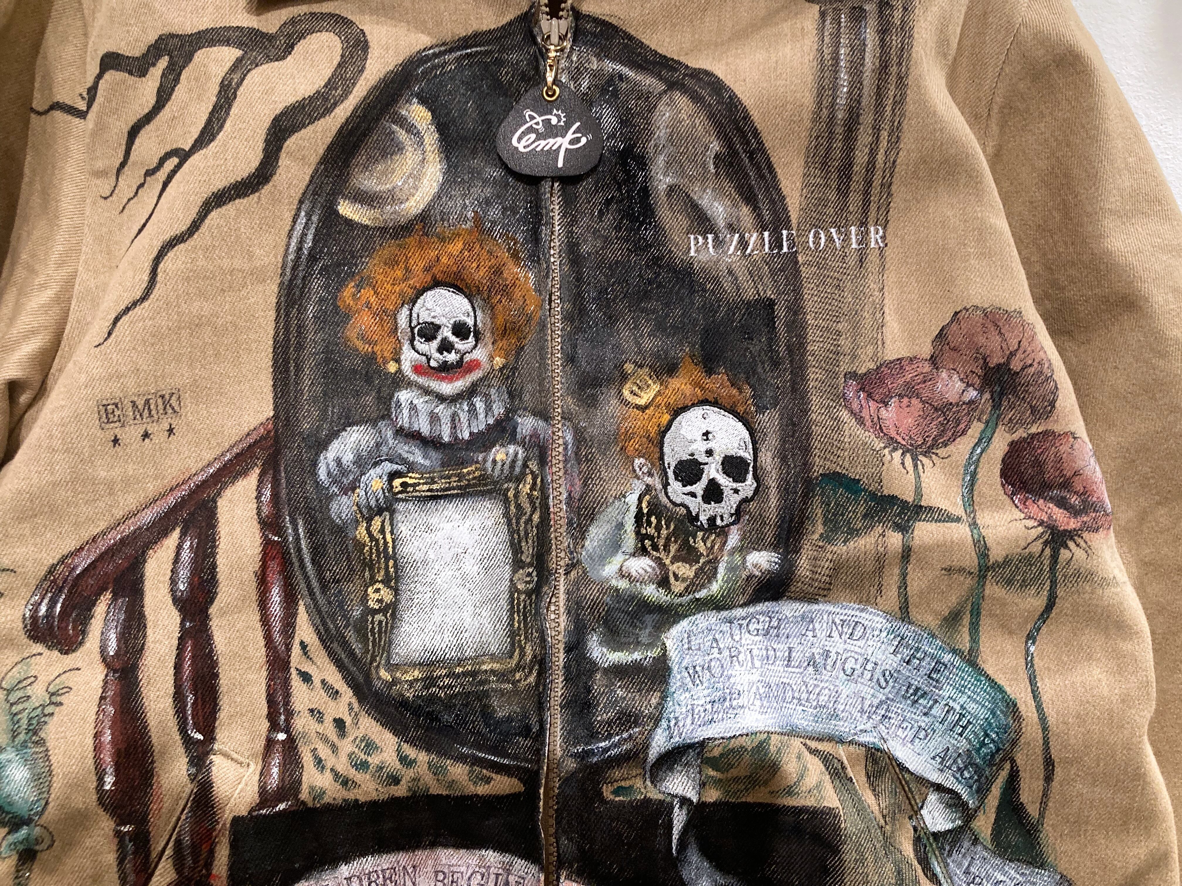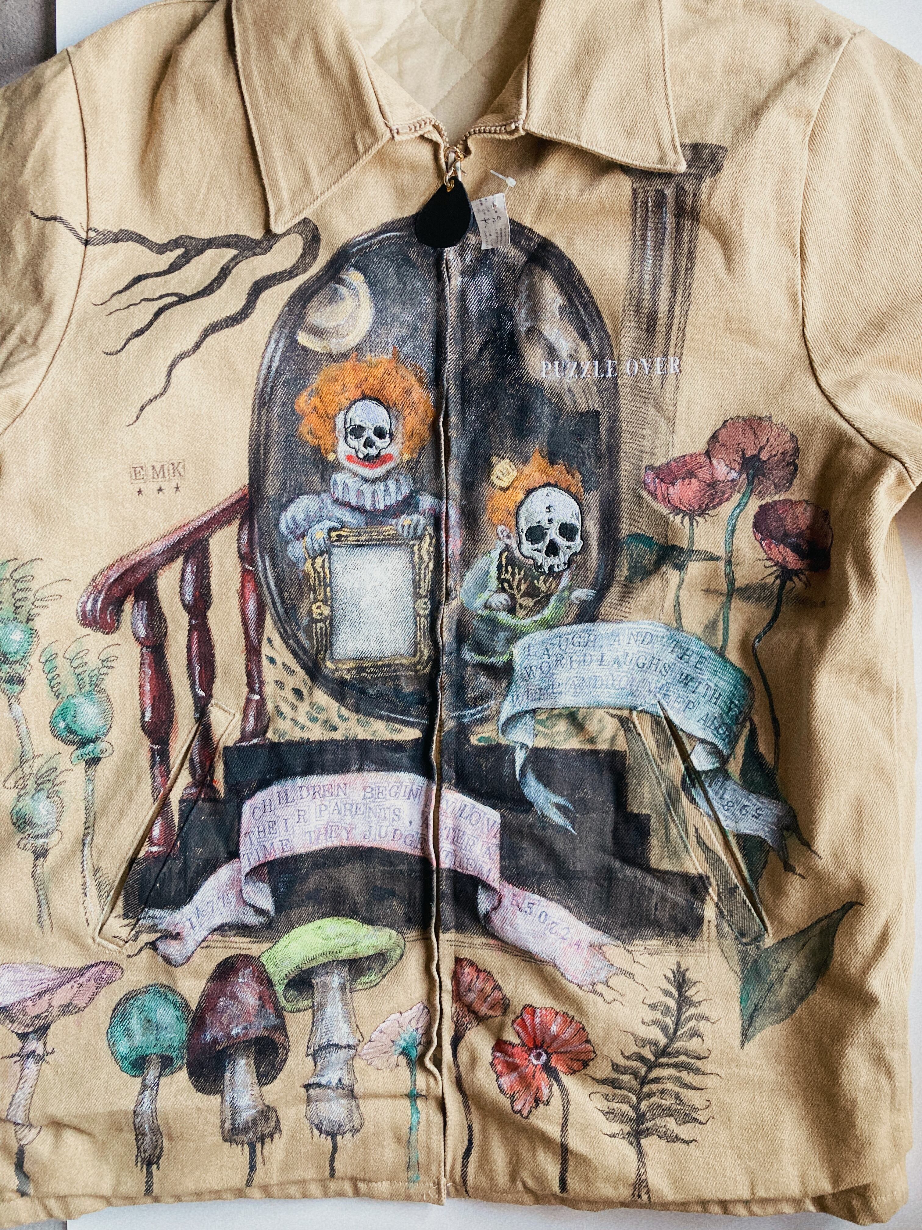 大きめのワークジャケットに不思議な世界観のハンドペイントをふんだんに施した一品。子供の顔には刺繍で髑髏の仮面が装飾。近くで見れば見るほど見応えある作品です。メンズXLサイズ。