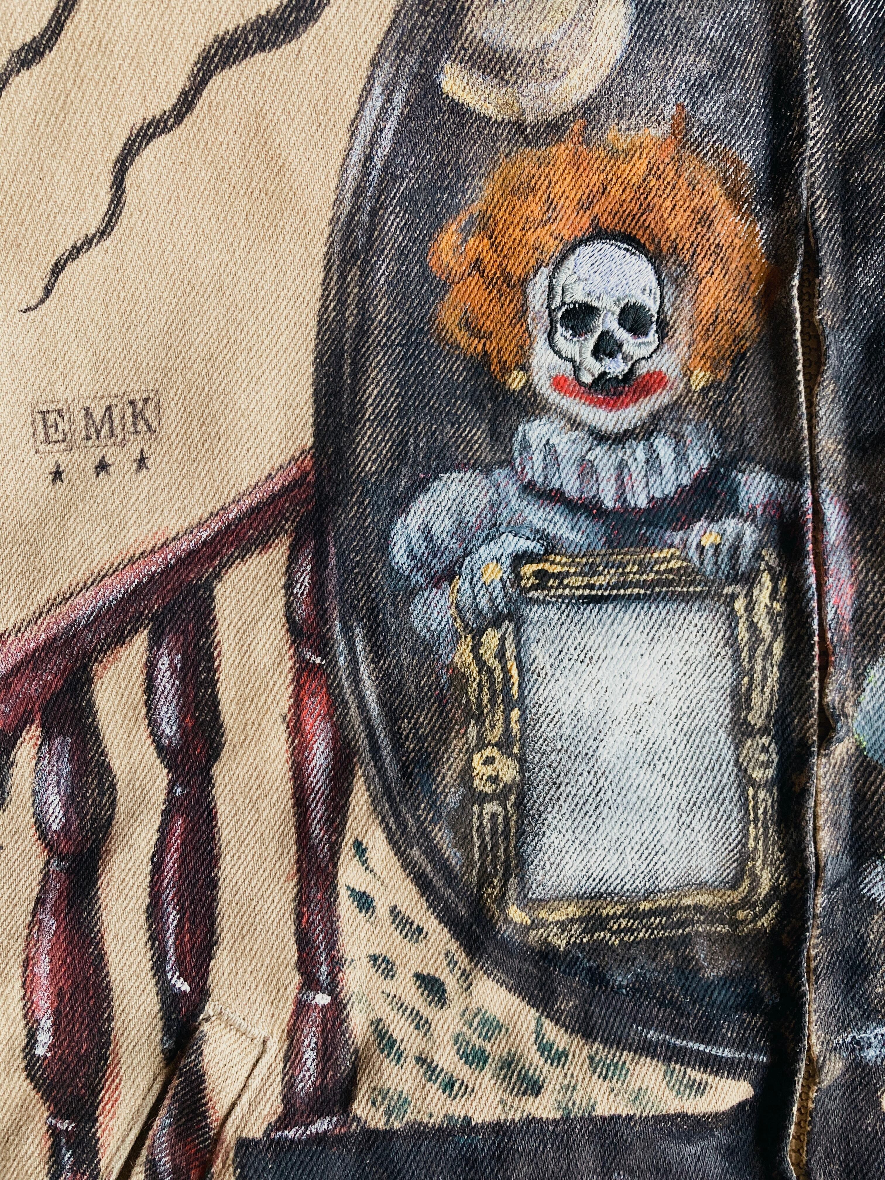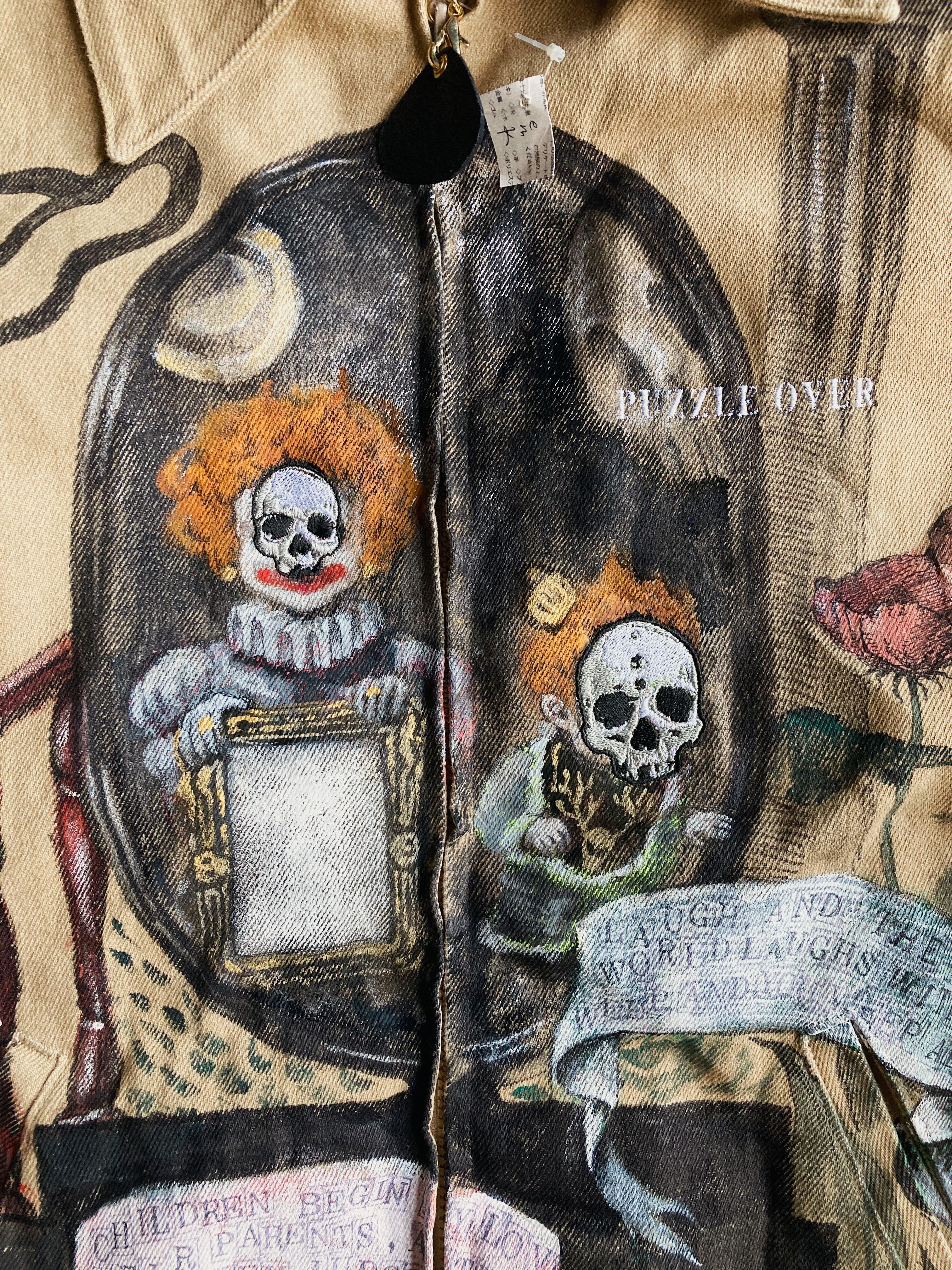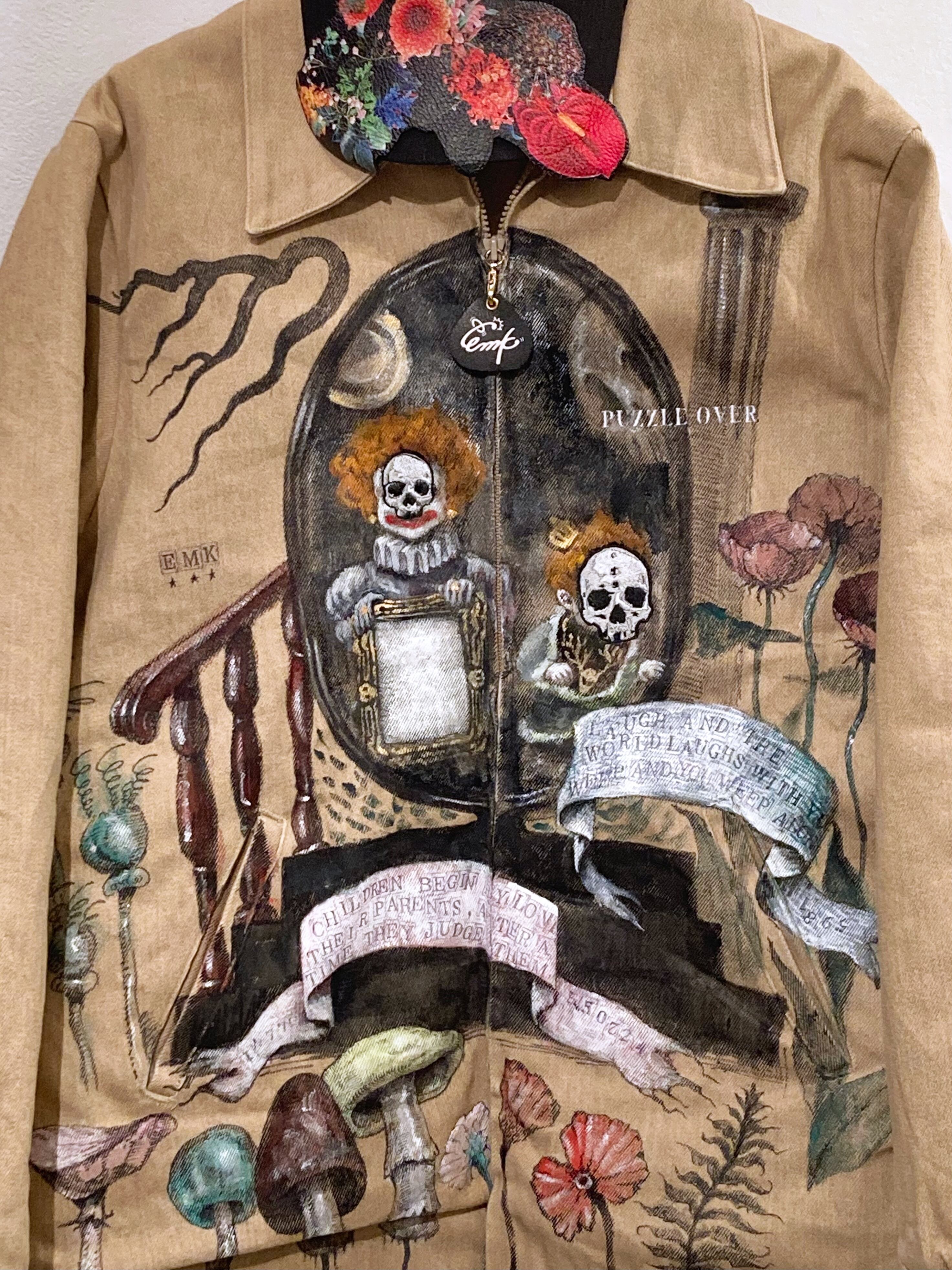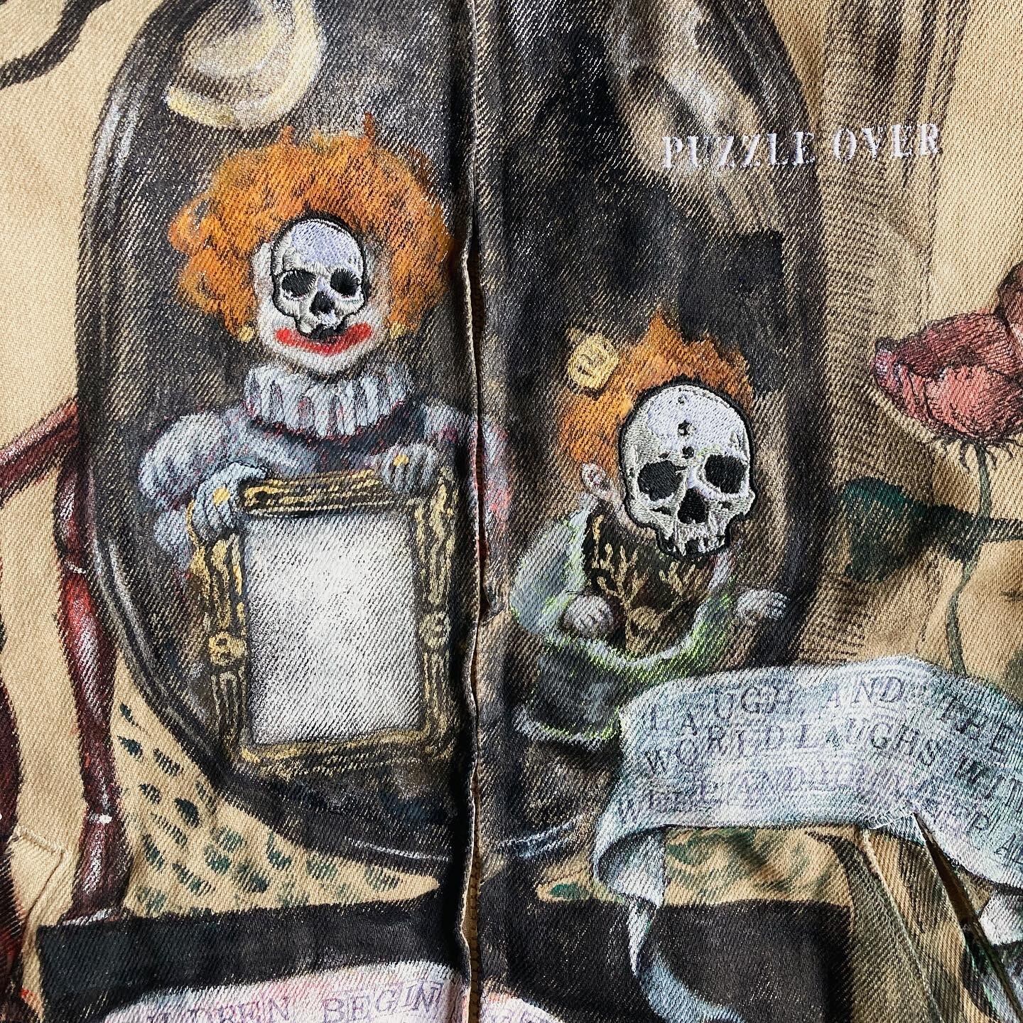 大きめのワークジャケットに不思議な世界観のハンドペイントをふんだんに施した一品。子供の顔には刺繍で髑髏の仮面が装飾。近くで見れば見るほど見応えある作品です。メンズXLサイズ。