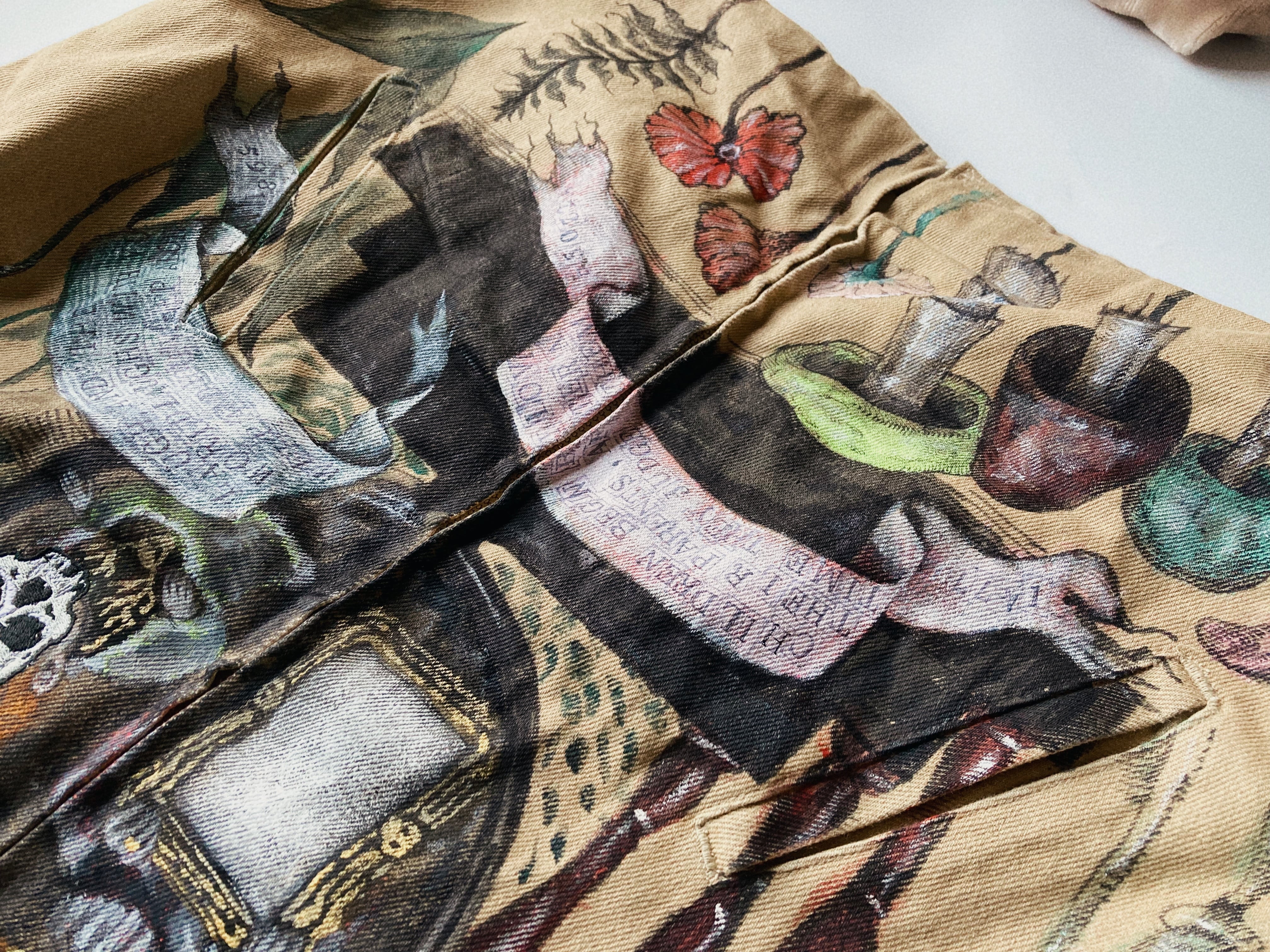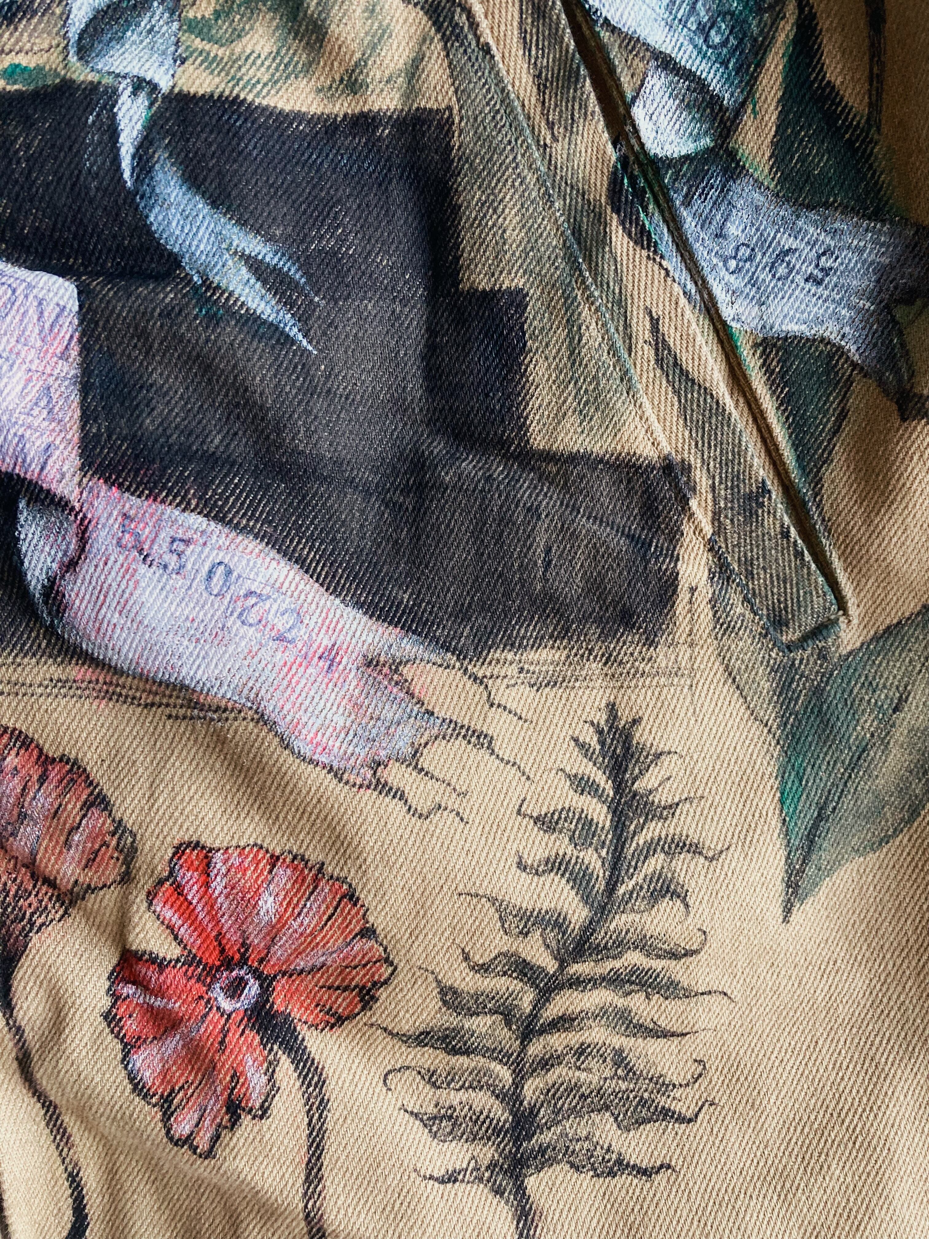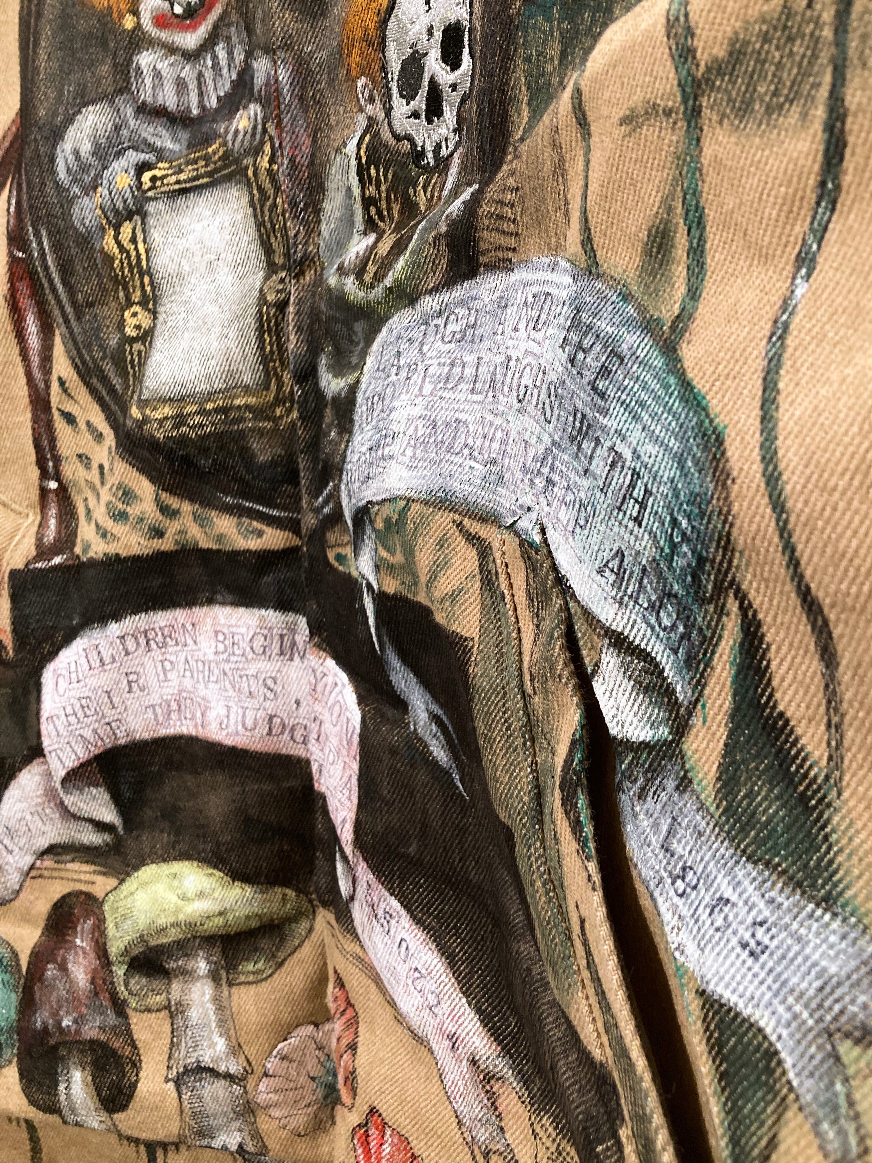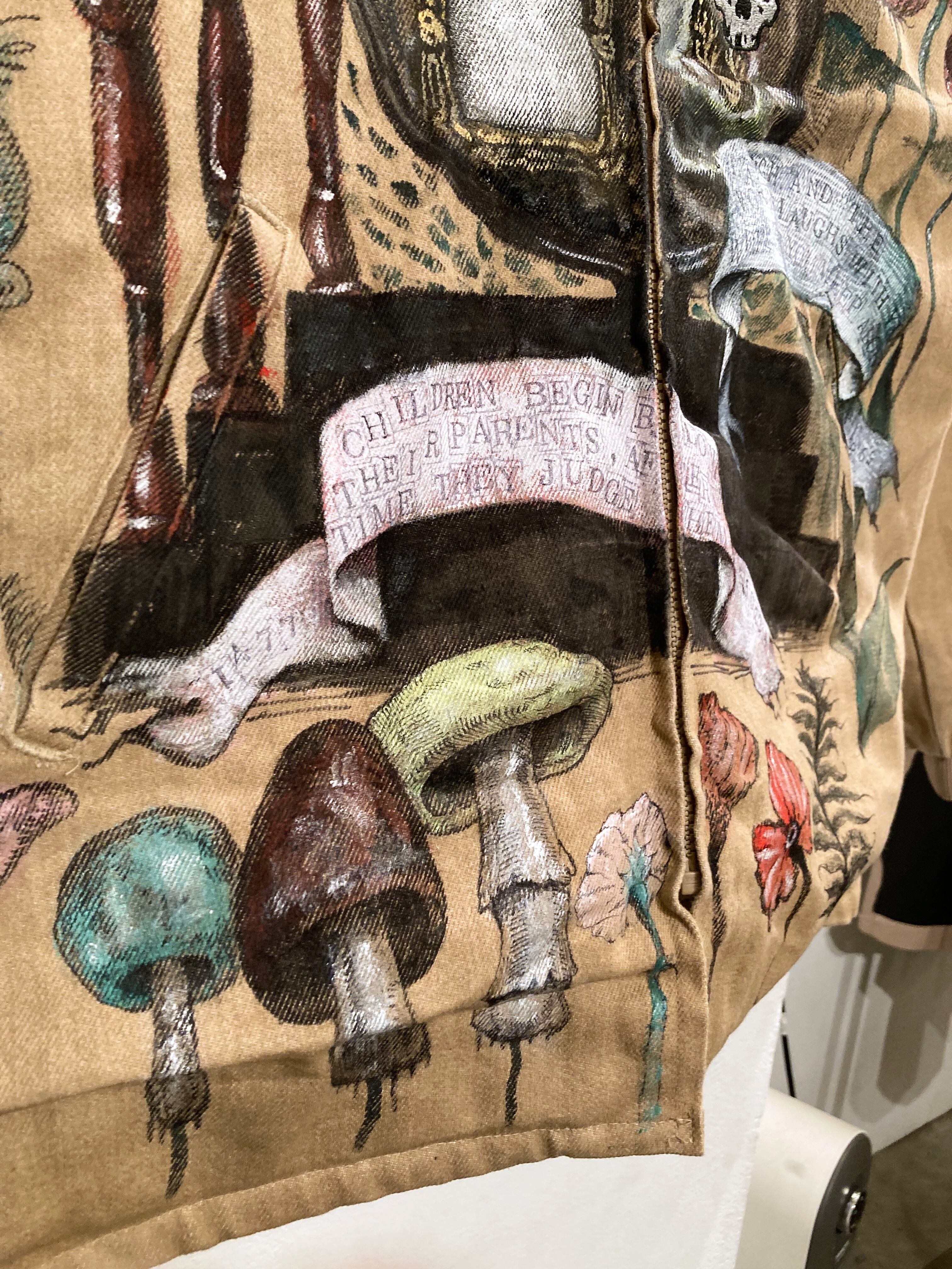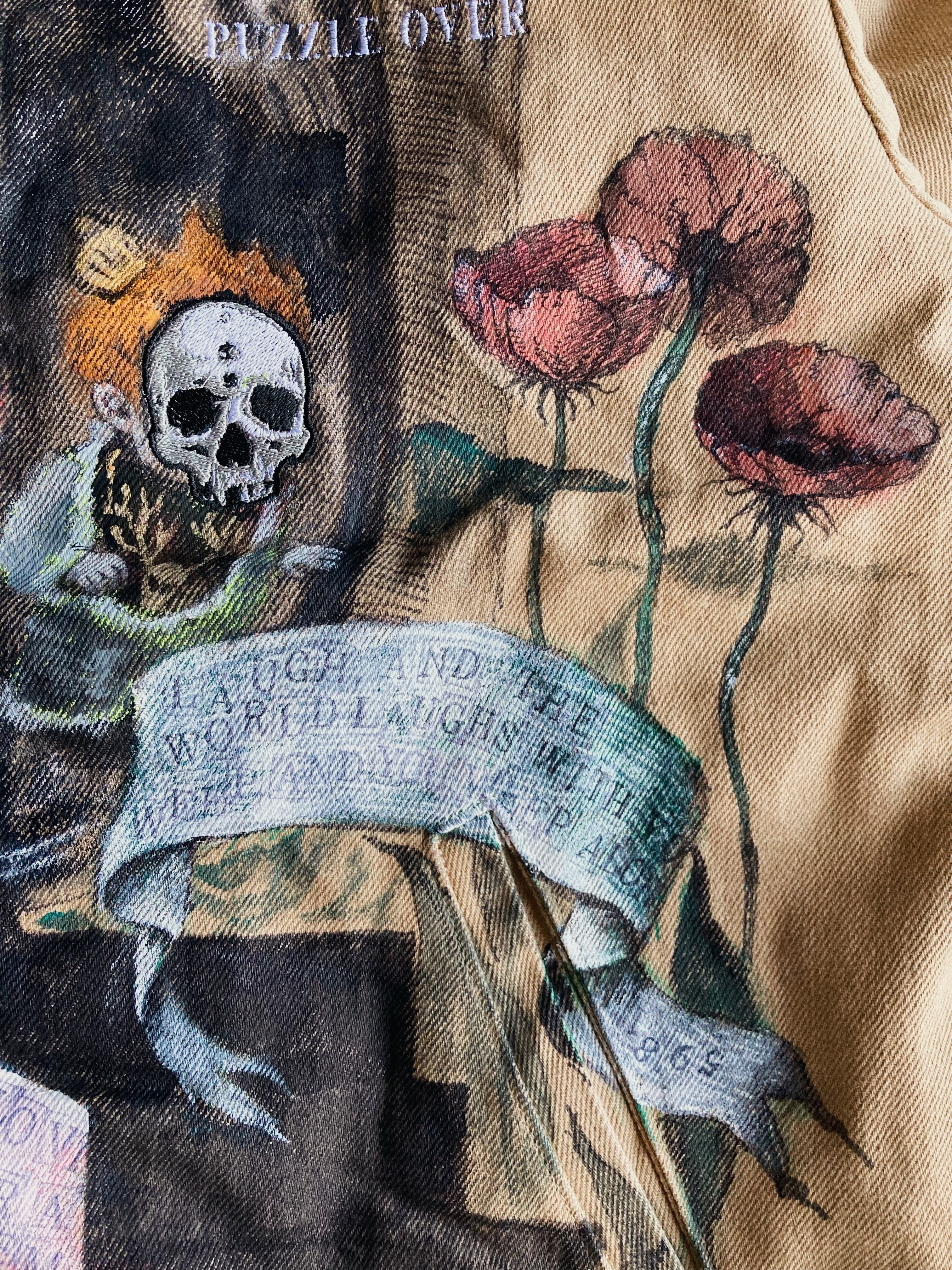 大きめのワークジャケットに不思議な世界観のハンドペイントをふんだんに施した一品。子供の顔には刺繍で髑髏の仮面が装飾。近くで見れば見るほど見応えある作品です。メンズXLサイズ。
