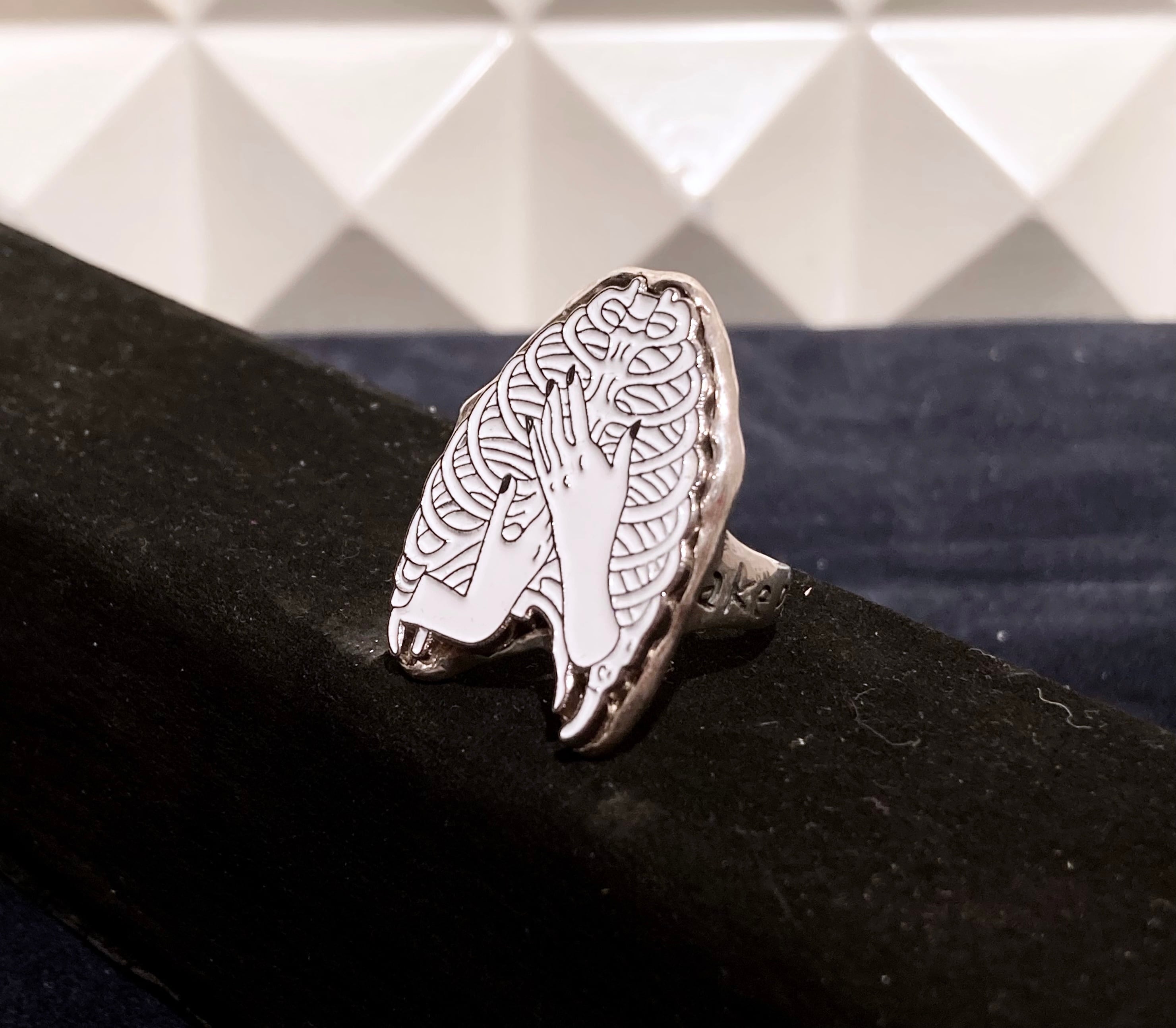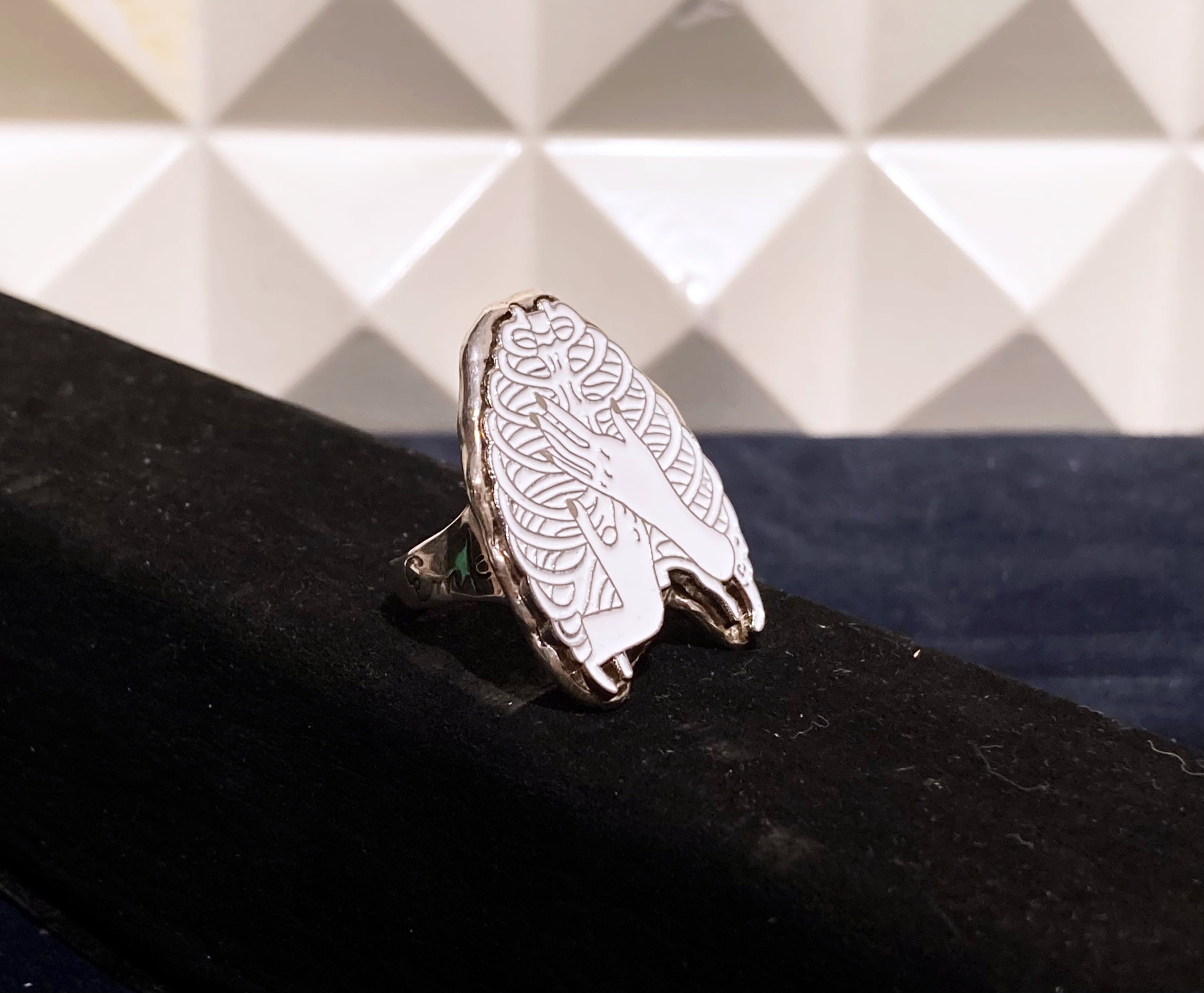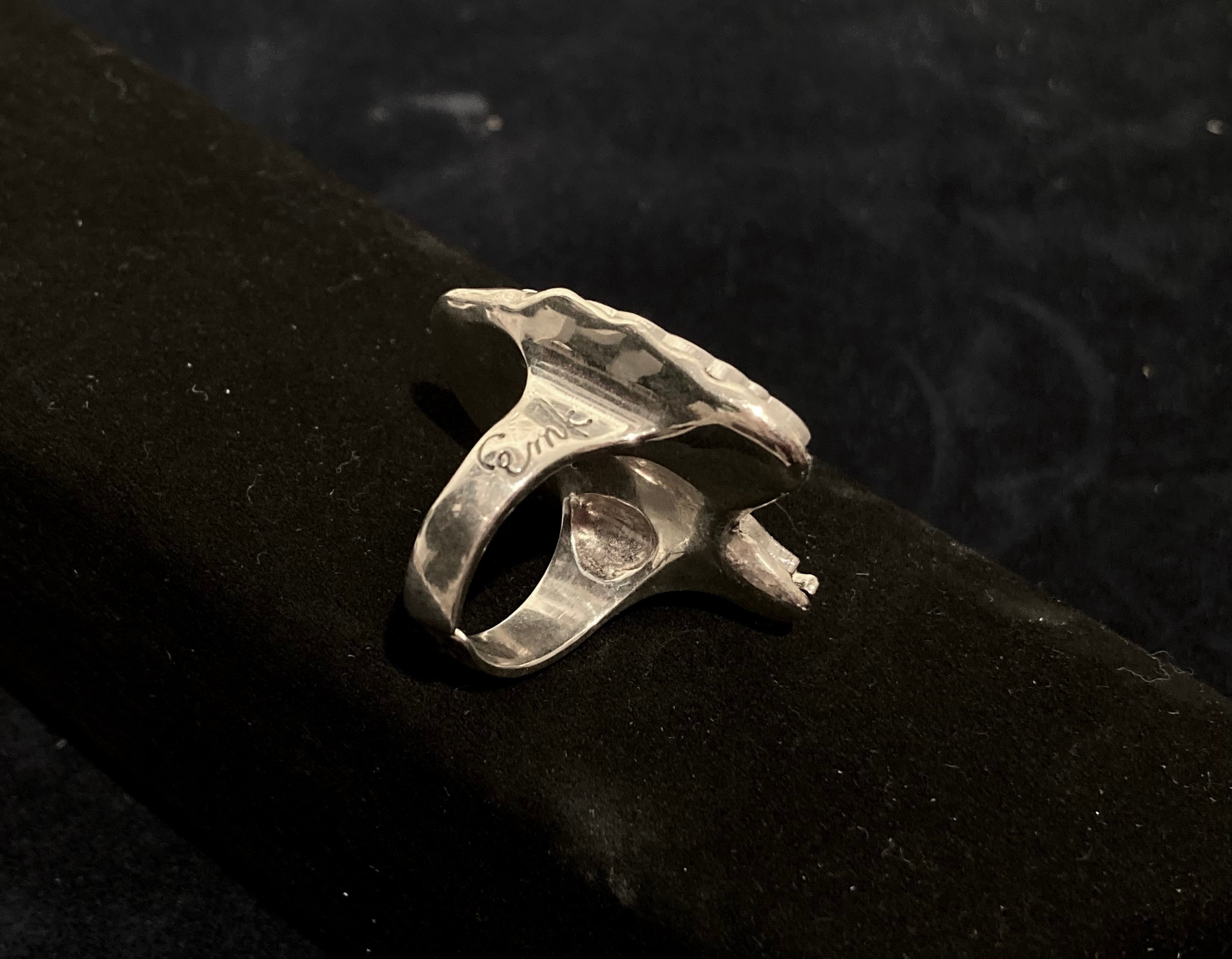こちらはシルバー925製。後ろが開いた仕様になっておりペンチ等にてご自身でサイズ調整可能です。サイドにはそれぞれemkとピンバッジをイメージした文字が掘られています。女性にも男性にもお使いいただけます。