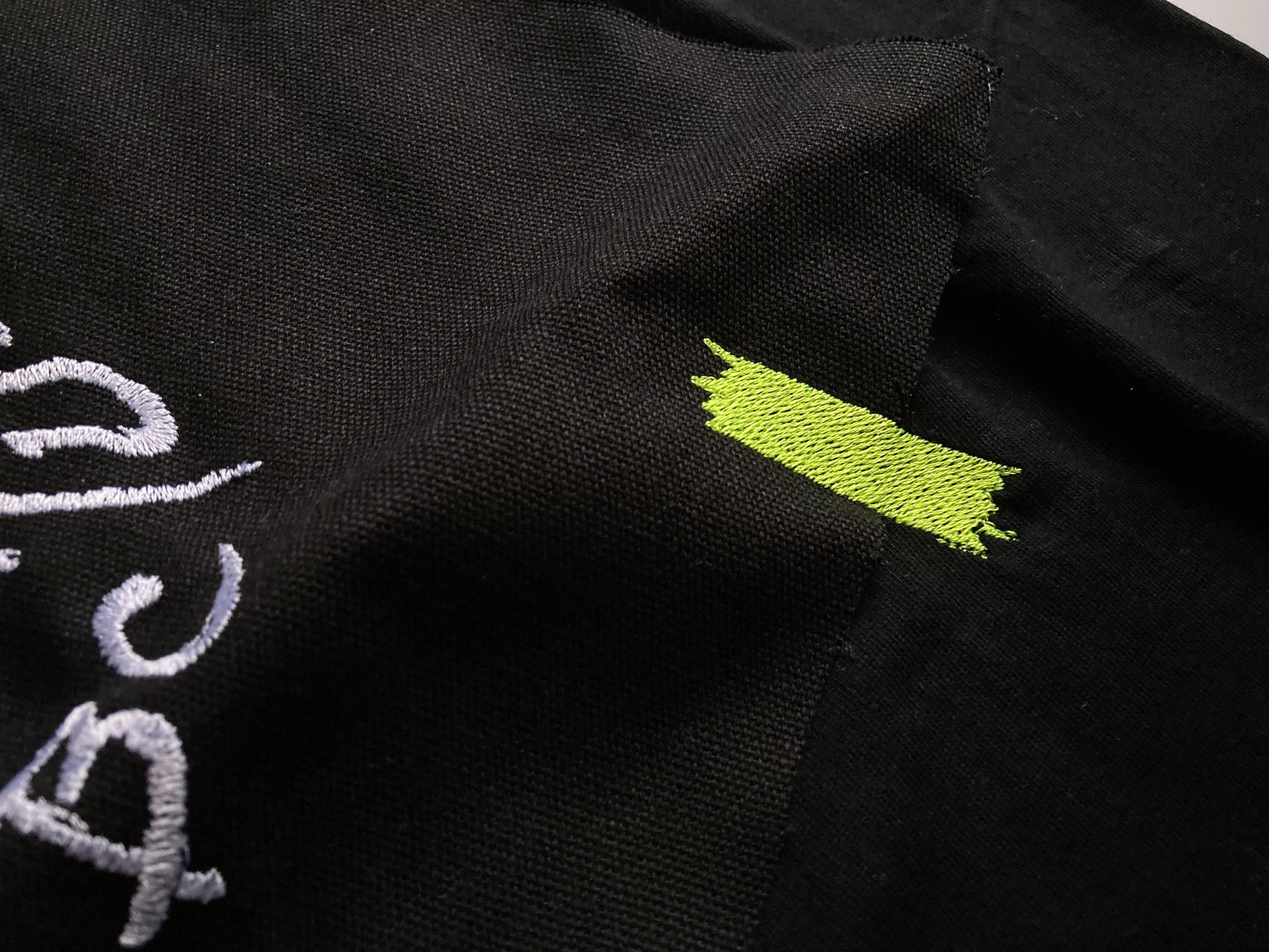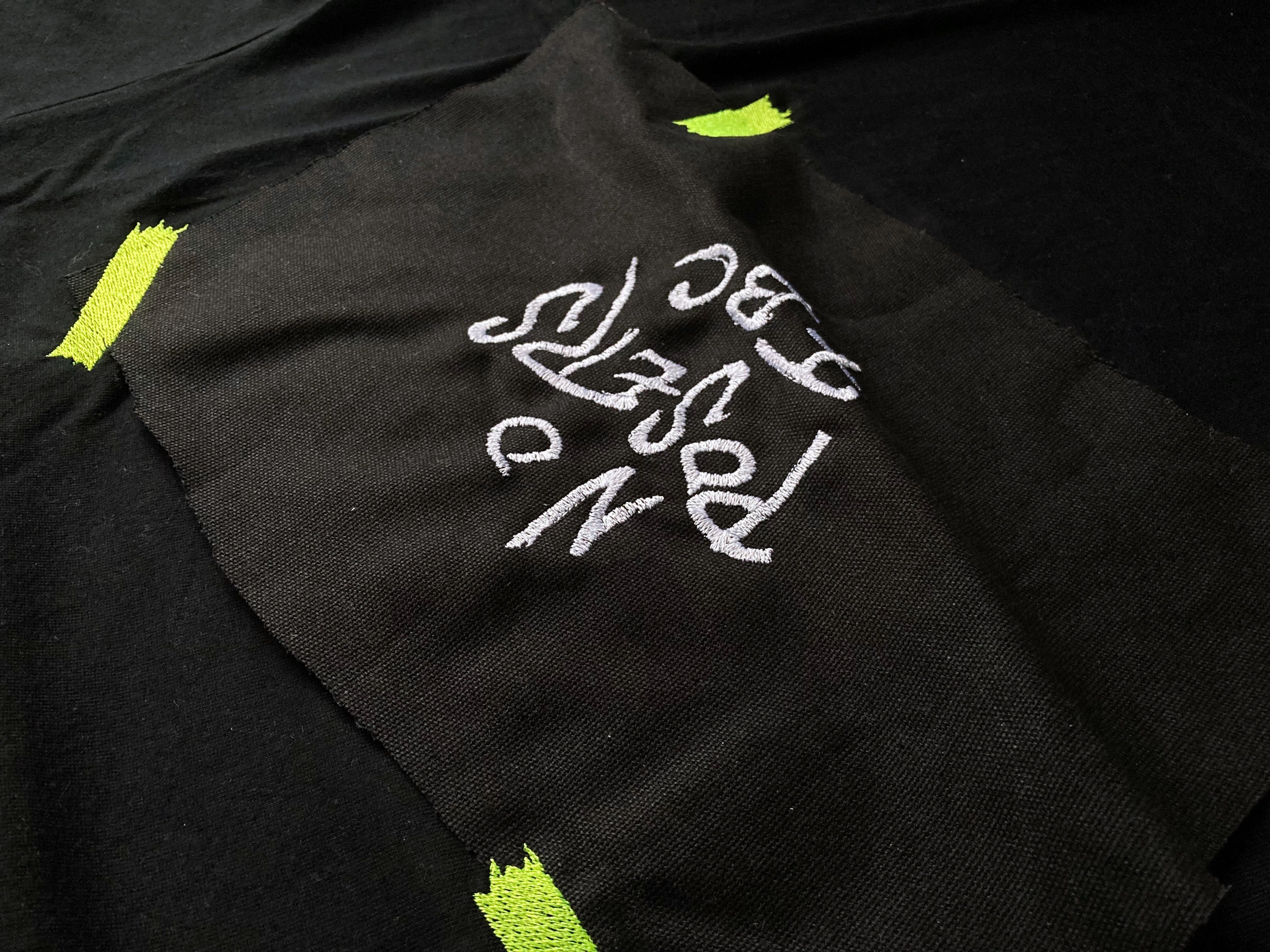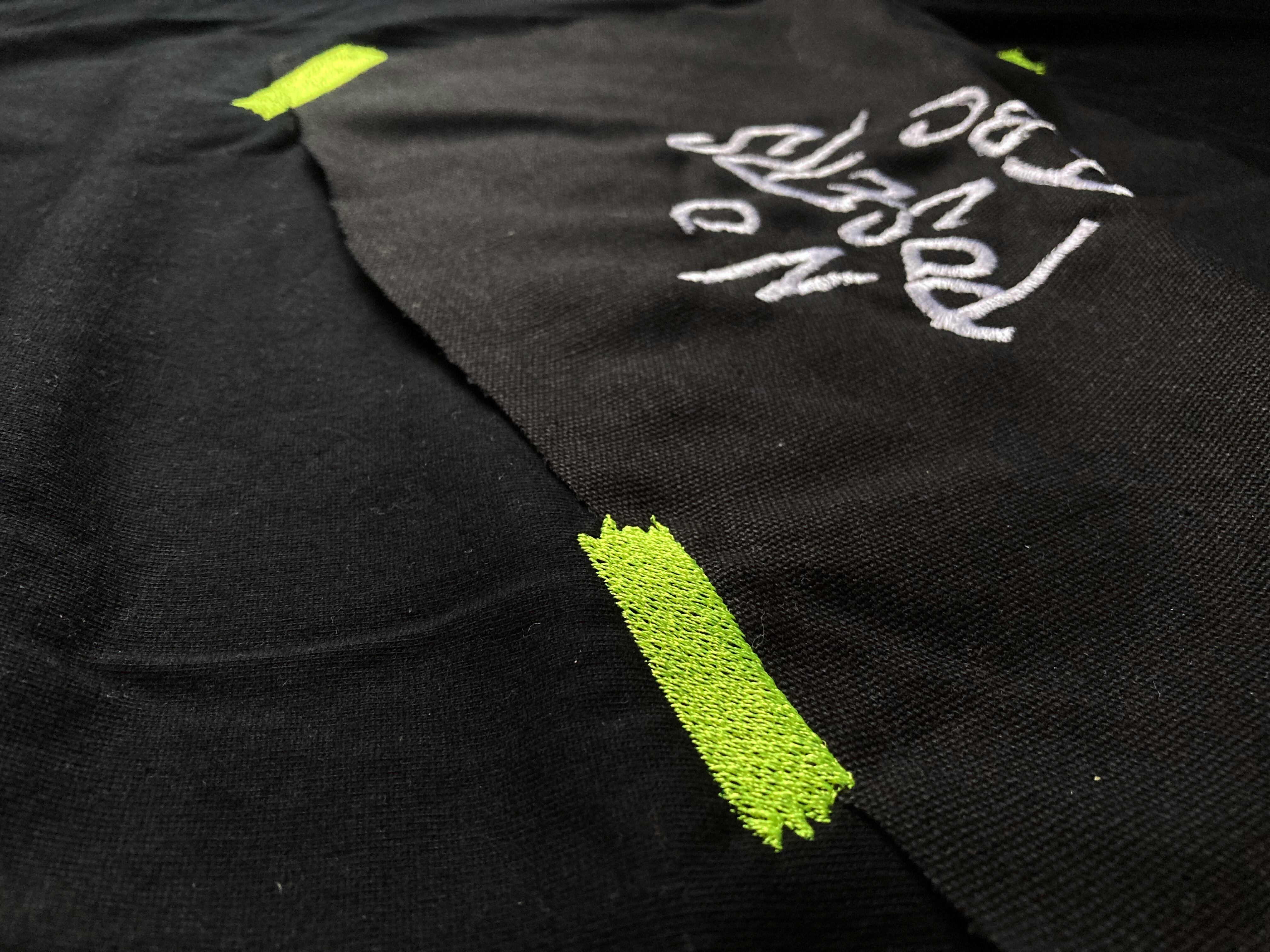 刺繍された貼り紙風の布地が、テープを模した蛍光イエローの刺繍でとめられアクセントに。