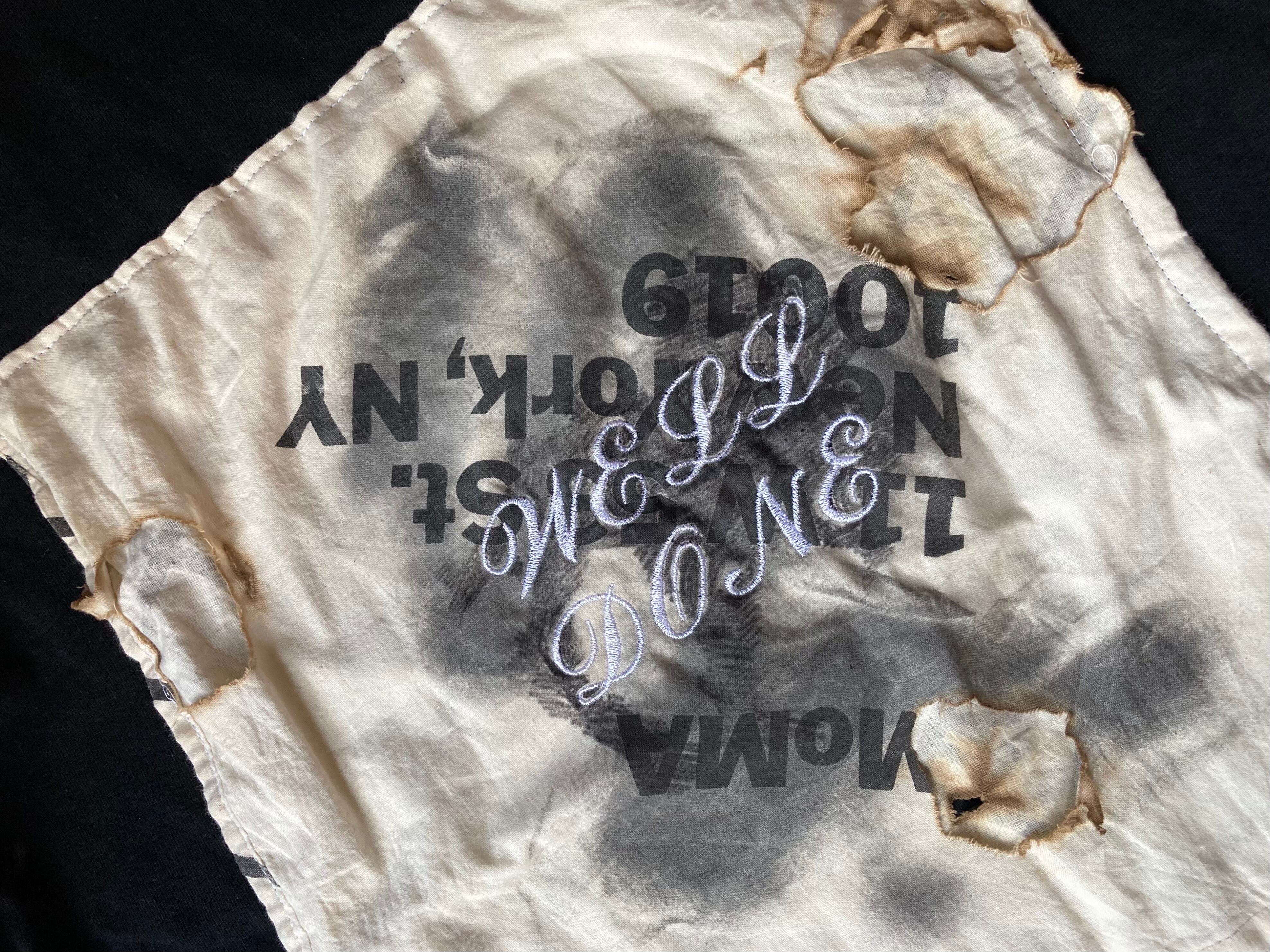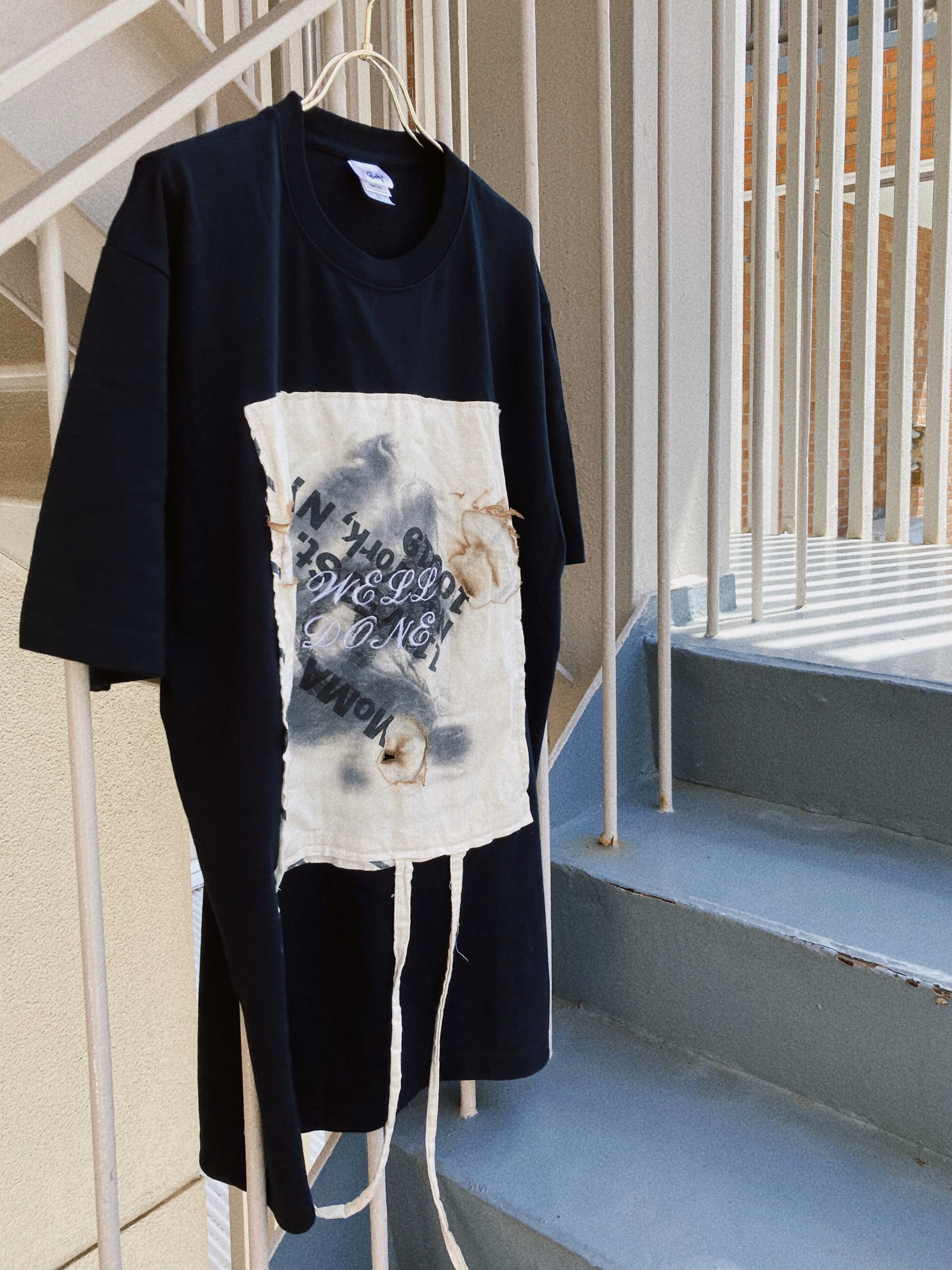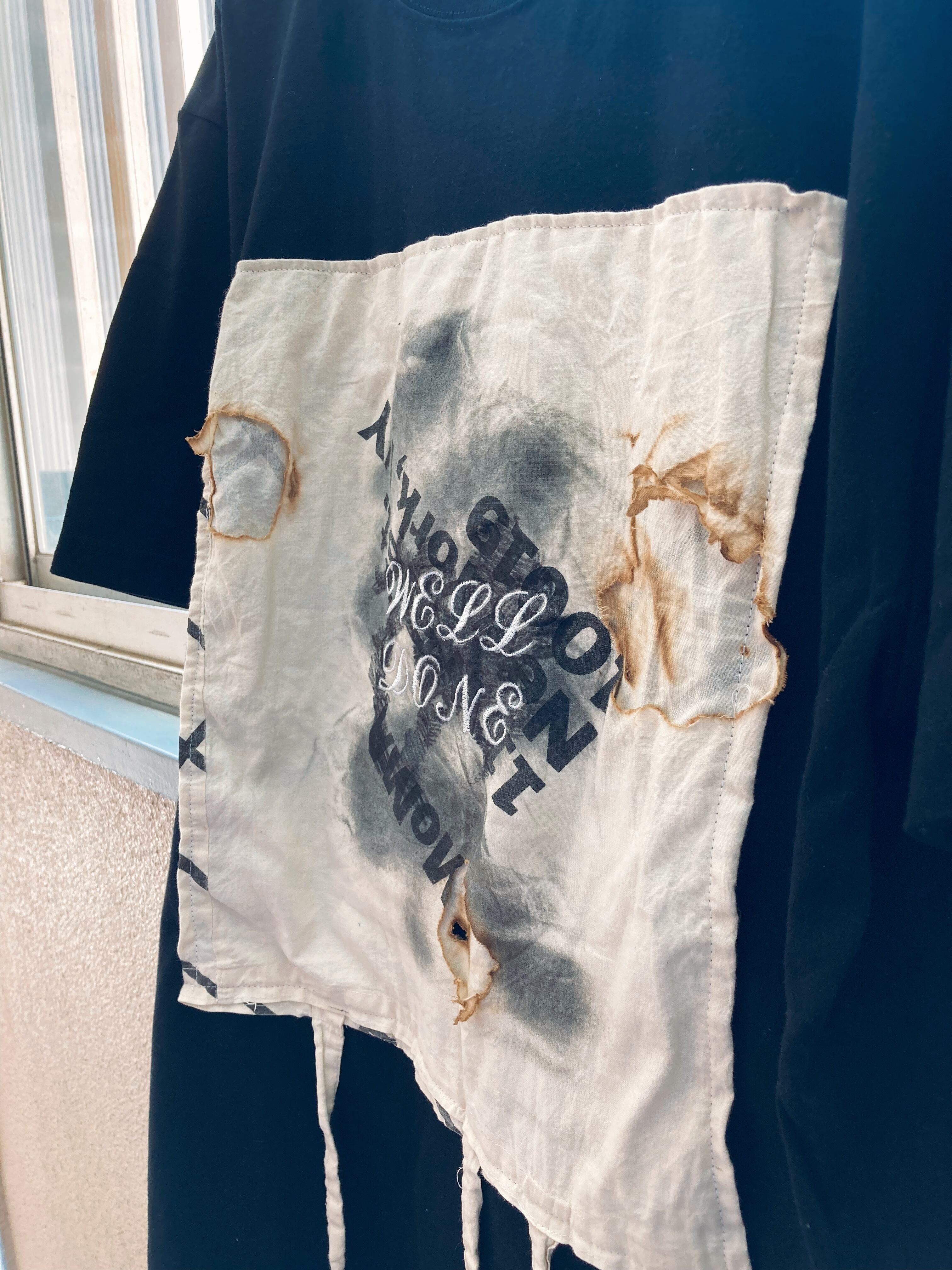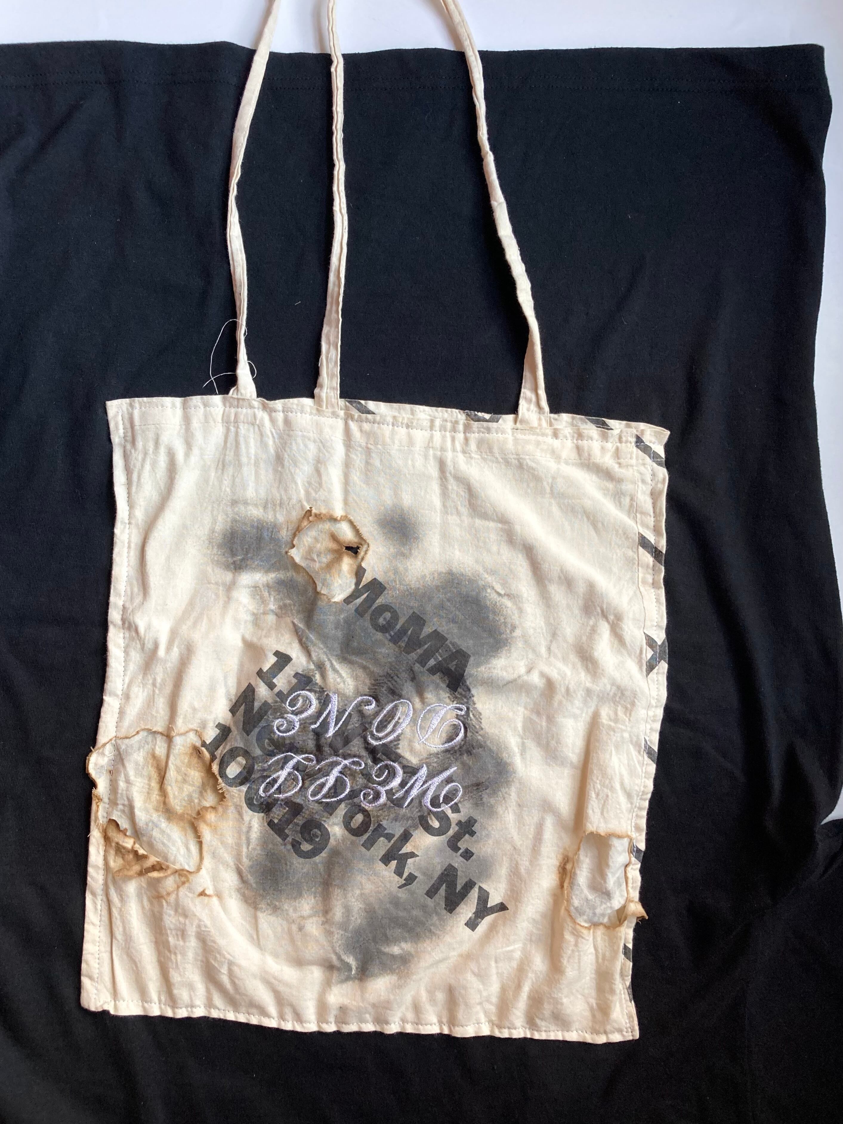 エコバッグは実際に使用したモノを燃やしました。“エコバッグ”の名の下にこき使われるノベルティの布バッグ、たくさん使い込まれた上にさらに燃やされ、Tシャツにまで落とし込まれる彼らの運命に思いを馳せて、着ていただける方を探しております。