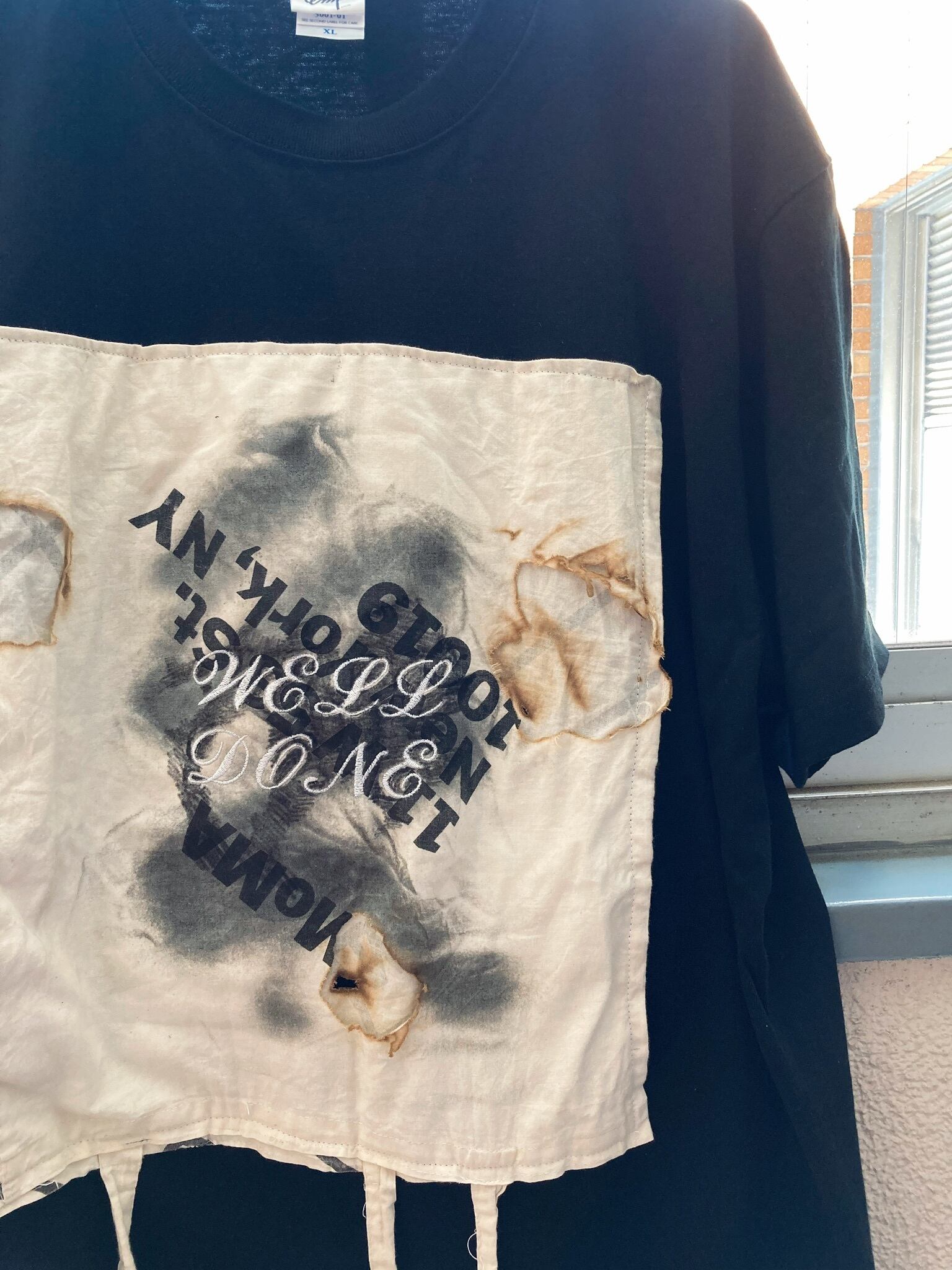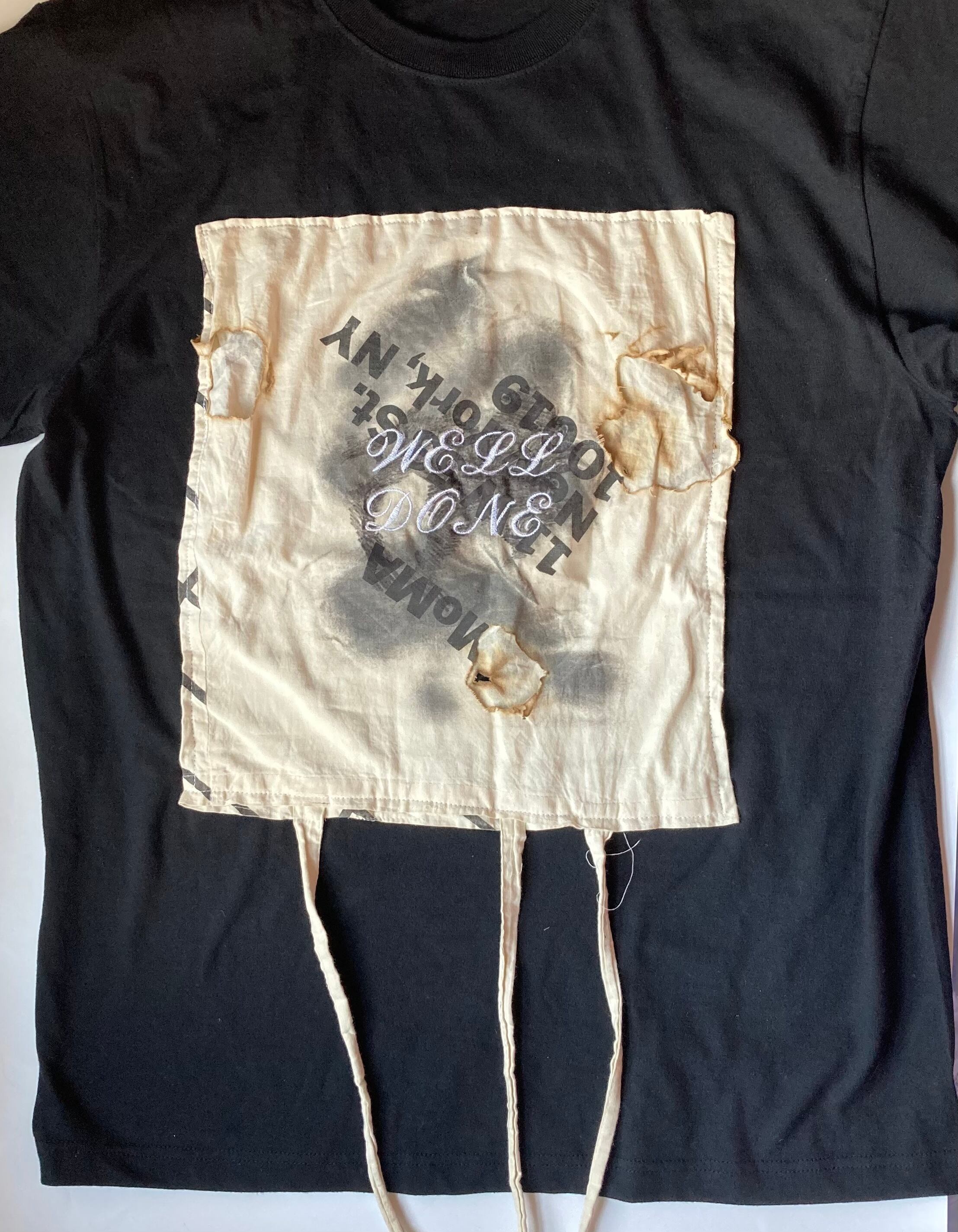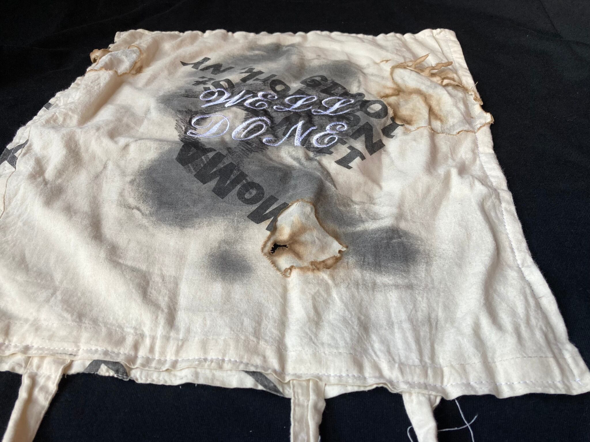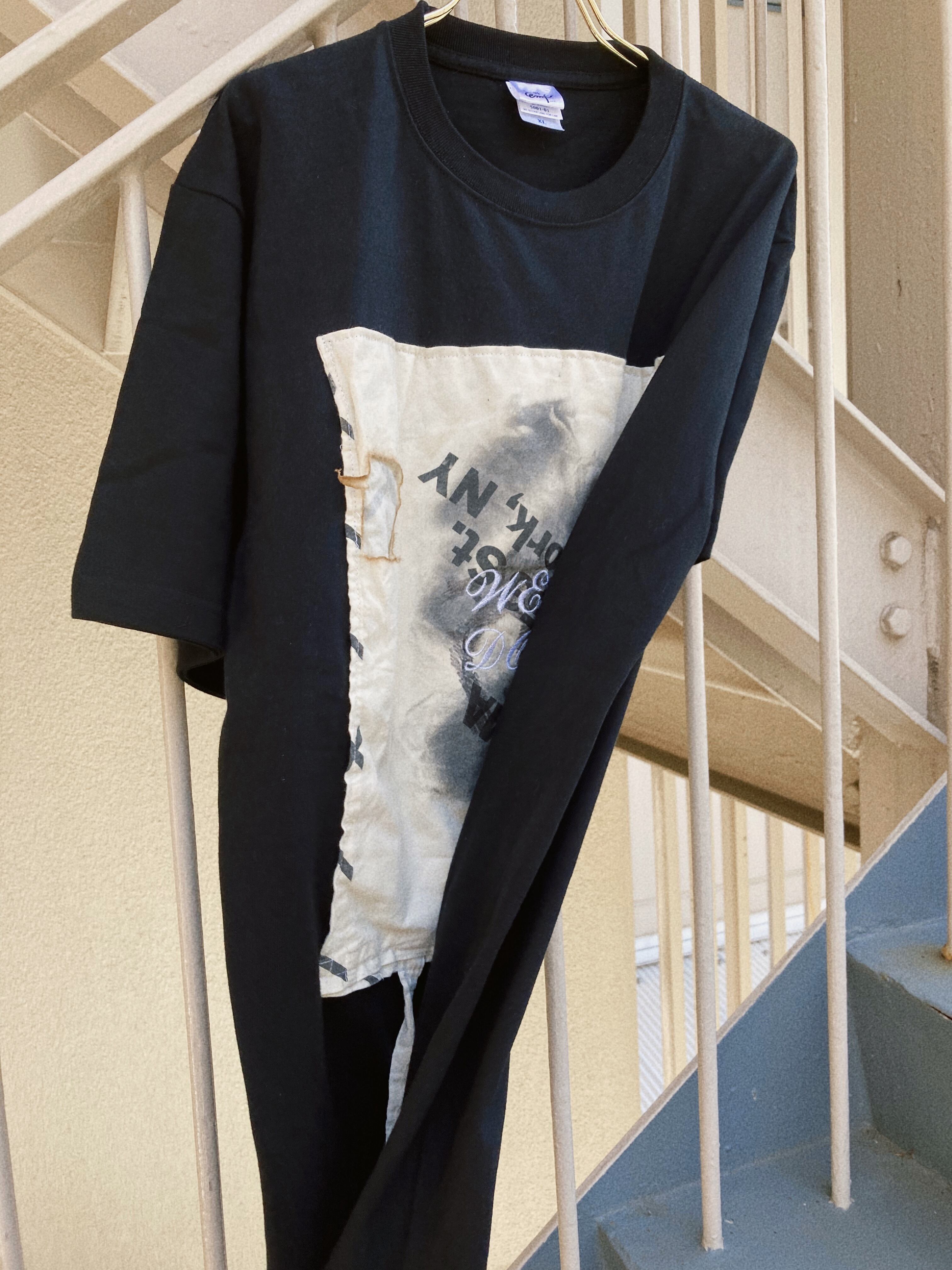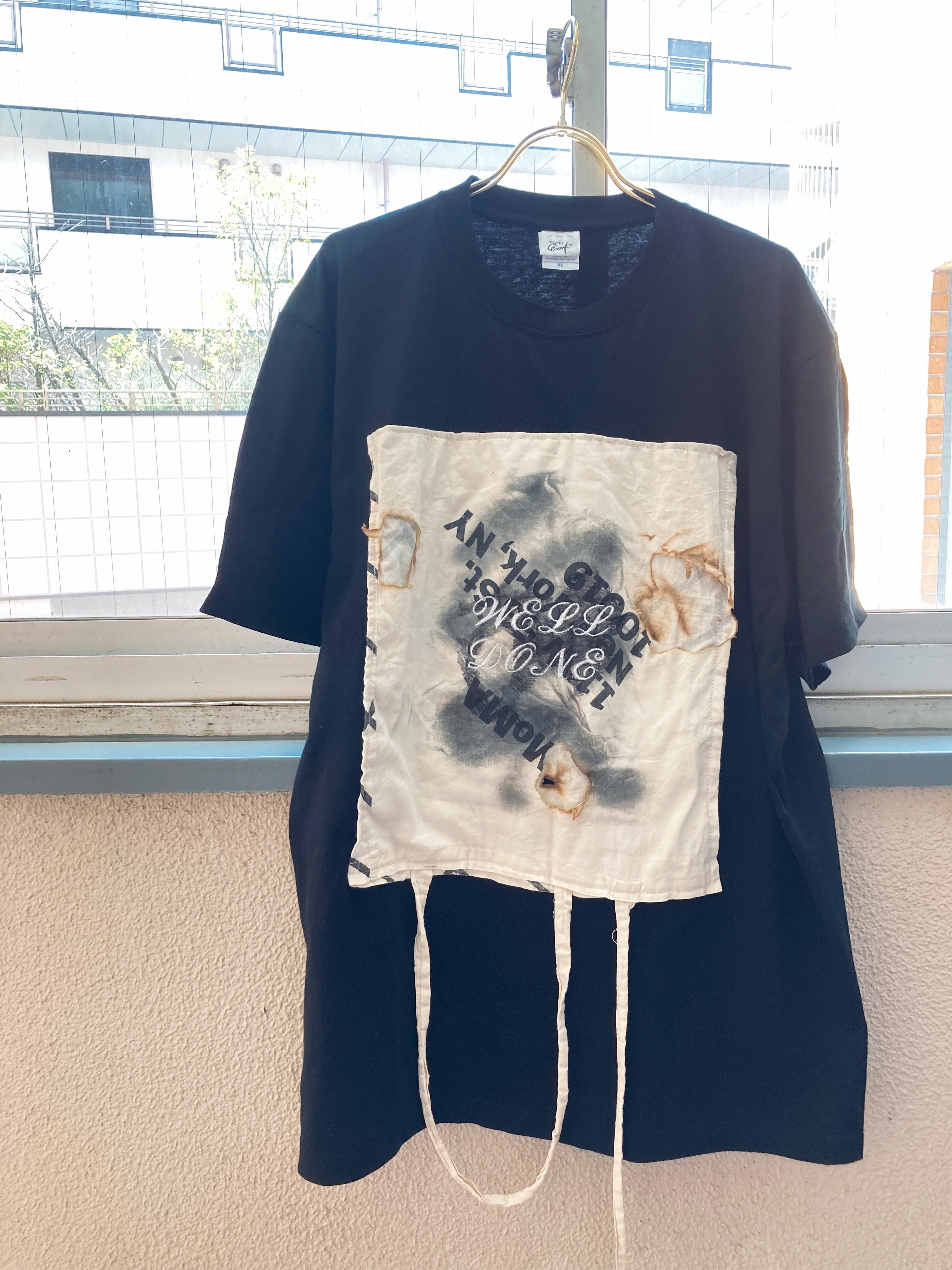 エコバッグは実際に使用したモノを燃やしました。“エコバッグ”の名の下にこき使われるノベルティの布バッグ、たくさん使い込まれた上にさらに燃やされ、Tシャツにまで落とし込まれる彼らの運命に思いを馳せて、着ていただける方を探しております。