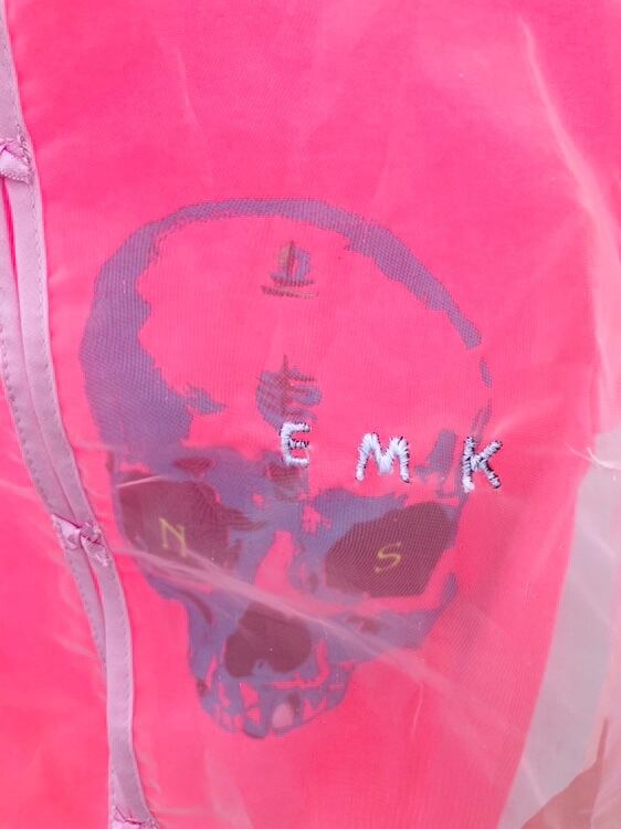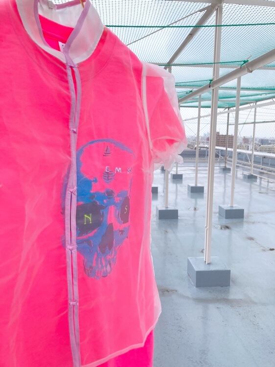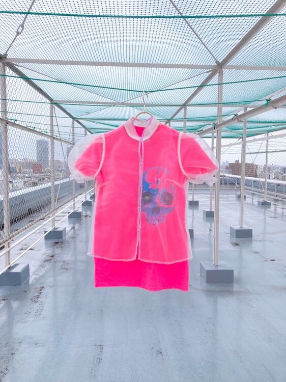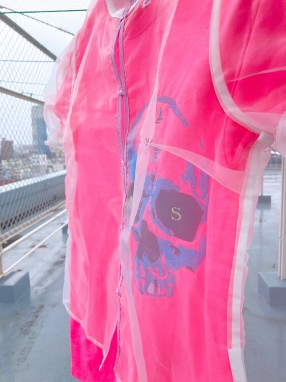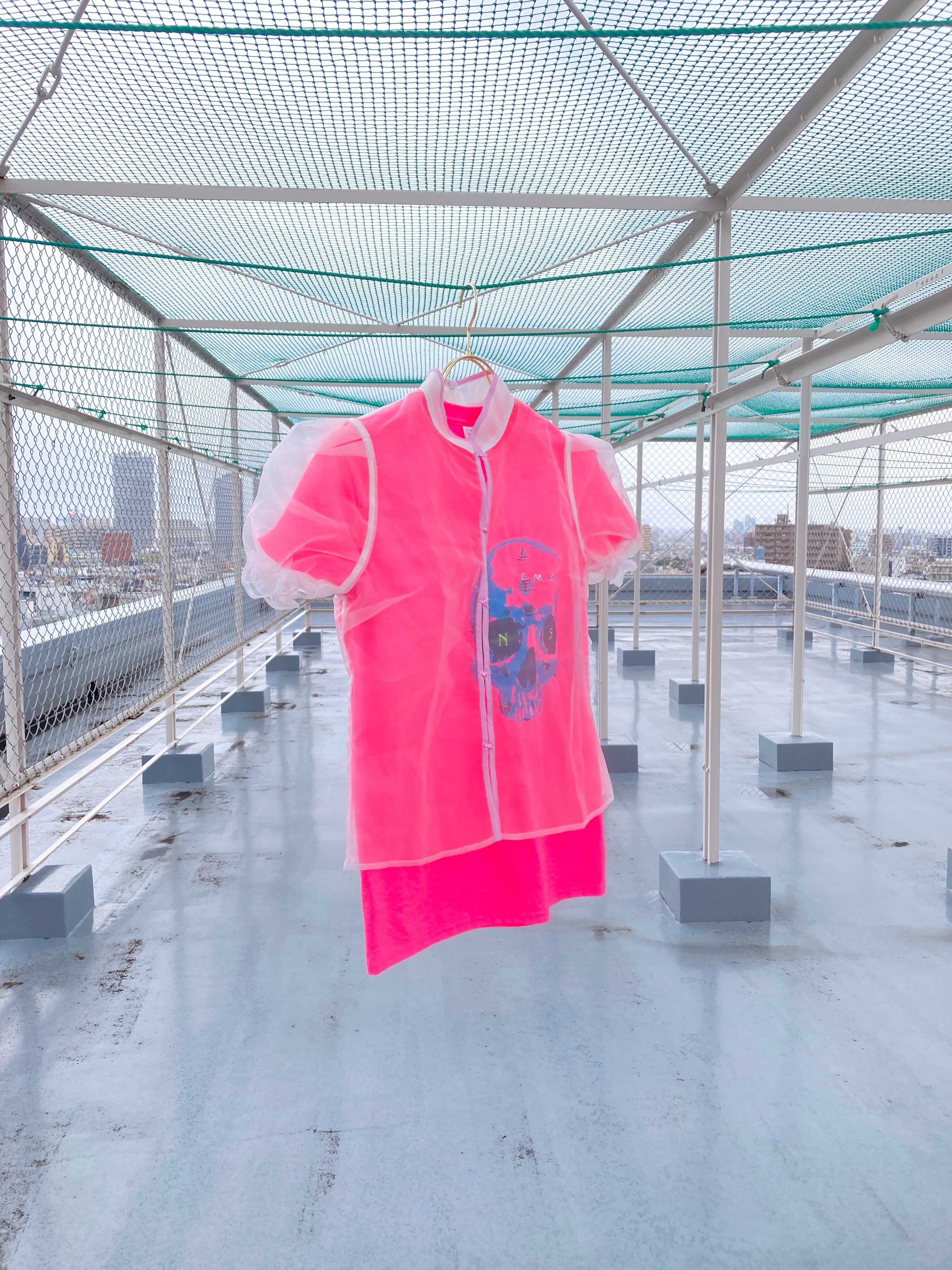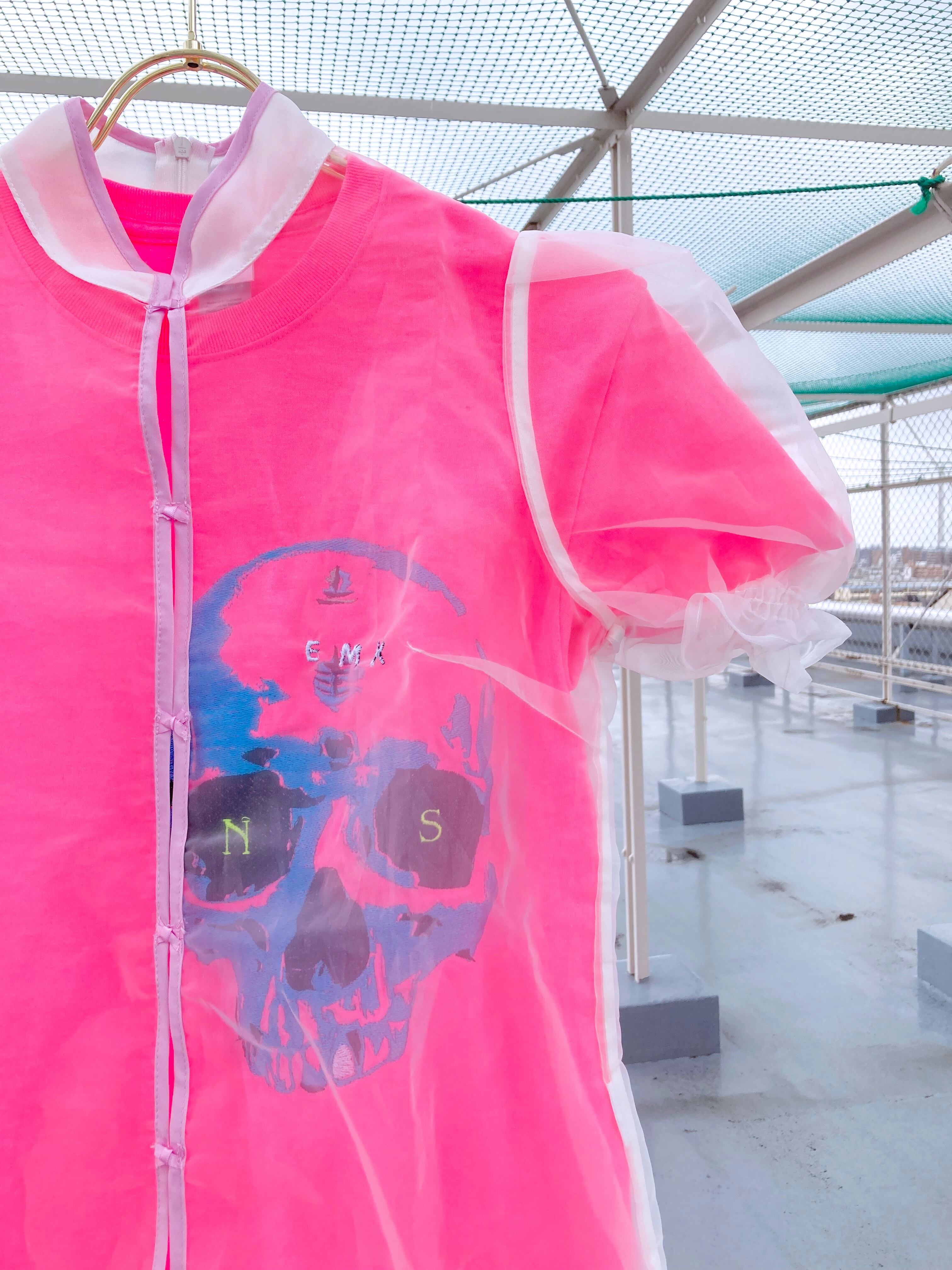スカルの顔が大きく刺繍された蛍光ピンクのTシャツに、可愛らしいシアートップスを重ねて。