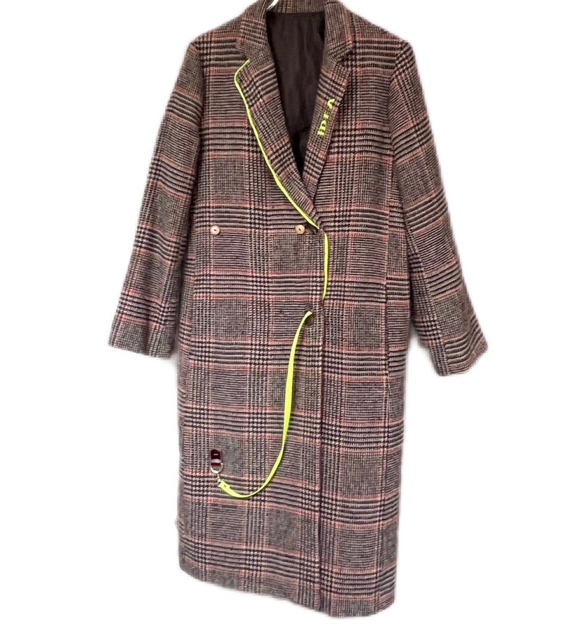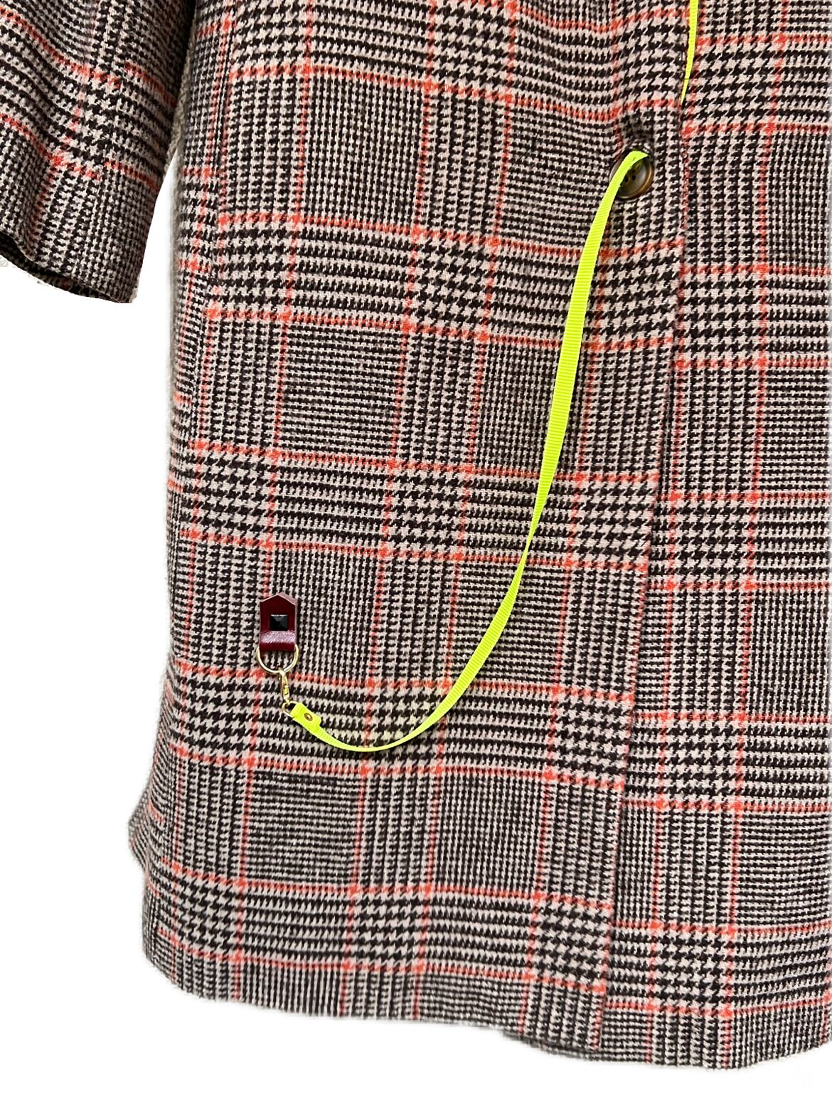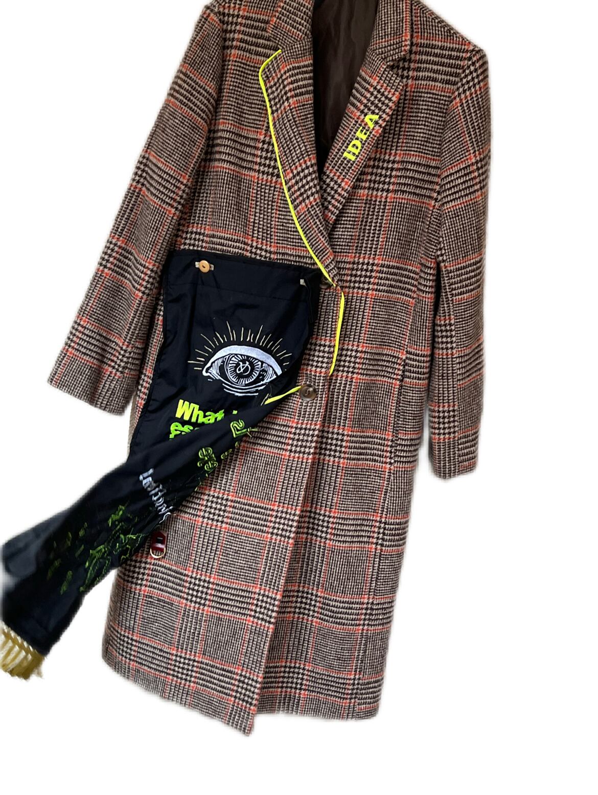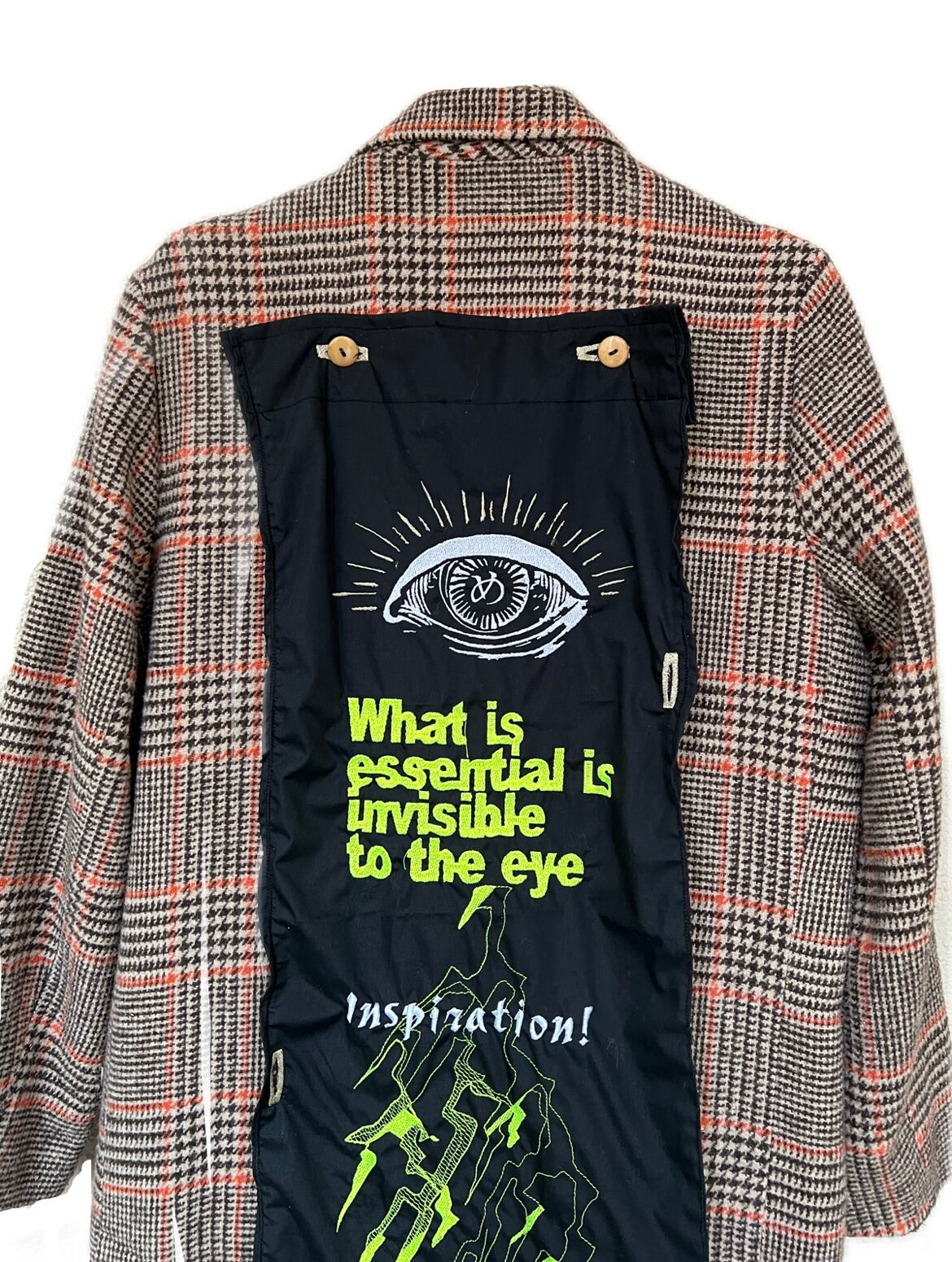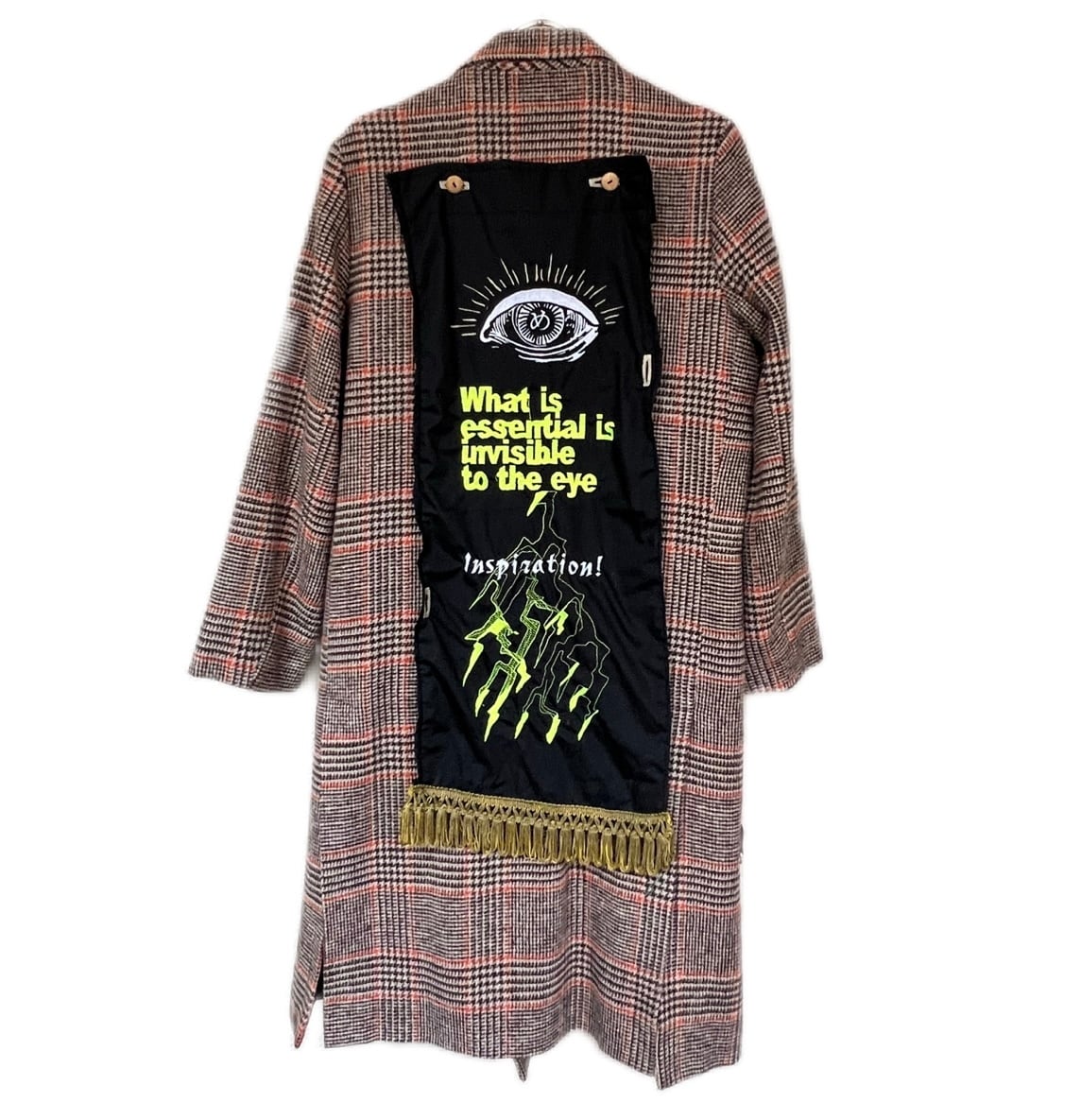 大きなタペストリーのようなファブリックが装飾されたチェック柄コート。ファブリックはボタンにより取り外し可能、前面に付けたり背面に付けたり印象が変わります。おメメの下には“大切なものは目に見えない”と刺繍されています。