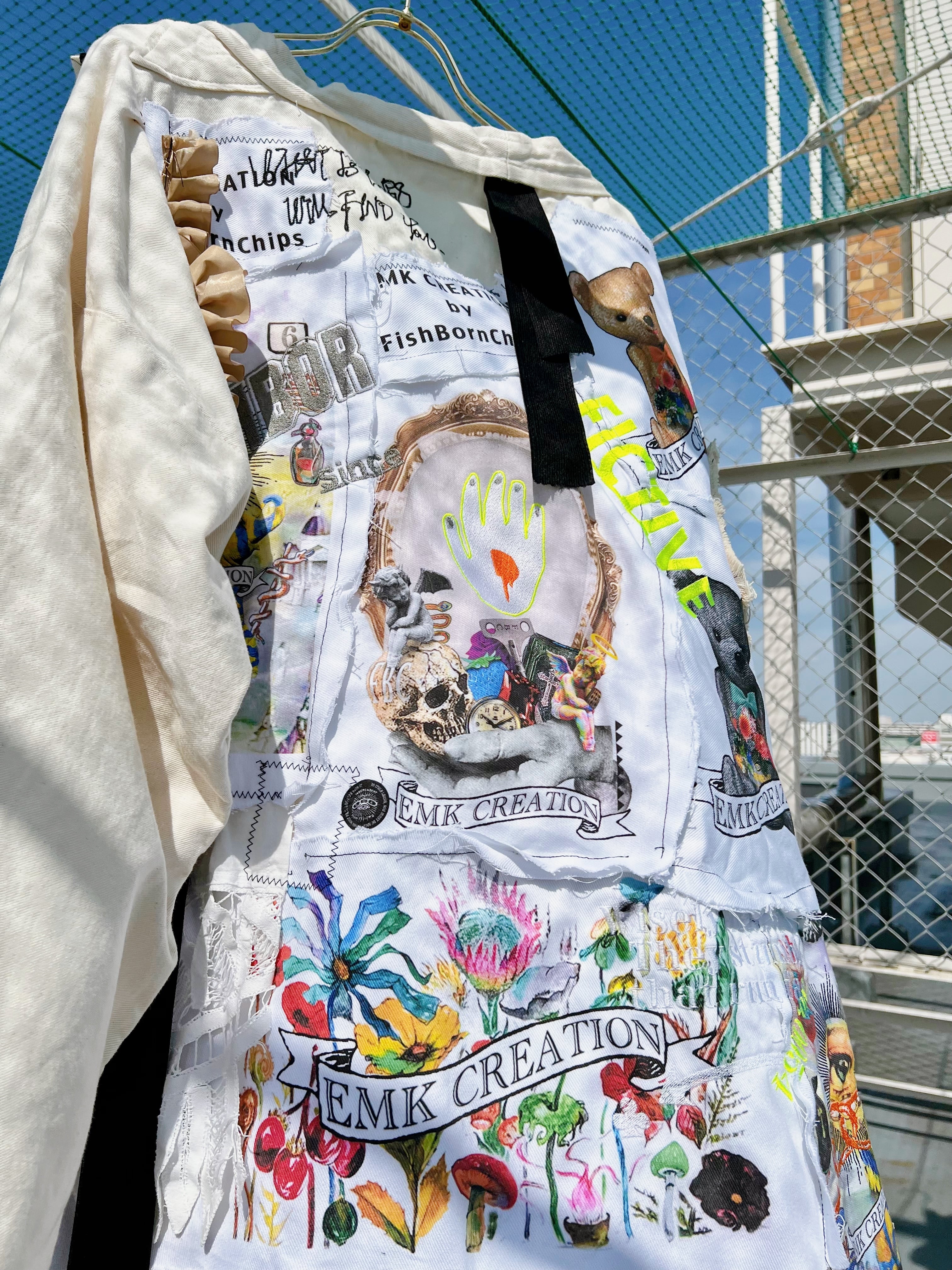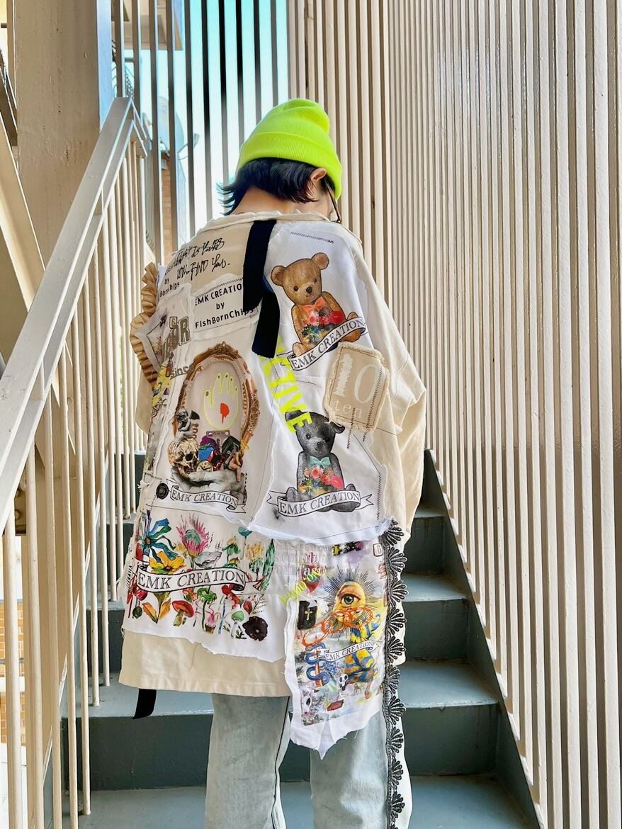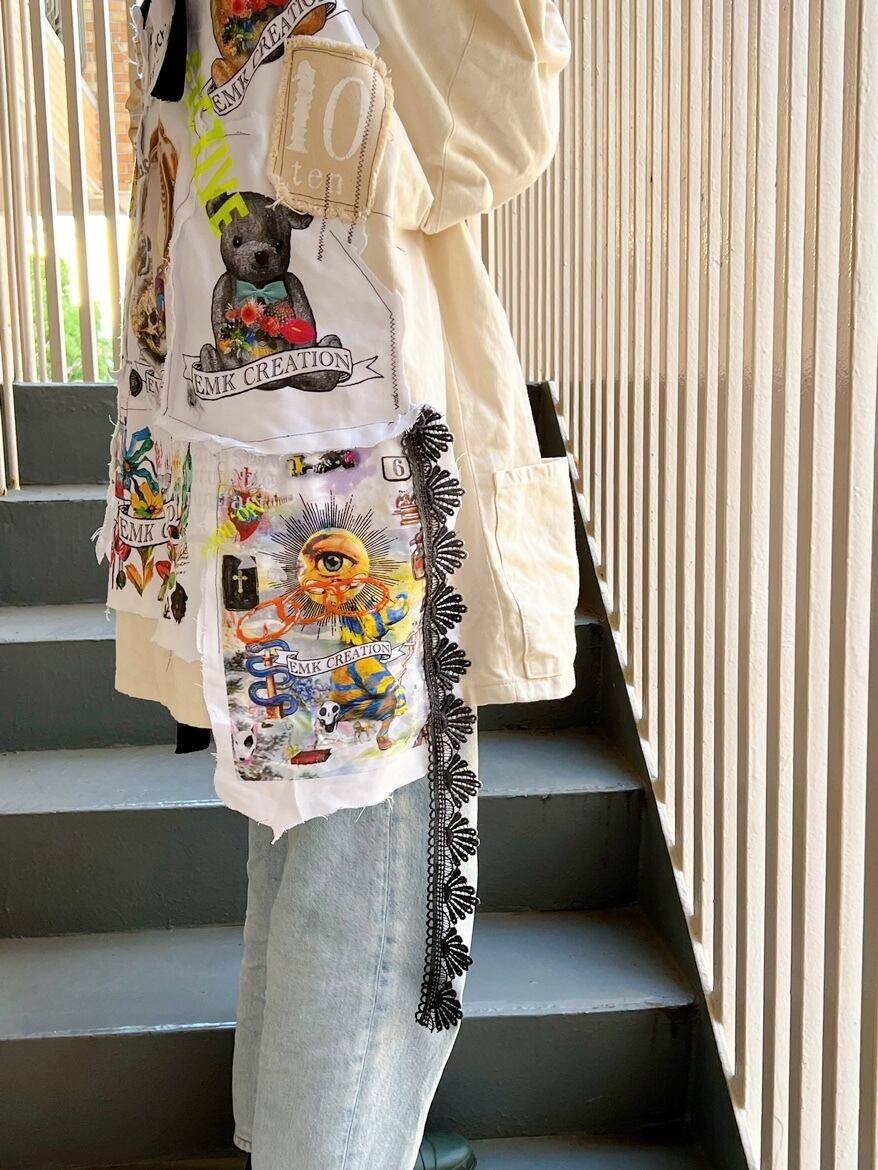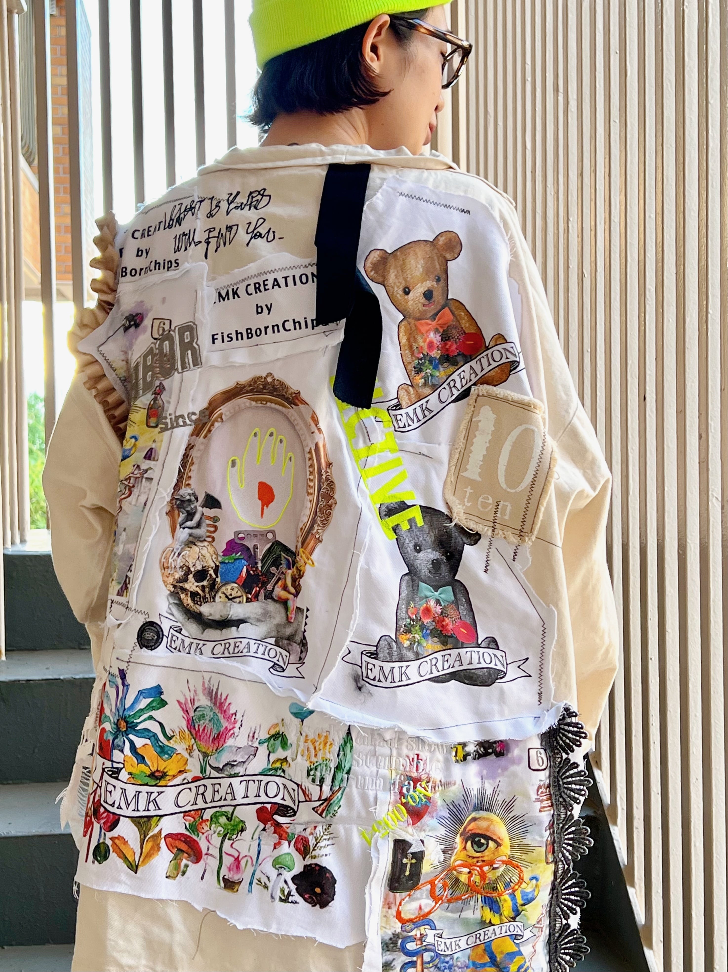 ハンドペイント等で描いた絵をファブリックにプリント、さらにコラージュしてジャケットに装飾し、上から刺繍を施したスペシャルな一品。