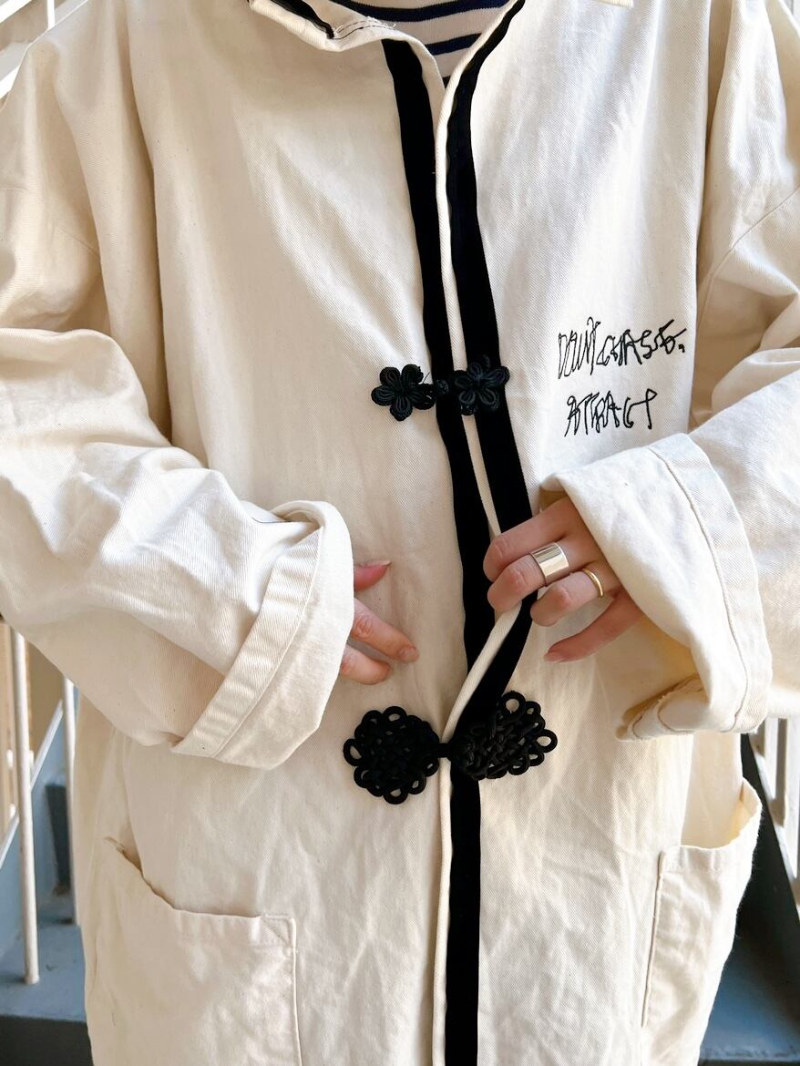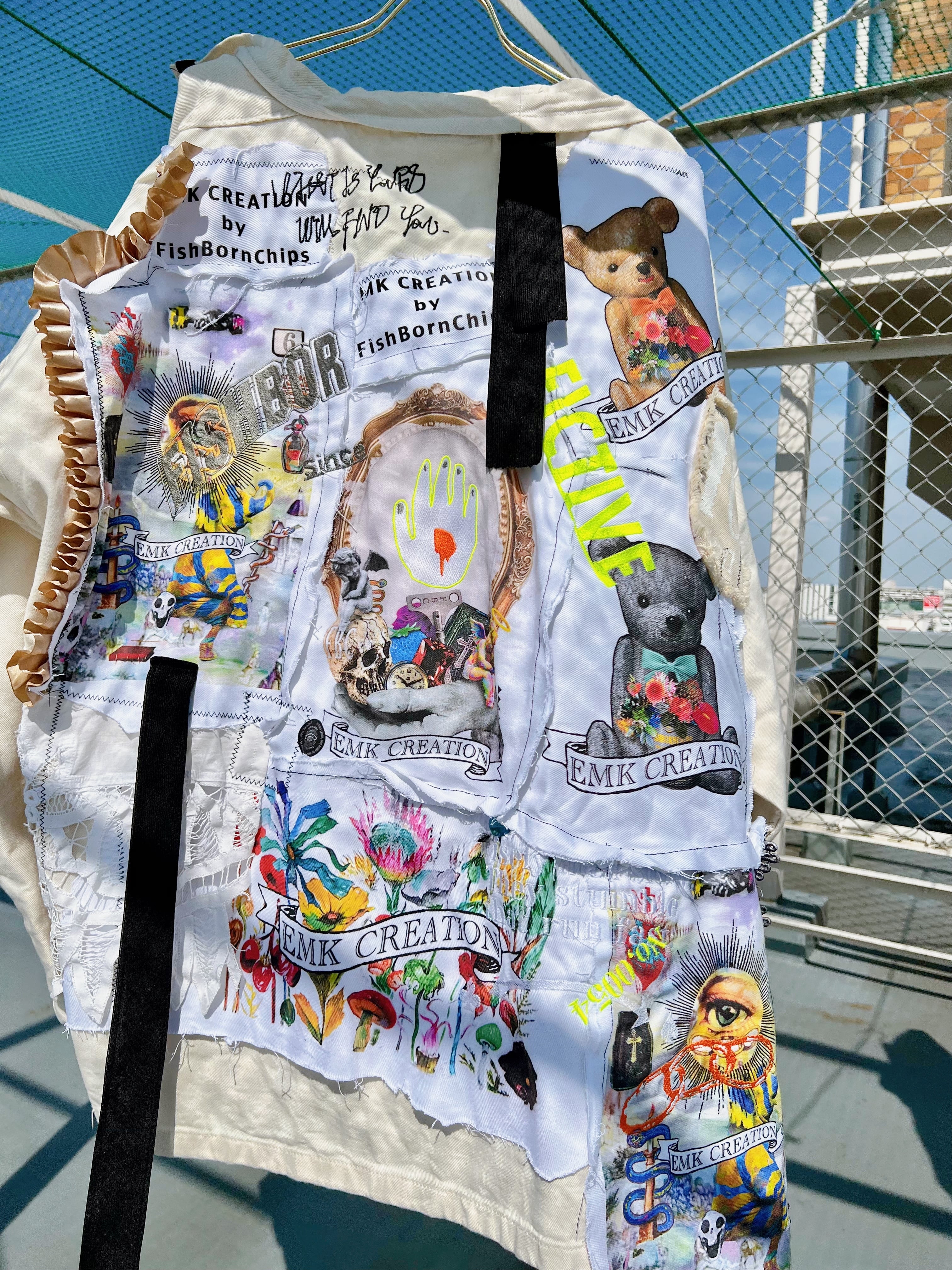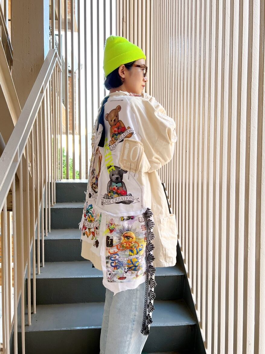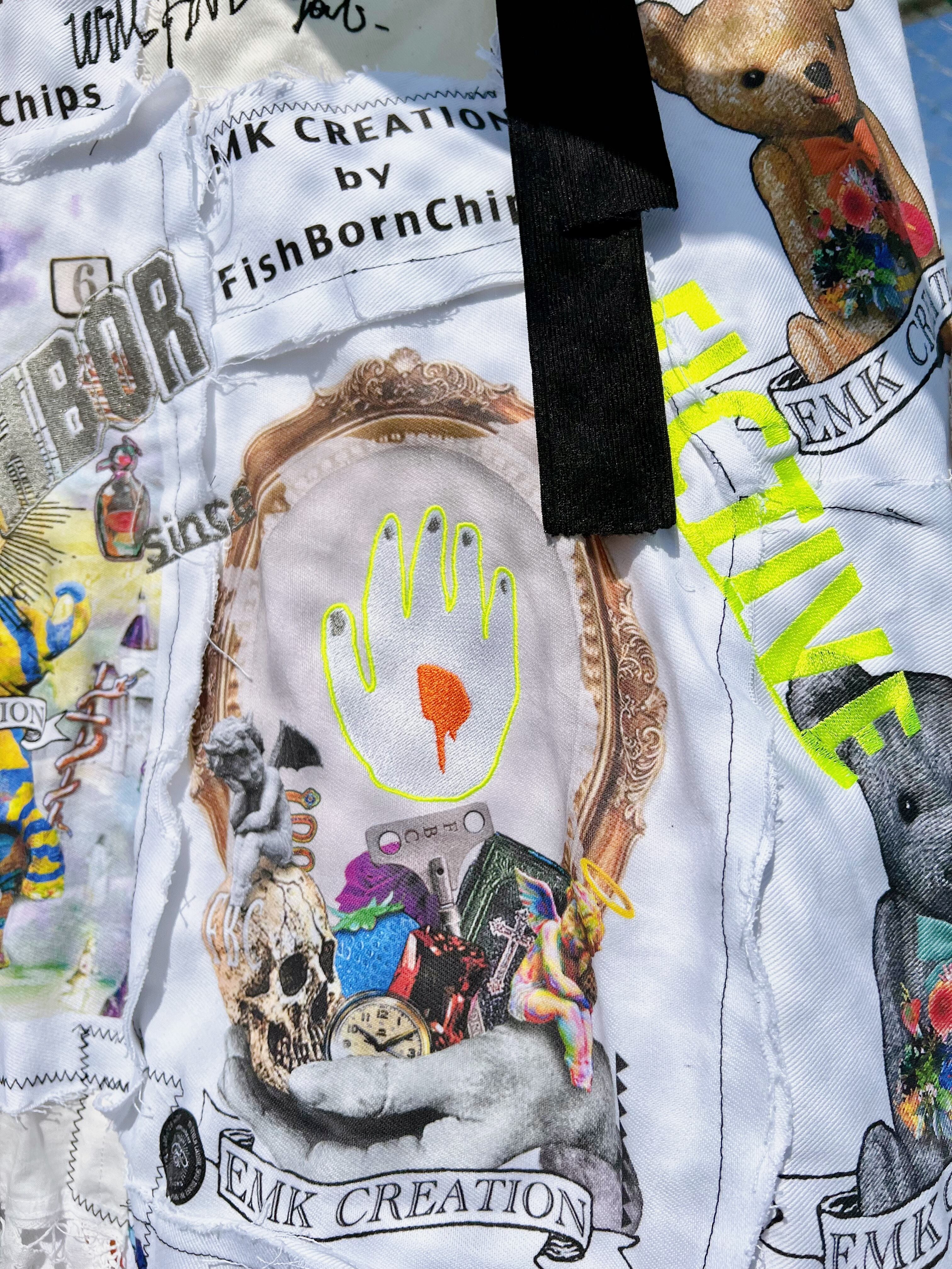 ハンドペイント等で描いた絵をファブリックにプリント、さらにコラージュしてジャケットに装飾し、上から刺繍を施したスペシャルな一品。