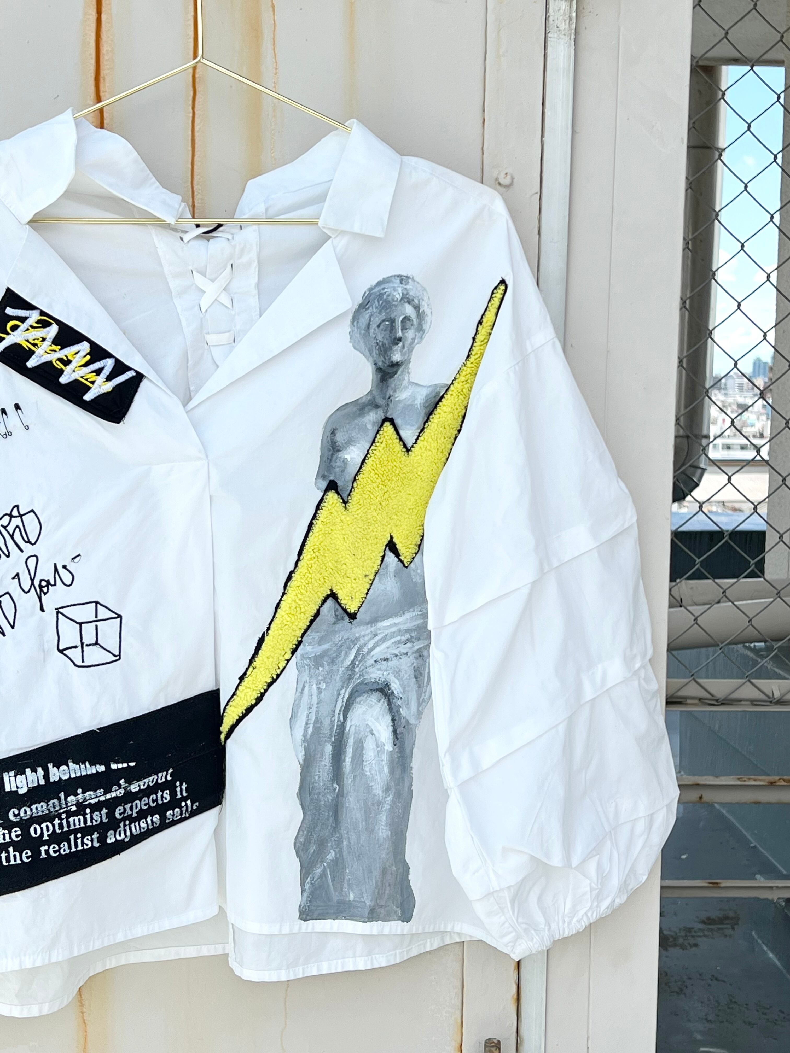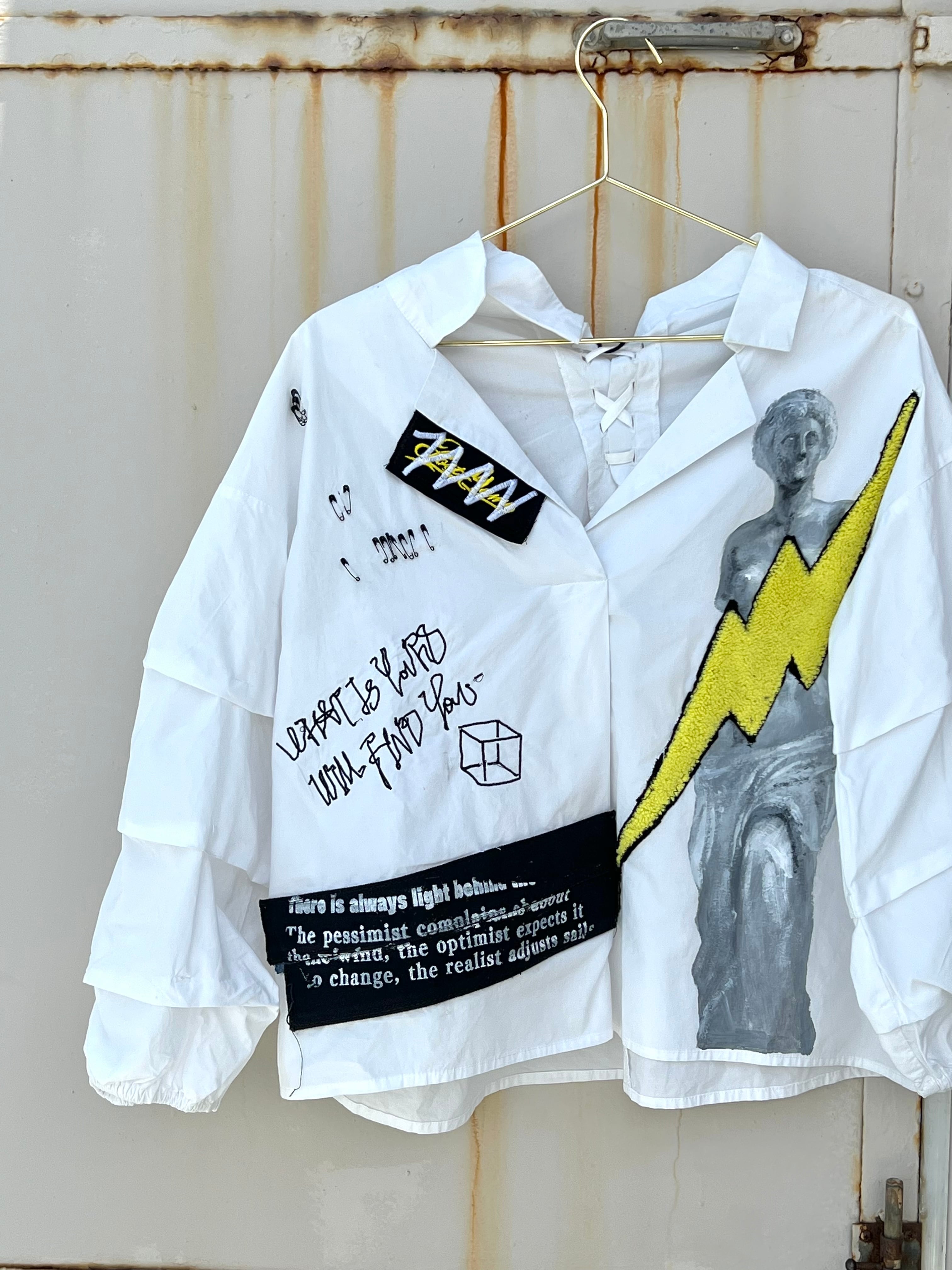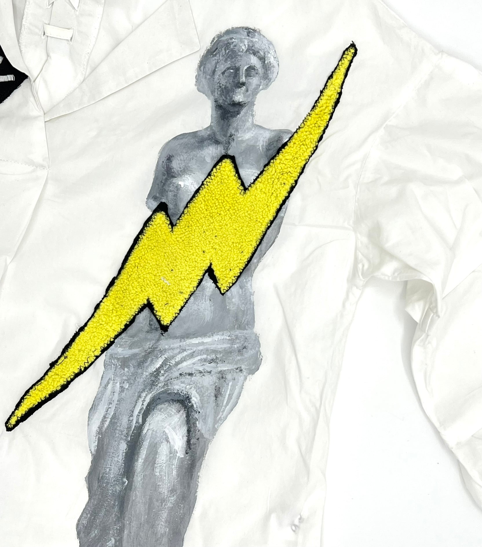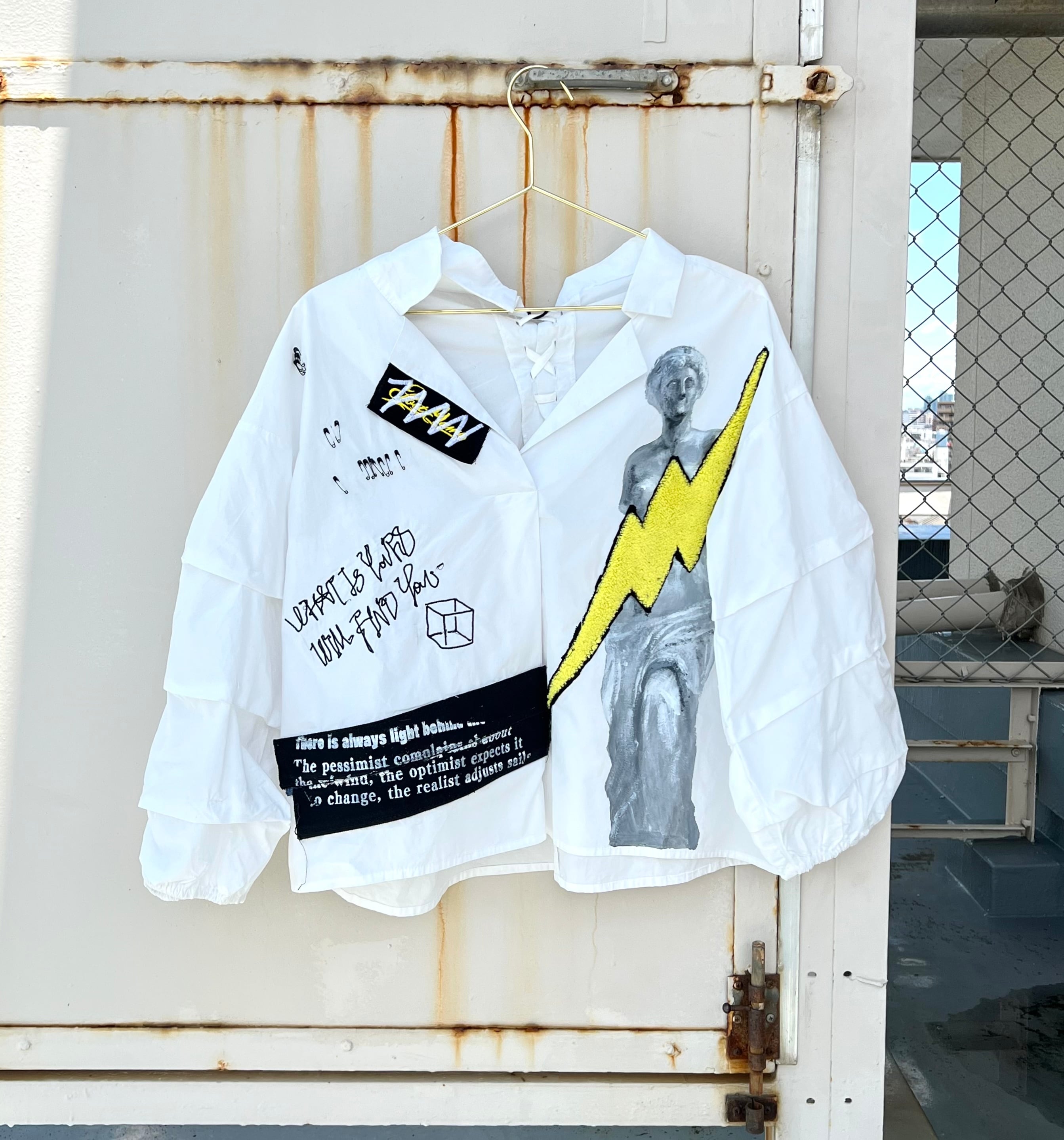 ミロのヴィーナスをハンドペイントした開襟シャツに稲妻のワッペンや安全ピン、オリジナル刺繍を施した盛りだくさんなデザイン。