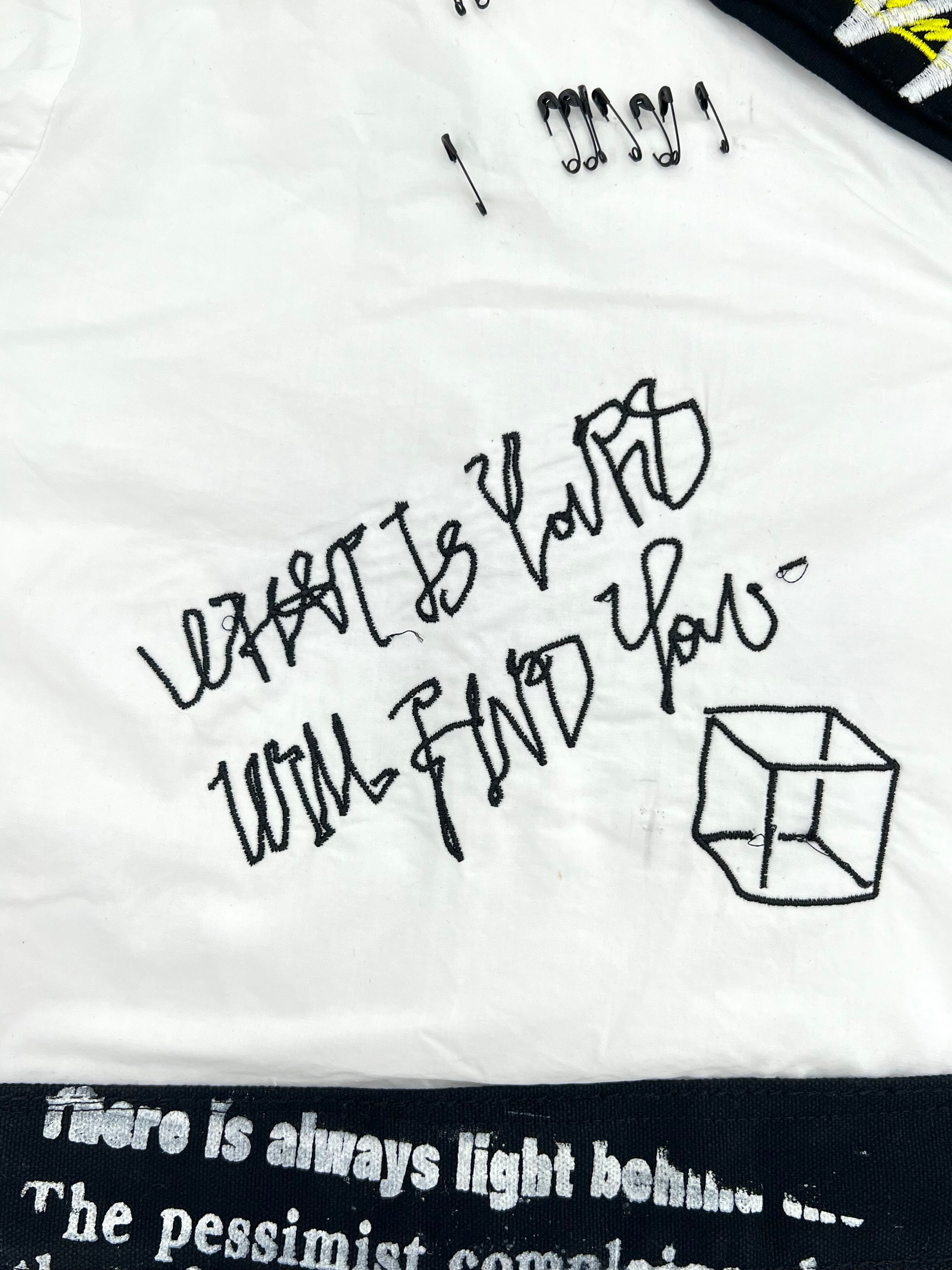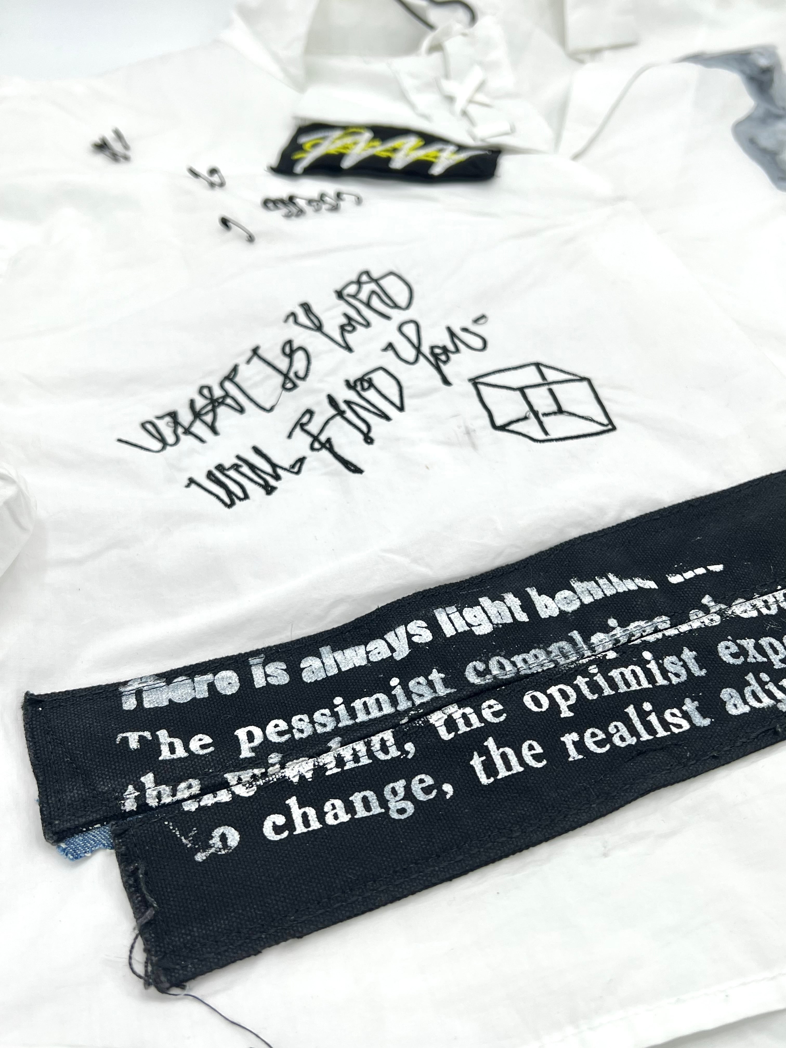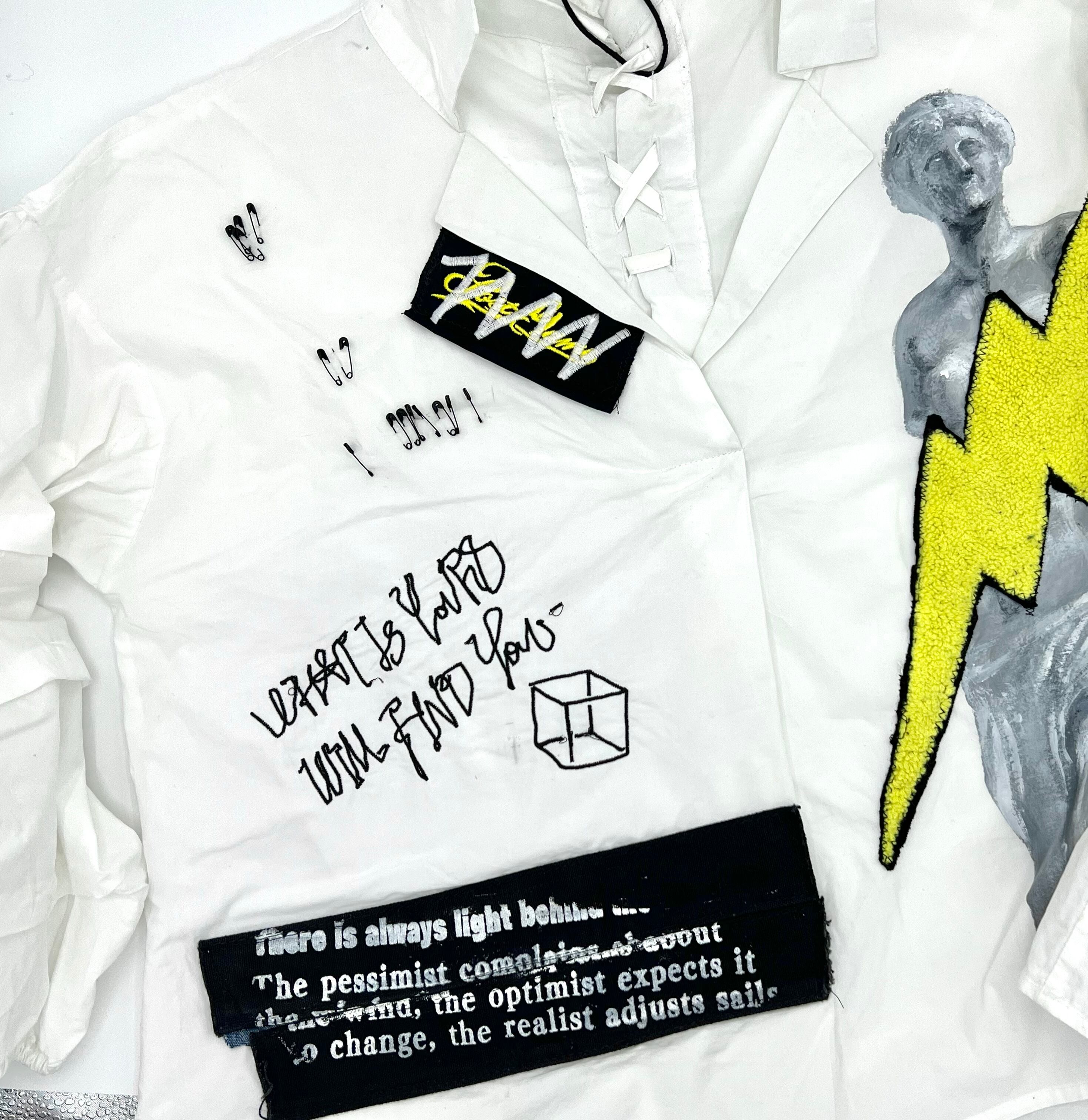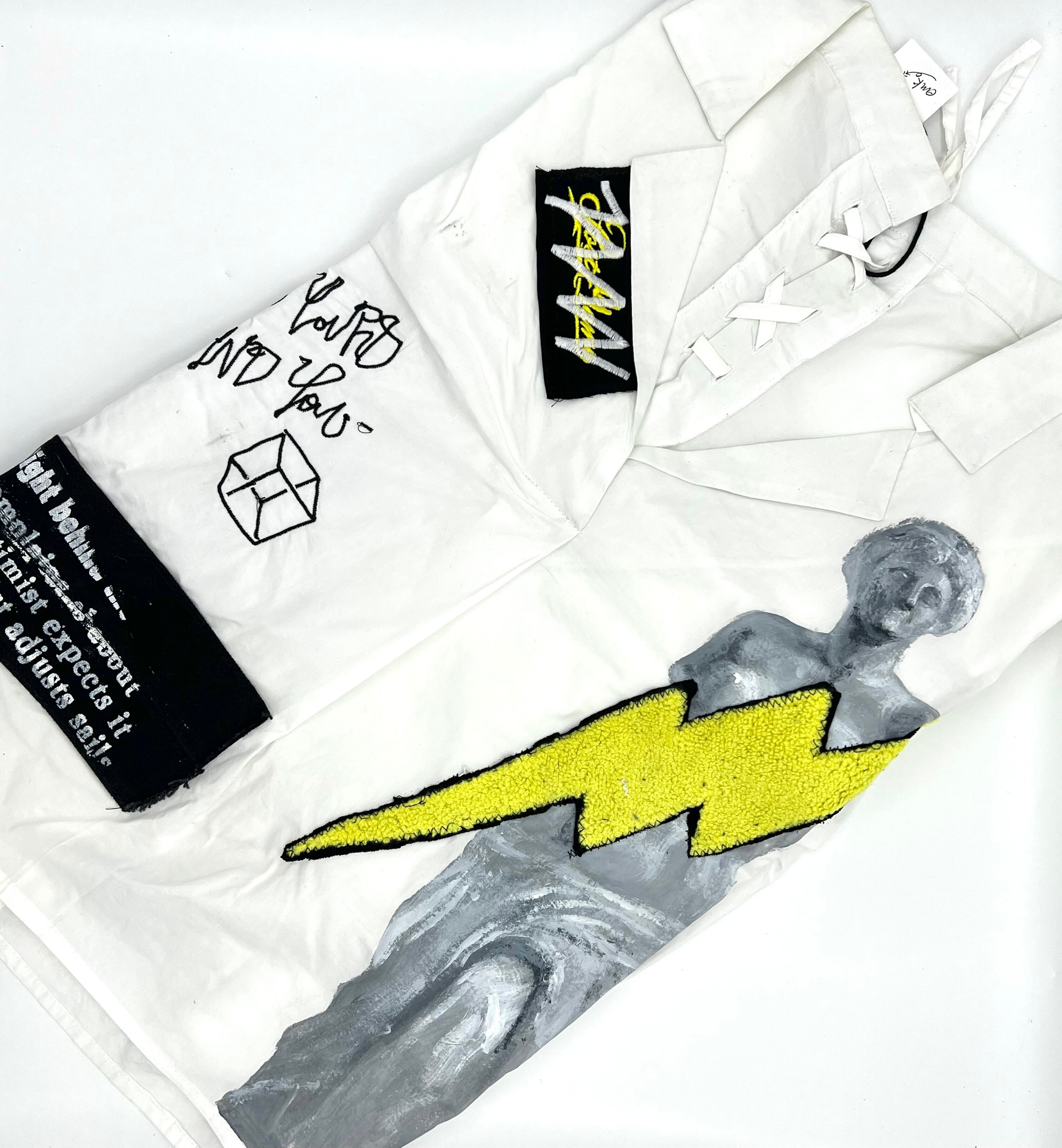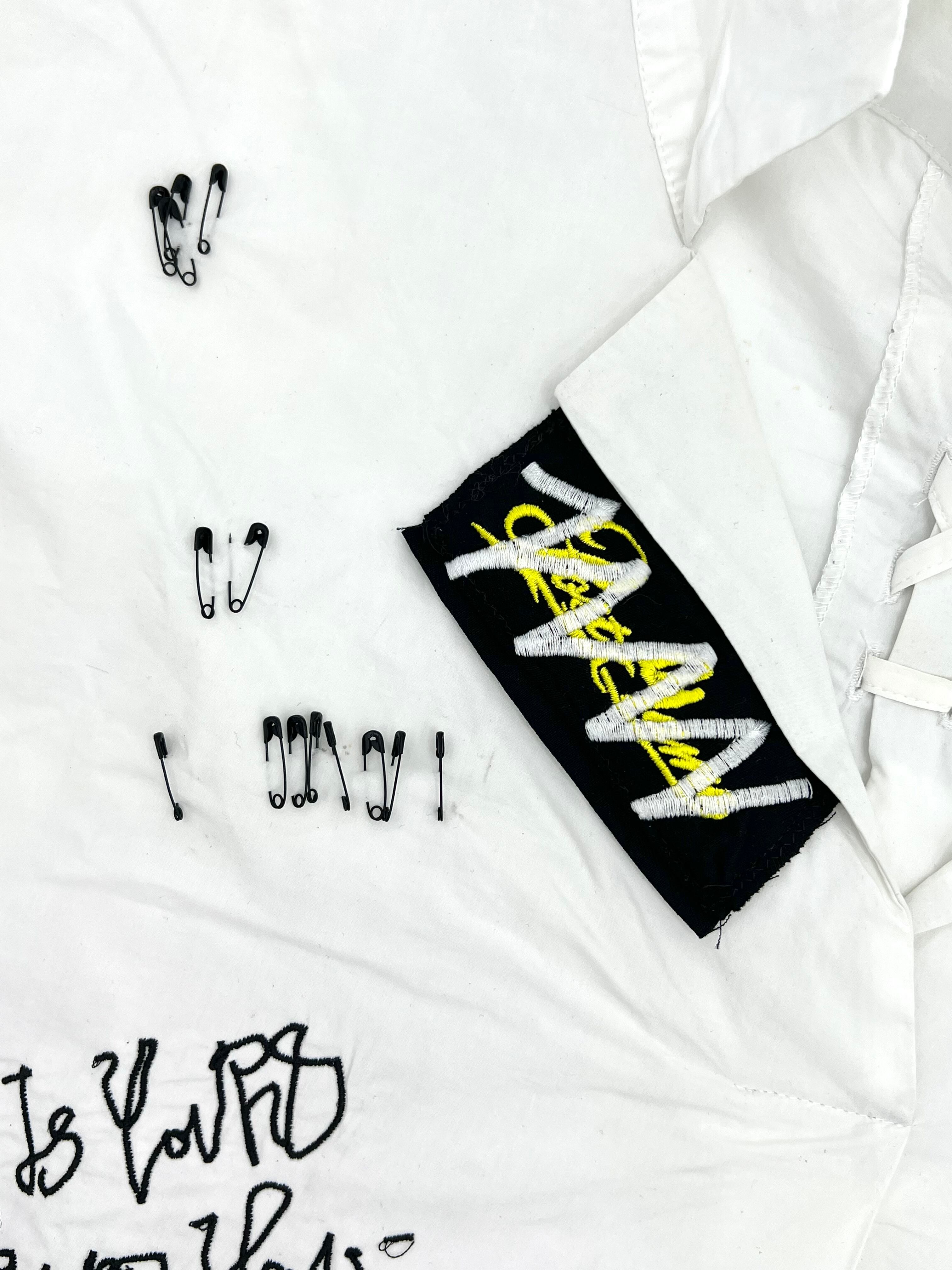 ミロのヴィーナスをハンドペイントした開襟シャツに稲妻のワッペンや安全ピン、オリジナル刺繍を施した盛りだくさんなデザイン。