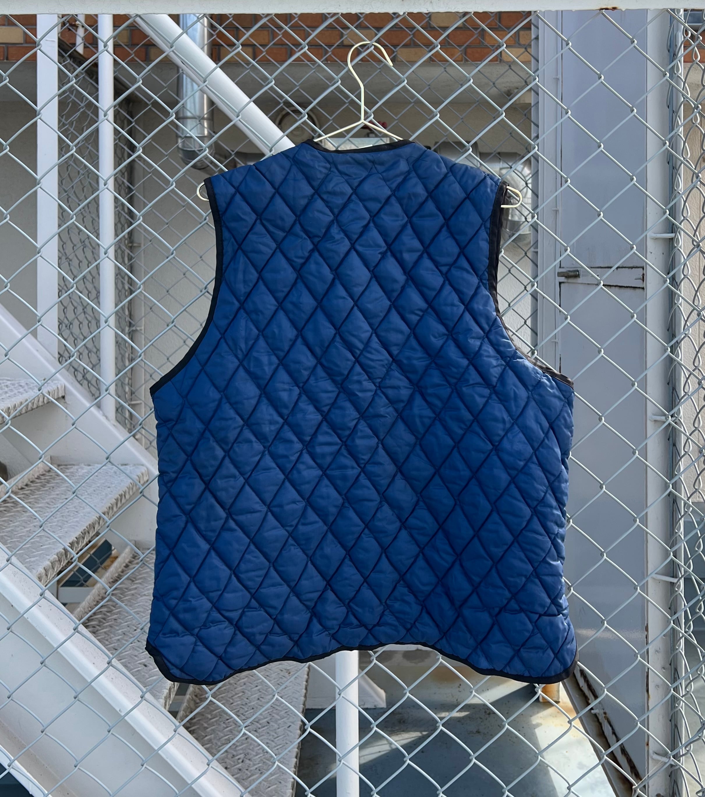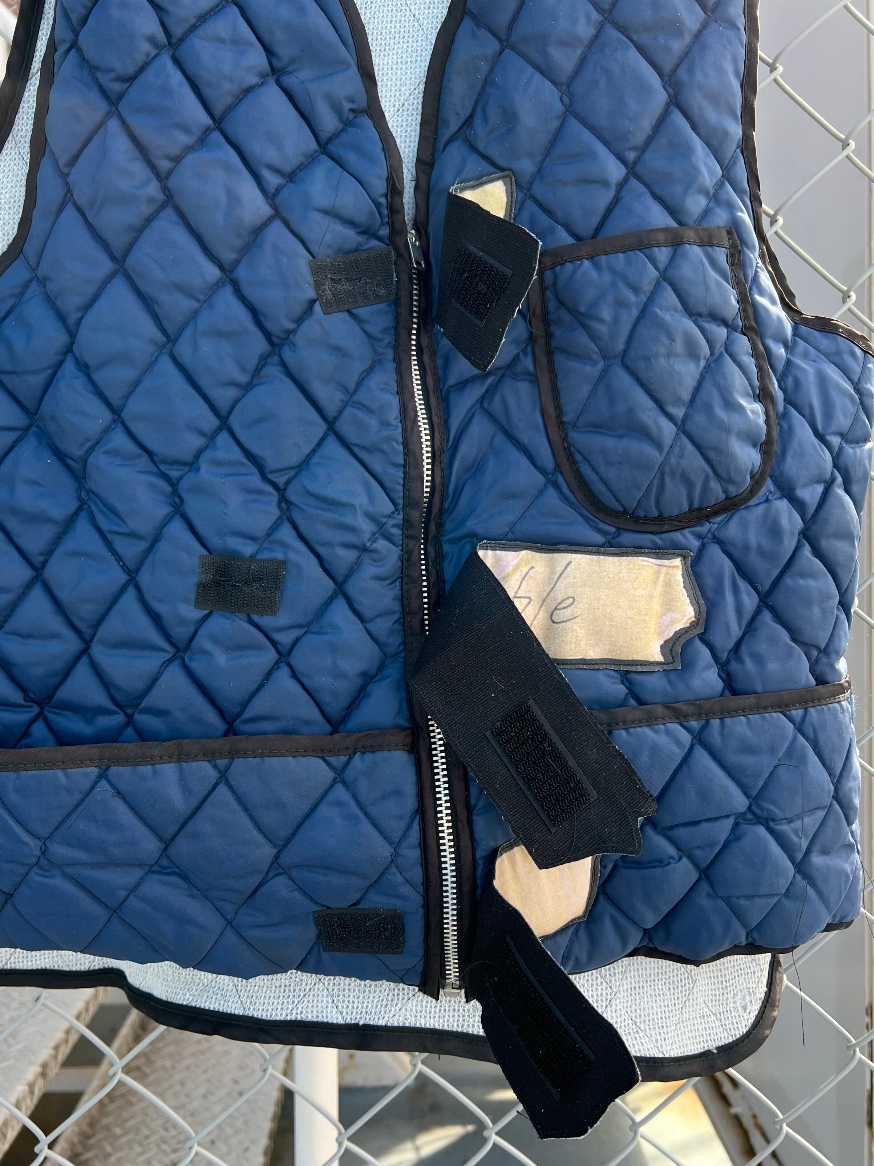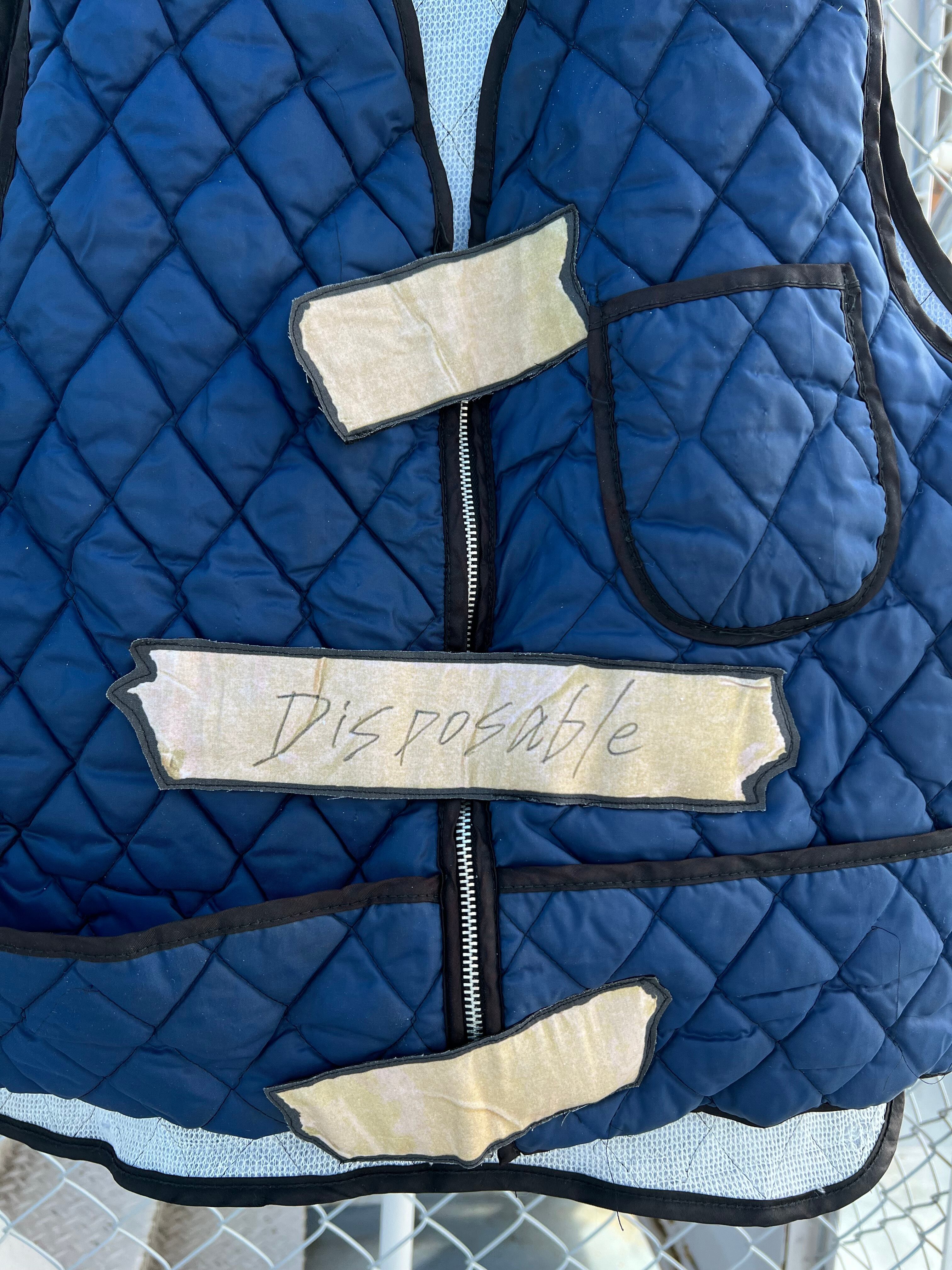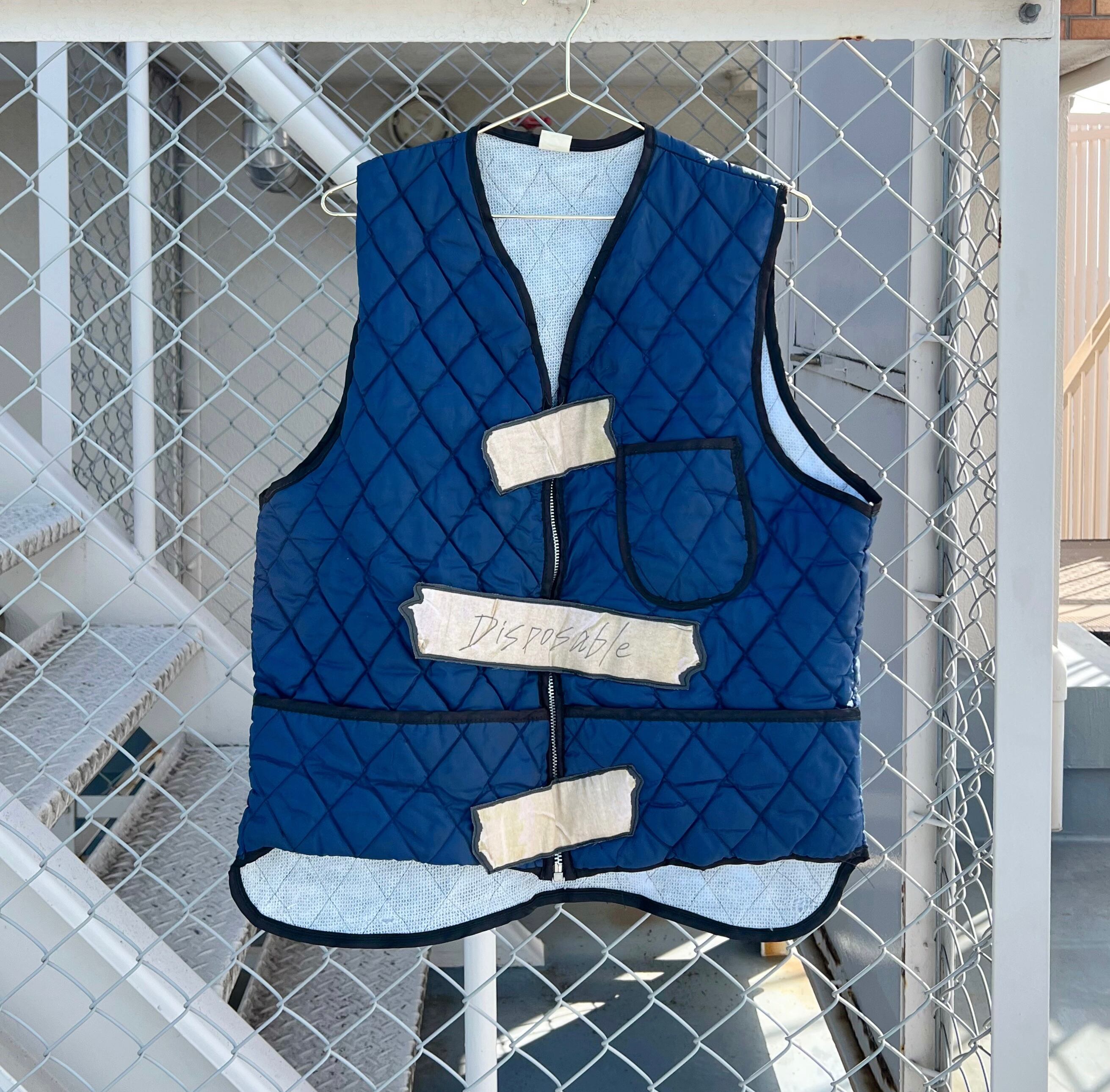 ガムテープ風のプリントが施されたファブリックが装飾されたベスト。マジックテープで止められる仕様にカスタムしています。